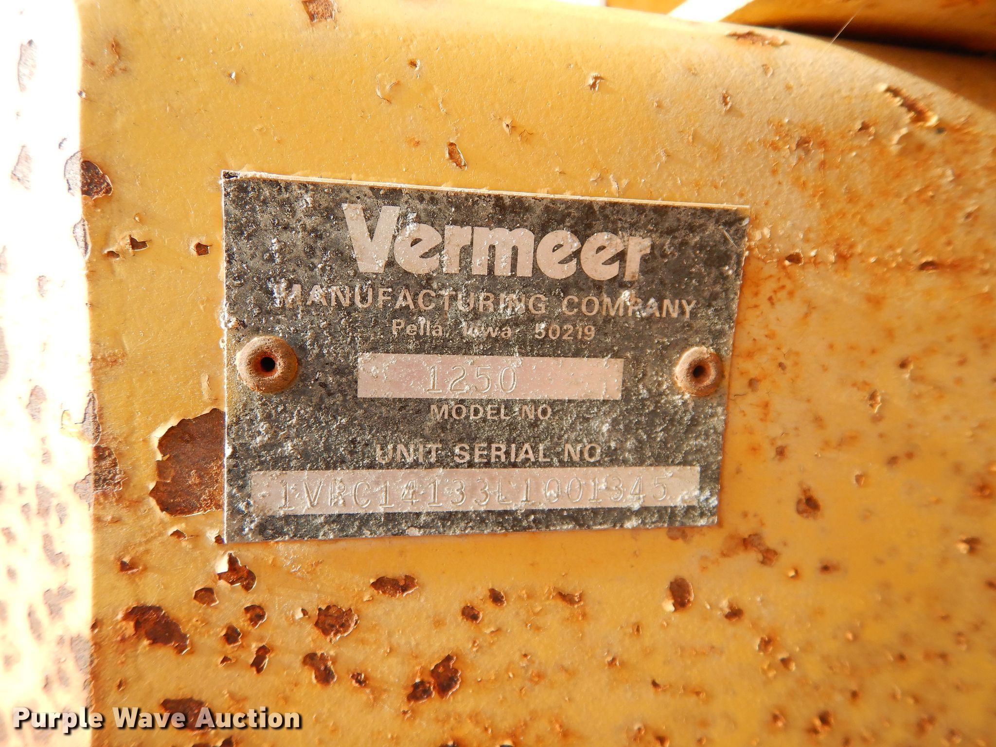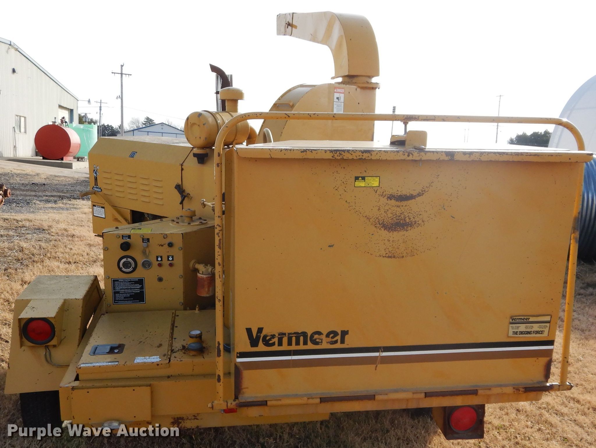 Purple Wave is selling a used Wood Chipper or Stump Grinder in Kansas. This item is a 1990 Vermeer BC1250 wood chipper with the following: 1,466 hours on meter, Ford CSG-6491-6007-YA six cylinder gas engine, Serial 11634K-07-TR, Rotating chute, 235/85R16 tires