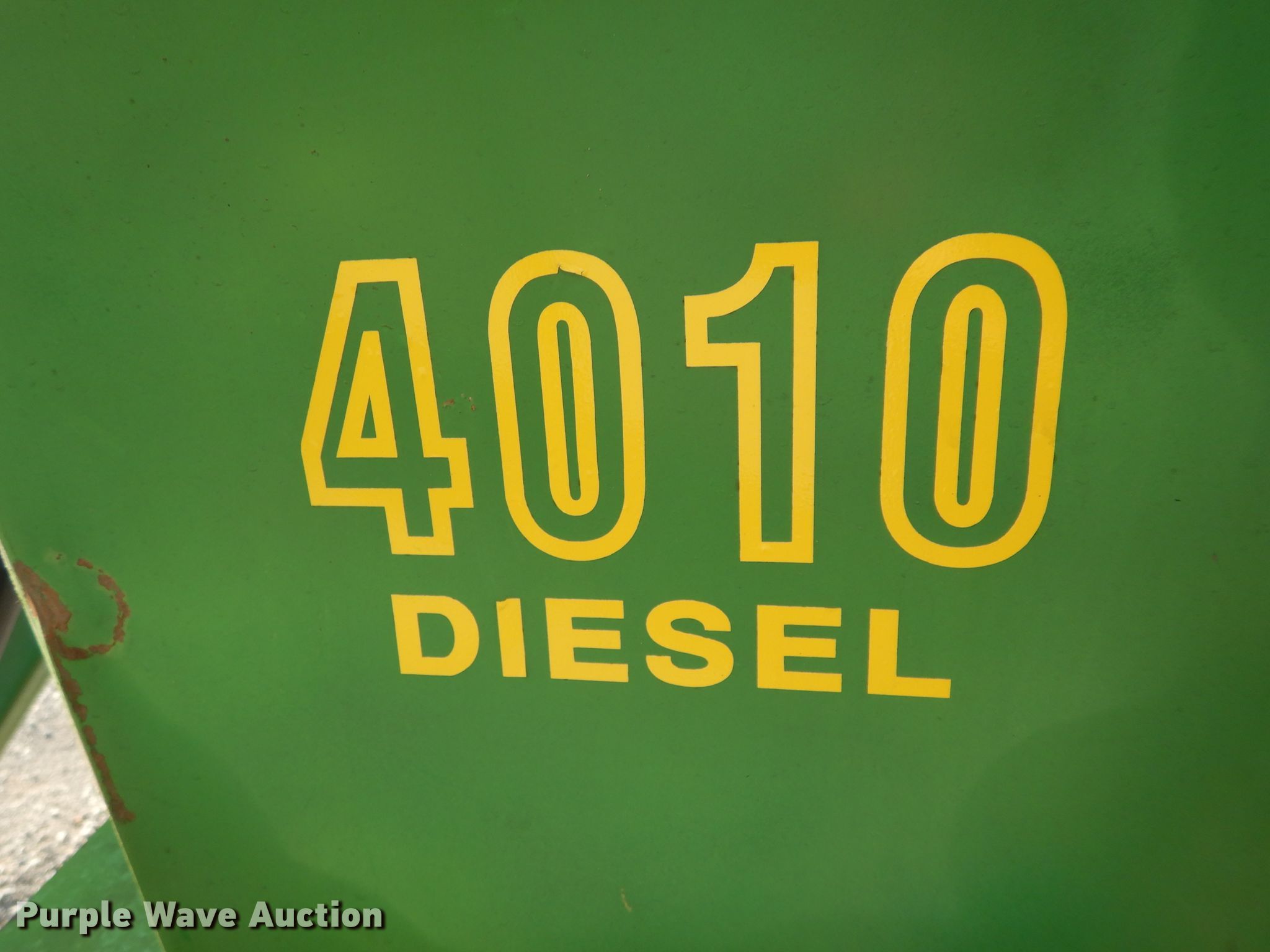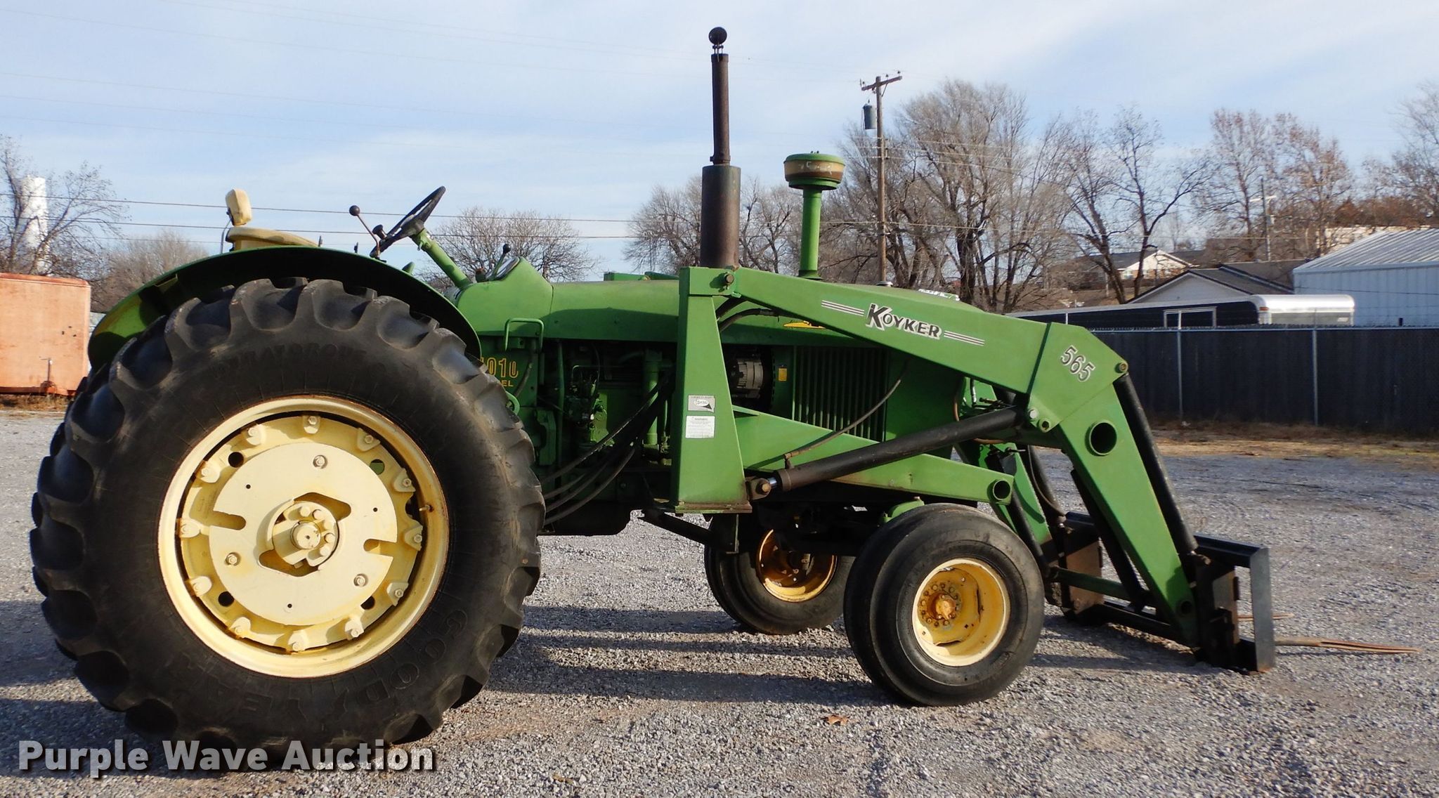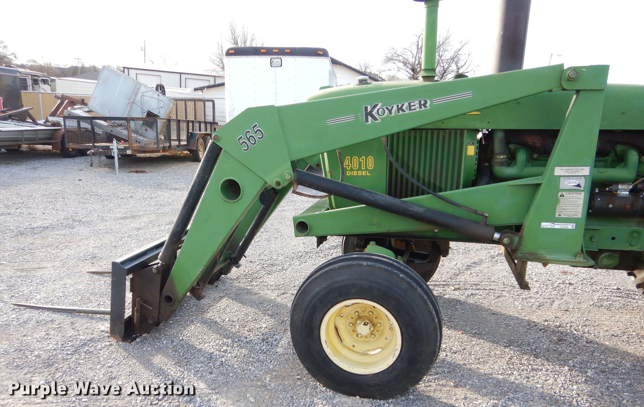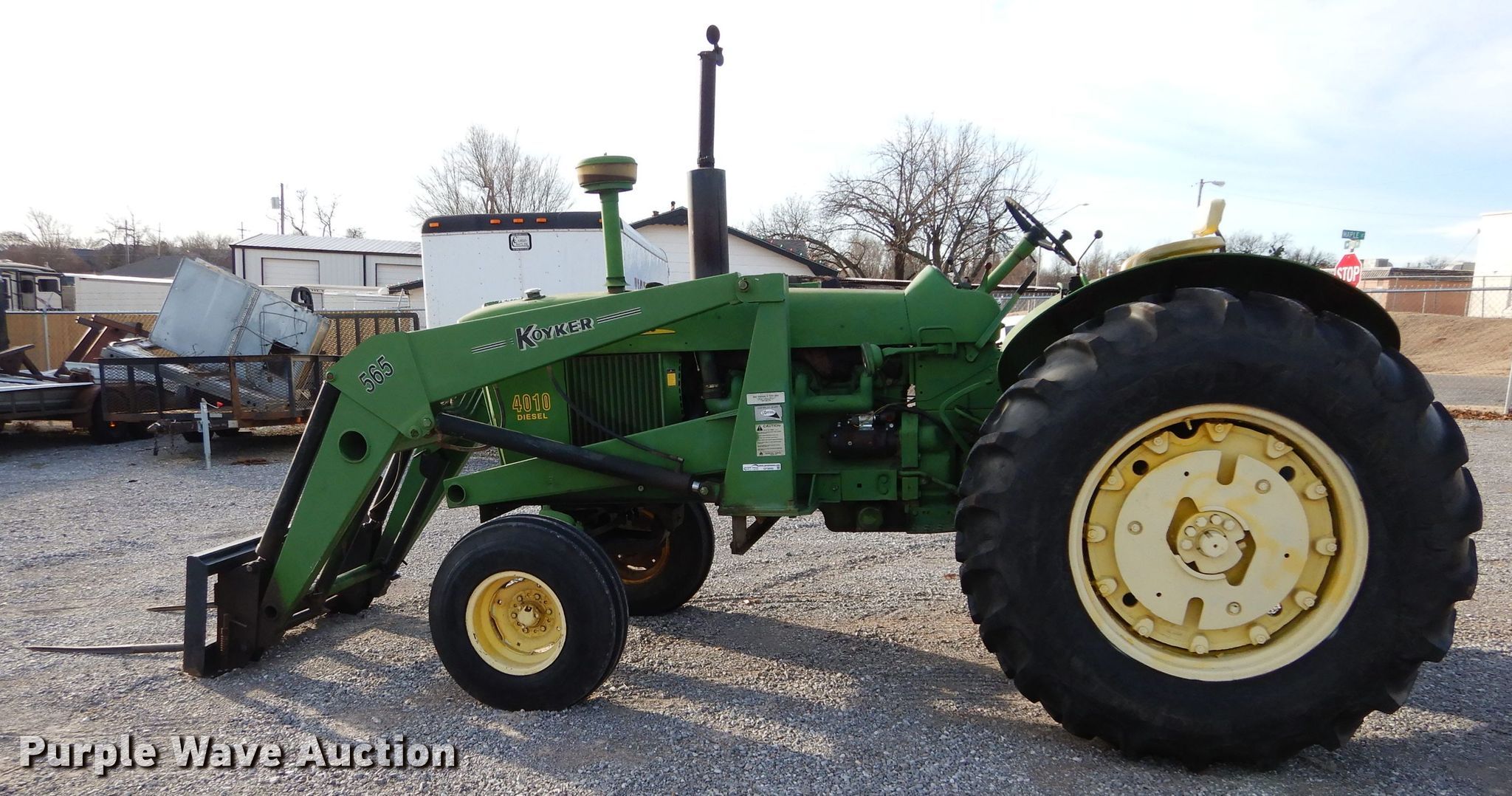 Purple Wave is selling a used Tractor in Oklahoma. This item is a John Deere 4010 tractor with the following: 3,490 hours on meter, John Deere four cylinder diesel engine, Manual transmission, 8F-2R gears, Koyker 565 loader, Bale spear, 540 PTO, Rear hydraulic remote set, 11L-15SL front tires, 18.4-34 rear tires, Serial 4010-2T45285