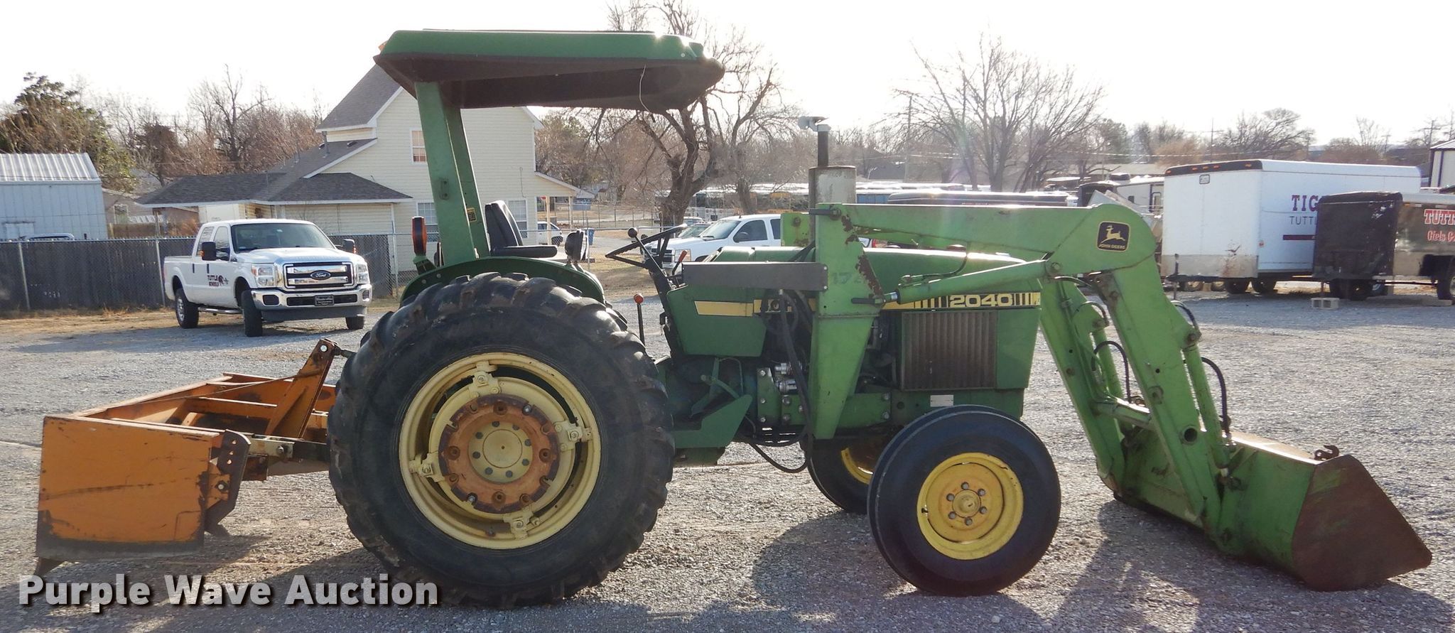 Purple Wave is selling a used Tractor in Oklahoma. This item is a John Deere 2040 tractor with the following: 3,122 hours on meter, John Deere three cylinder diesel engine, Manual transmission, 8F-2R gears, John Deere 175 loader, 72"W bucket, Joystick controls, Three point, 540 PTO, 72"W box blade, 7.50-16 front tires, 14.9-28 rear tires, Serial 405202