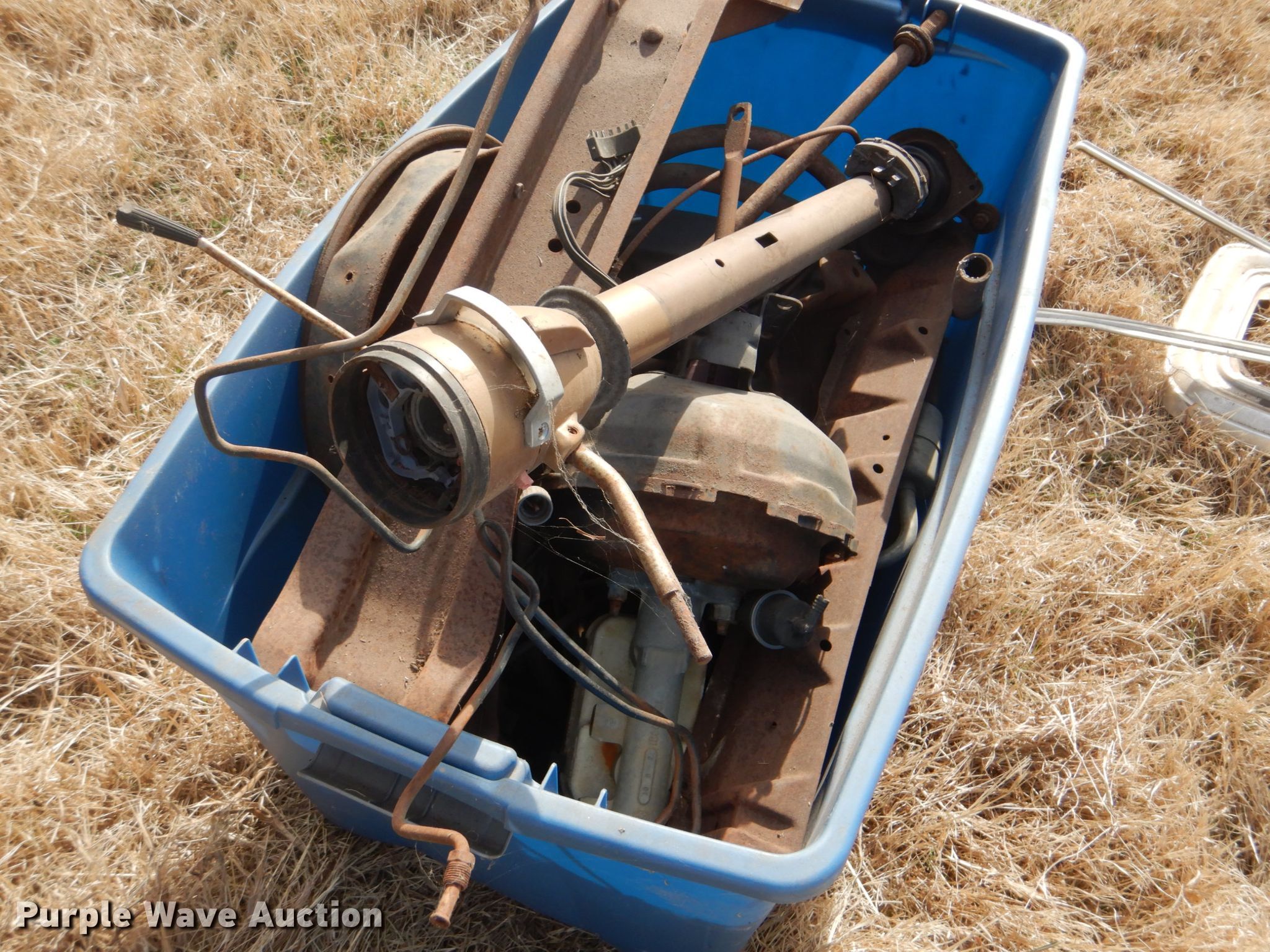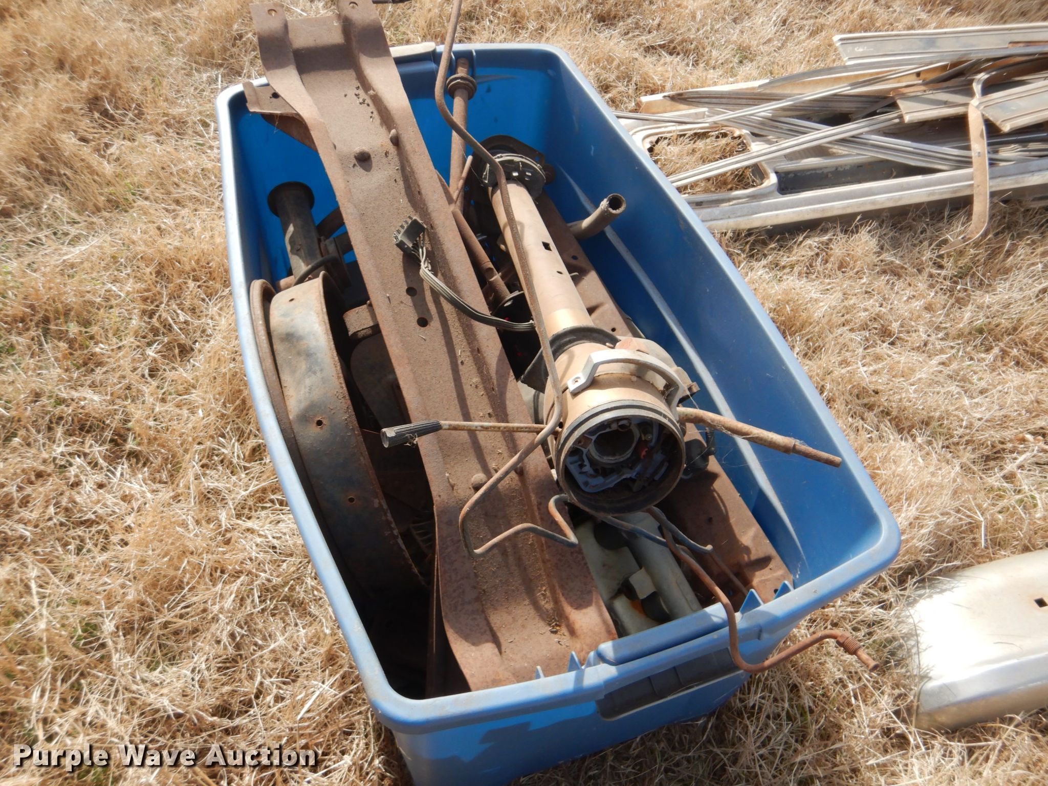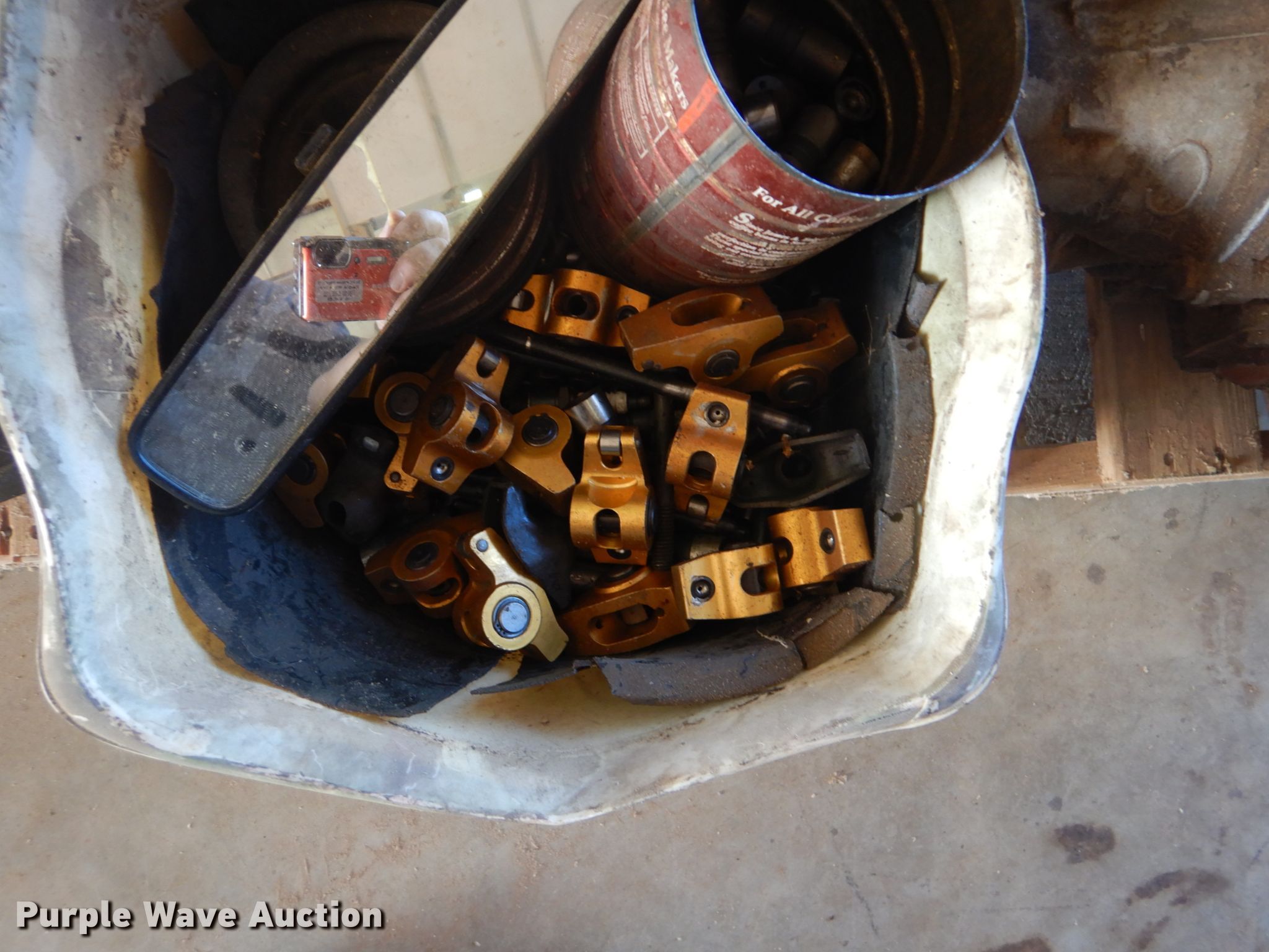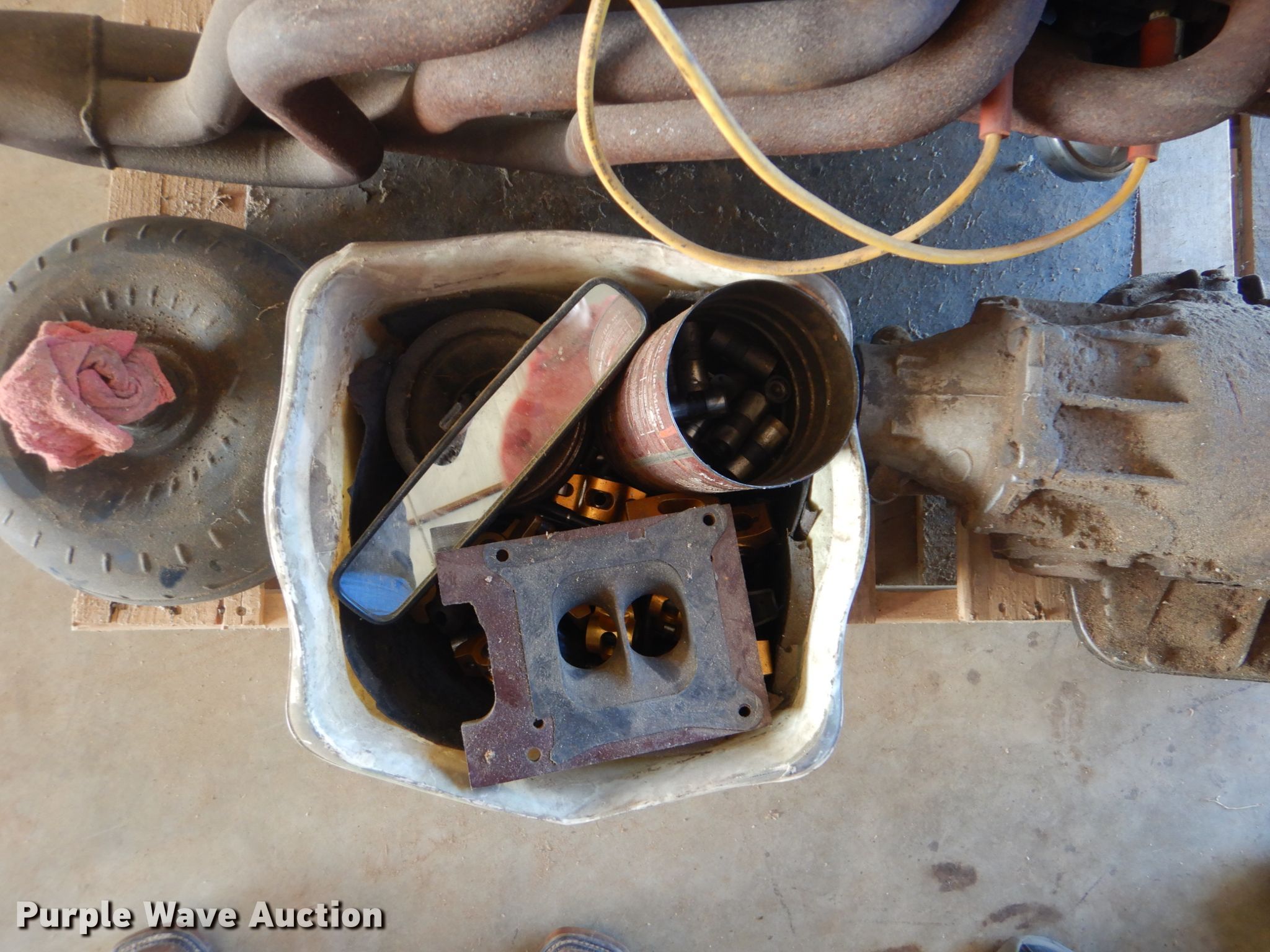 Purple Wave is selling a used Automotive Parts or Acces. in Oklahoma. This item is a 1969 Chevrolet truck parts with the following: Cab, front end, and bed, (2) chassis, 198"L, LT23575R15 front tires, 32x11.50R15LT rear tires, 305 Chevrolet V8 engine with headers, 383 Stroker short block, (2) 350 transmissions, 400 turbo transmission, Chevrolet headers, Chevrolet 350 engine on stand, Removed from 1979 Blazer, Four barrel Quadrajet carburetor, Four barrel carburetor, Two barrel Carburetor, Transmission cooler, Fan shroud, Drive shaft, Edelbrock air filter, Power steering pump, Air conditioner compressor and condensor, Aluminum rollers, rockers, and lifters, Wing windows, Rubber cab and window seals, Air conditioner parts, Cab and bed mount bushings, Bench seat, Mouldings, Grill, Rear bumper, Steering column and more