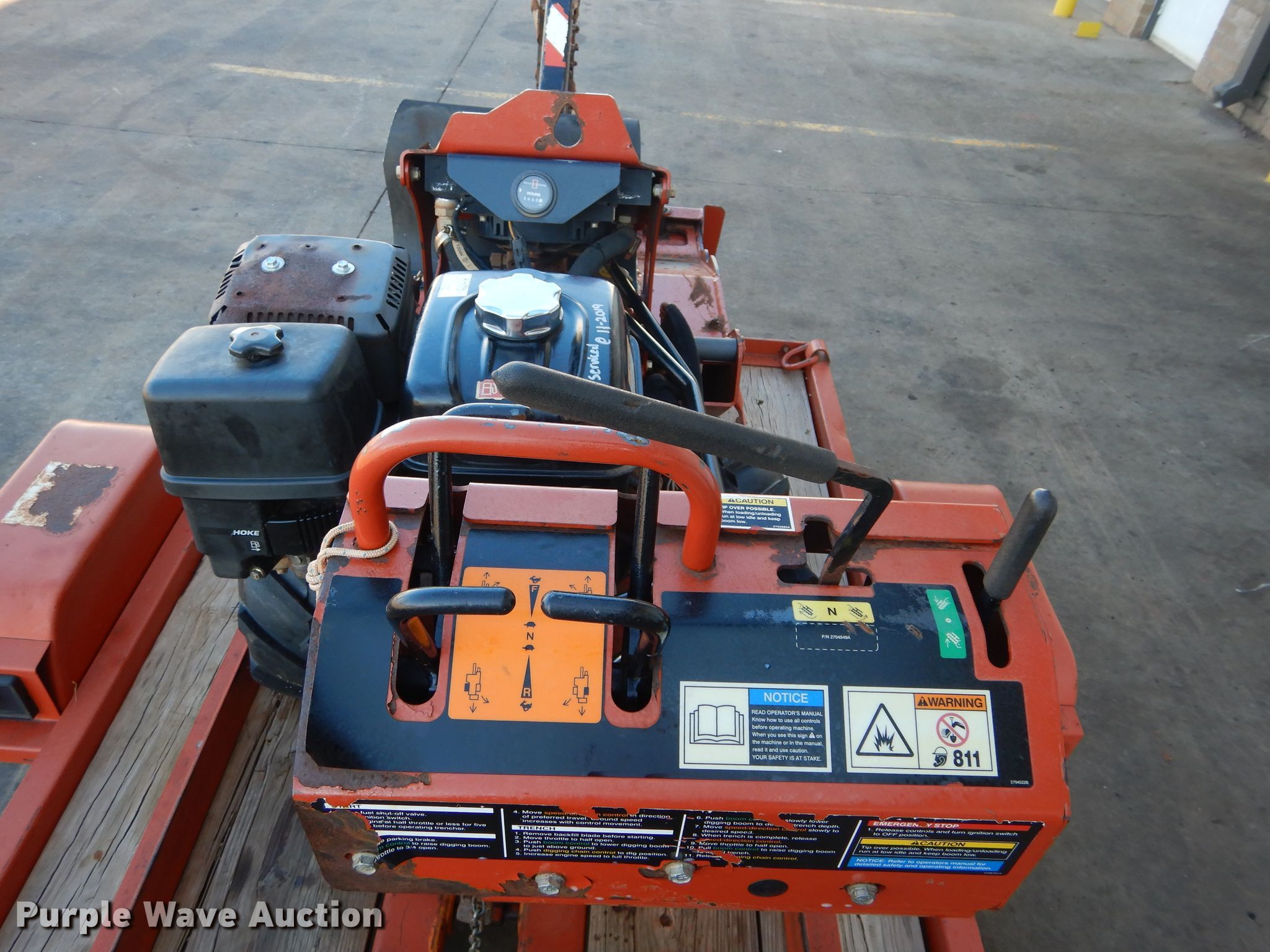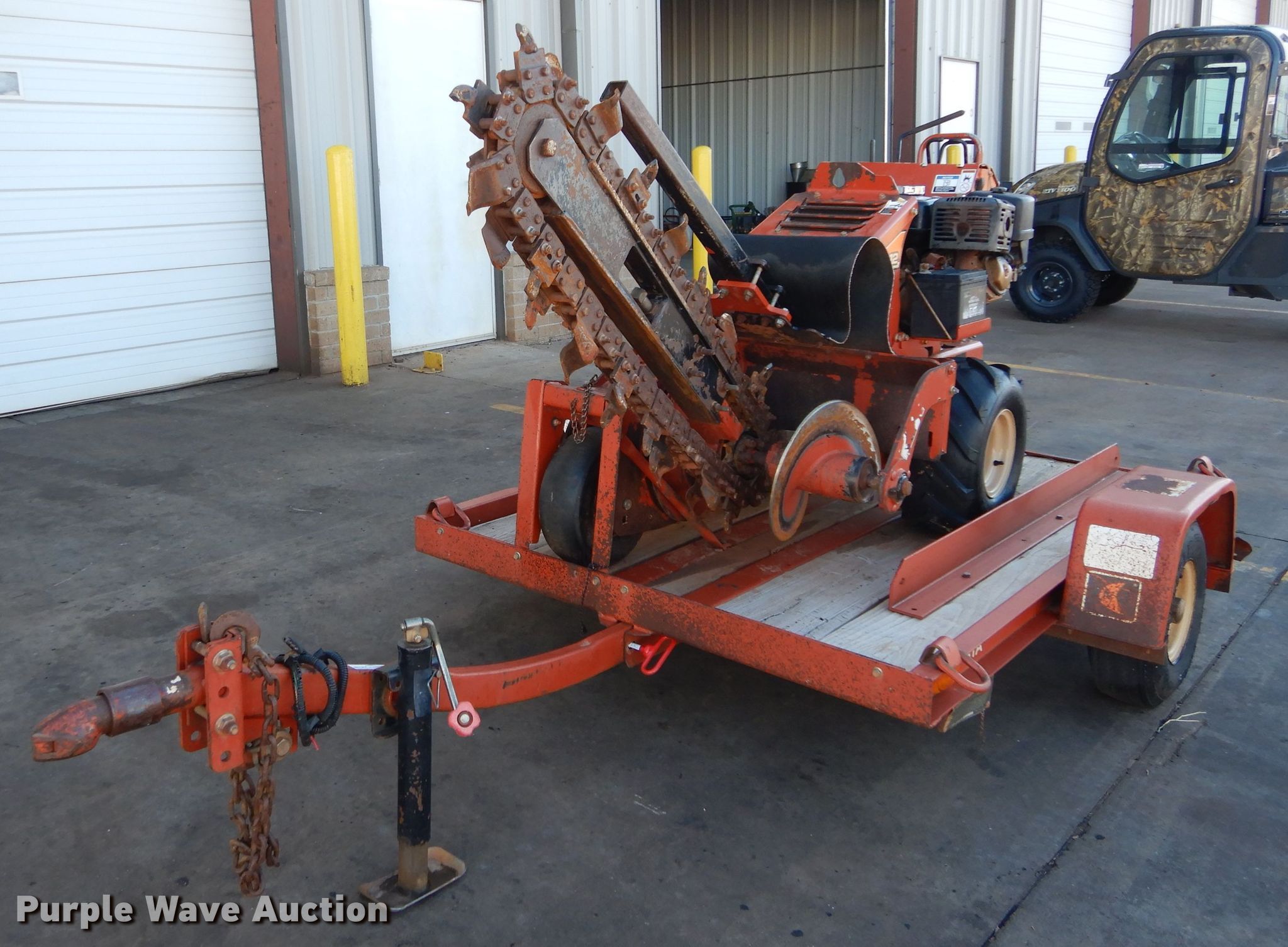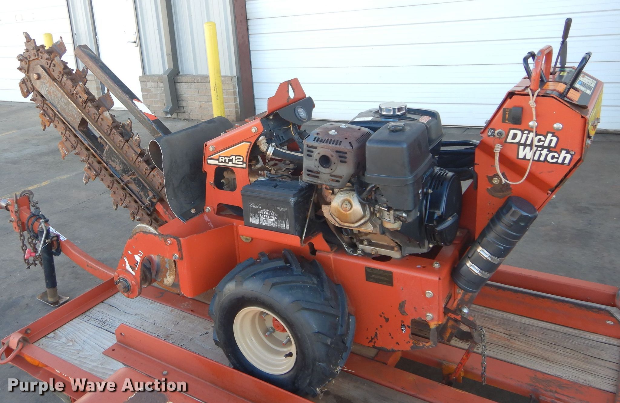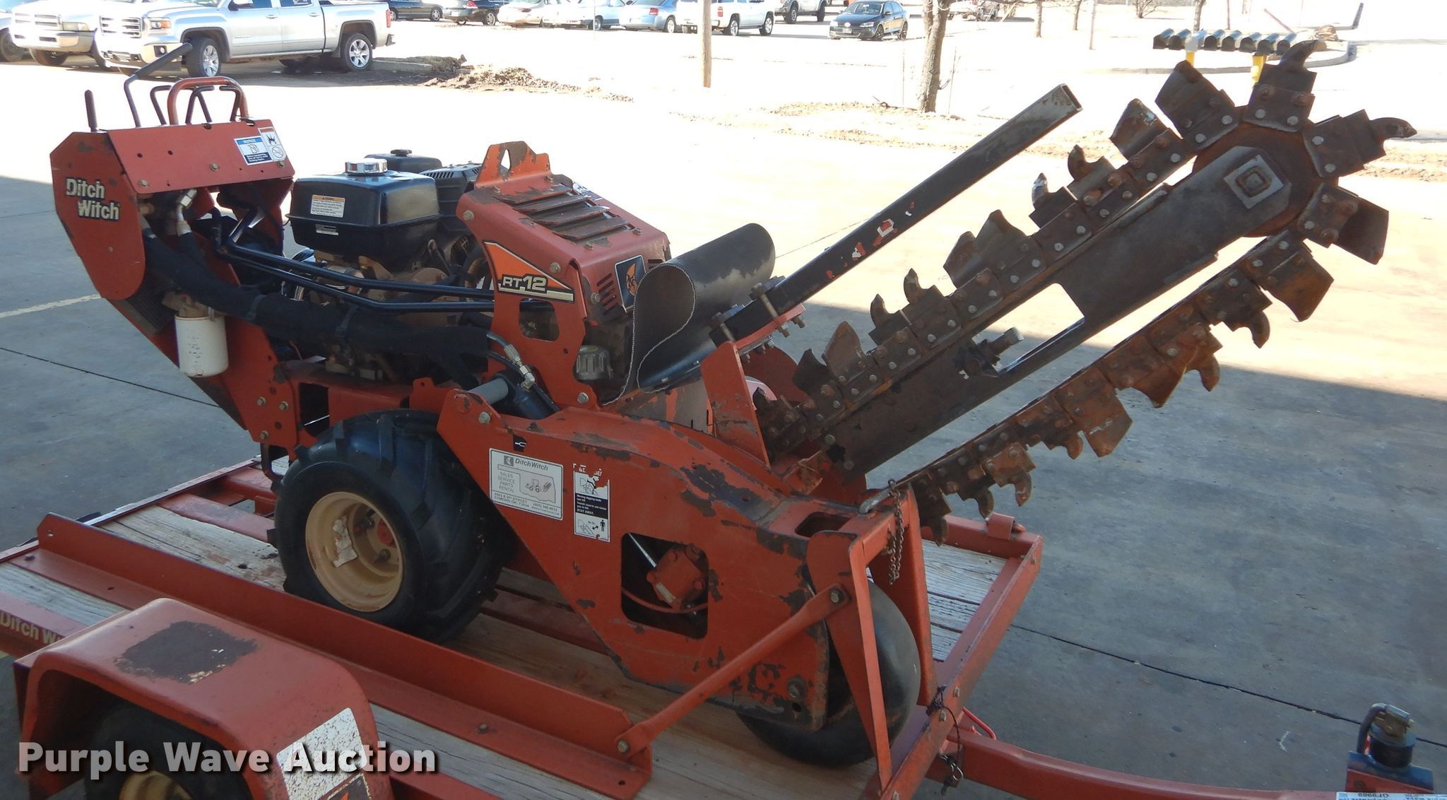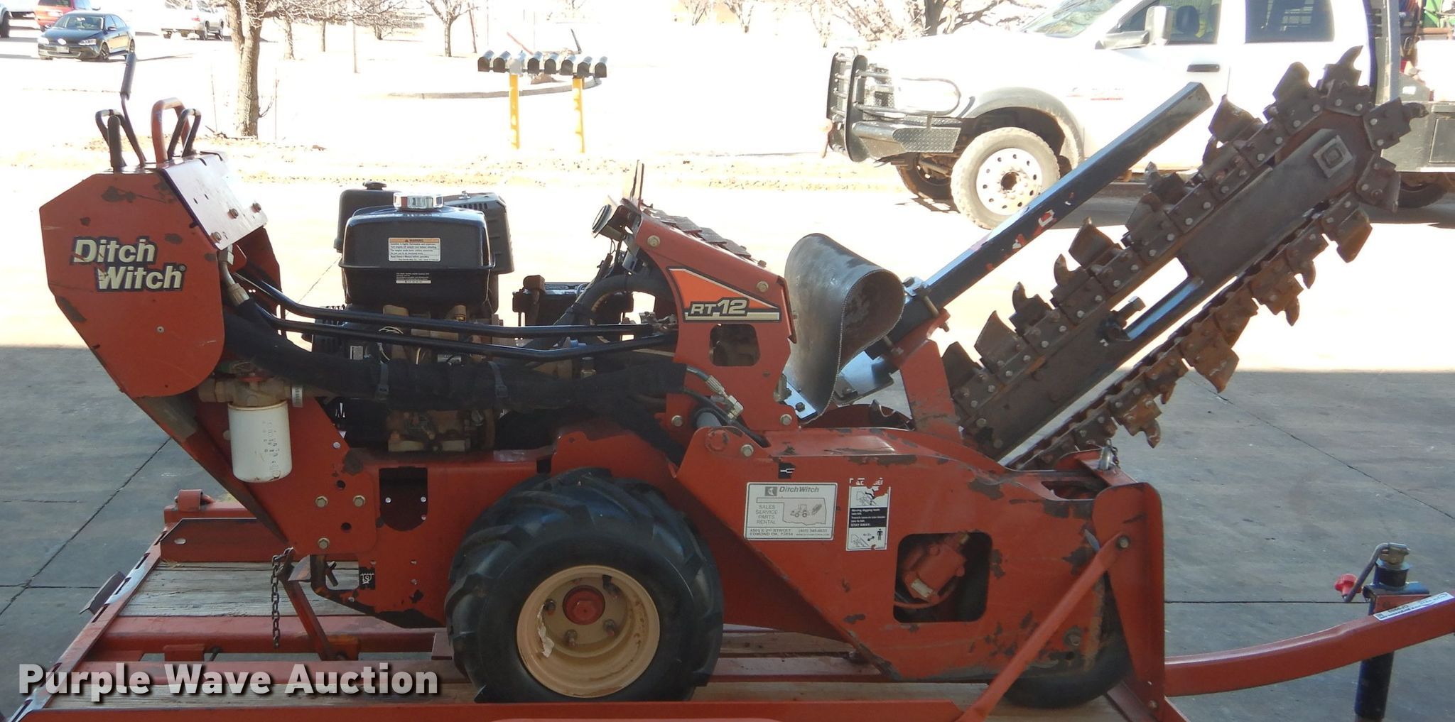 Purple Wave is selling a used Trencher or Rock Saw in Oklahoma. This item is a 2013 Ditch Witch RT12 trencher with the following: Unknown hours on meter, Honda single cylinder gas engine, Hydrostatic transmission, 36" boom length, 4" cutting width, 18x9.50-8 tires, Non-operational hour meter, 2008 tilt deck trailer, 10.5'L overall, 78" x 54" deck, 2" ball hitch, 5.70-8 tires, Serial CMWRT12XHD001951