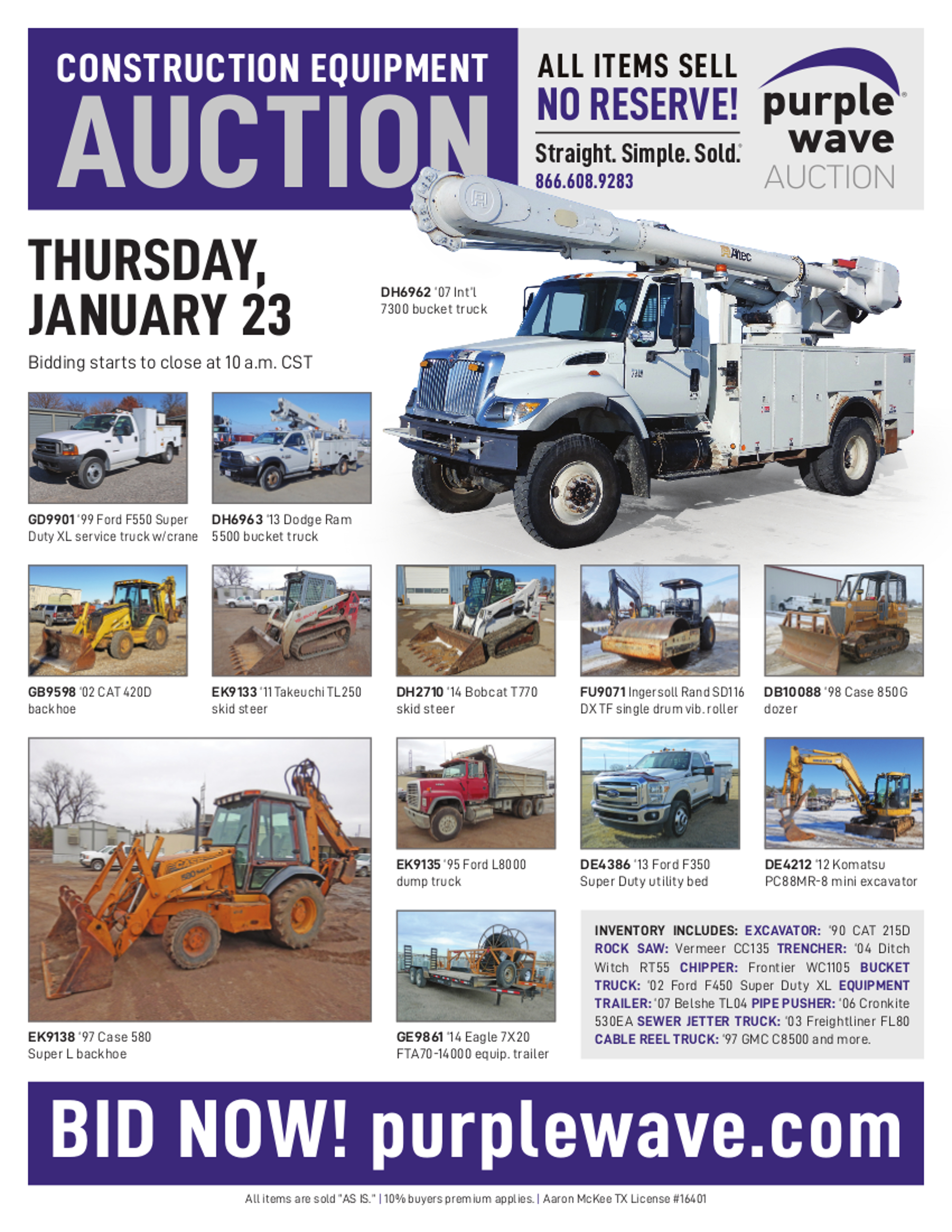 This auction is conducted by Purple Wave, Inc., whose home office is 825 Levee Drive, Manhattan, Kansas. Aaron McKee, Texas auctioneer license # 16401, operates Purple Wave, Inc. Complaints against us may be directed to the Texas Department of Licensing and Regulation, P.O. Box 12157, Austin, Texas 78711, (512) 463-6599. For additional required information, see the attached document.