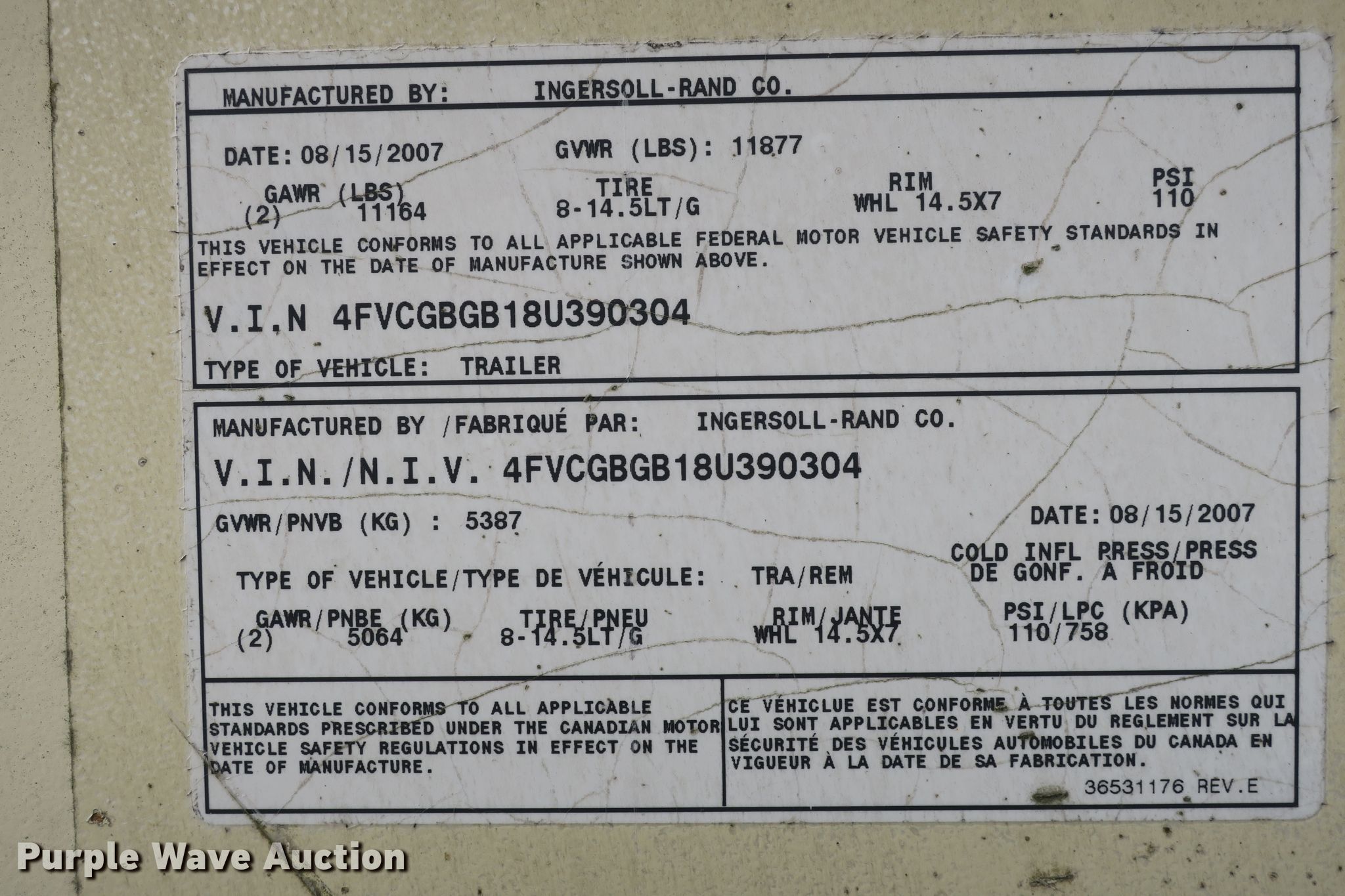 2008 Ingersoll Rand XHP750 air compressor. 1,835 hours on meter, Caterpillar C9 six cylinder diesel engine, 750 CFM, 110 psi, Pintle hitch , Spring suspension, 8-14.5 tires, GVWR 11,877 lbs. Transfer of ownership documentation will be a bill of sale. 4FVCGBGB18U390304. Excel Utility Contractors, LLC. 2 Industrial Dr.. Saint James, MO 65559