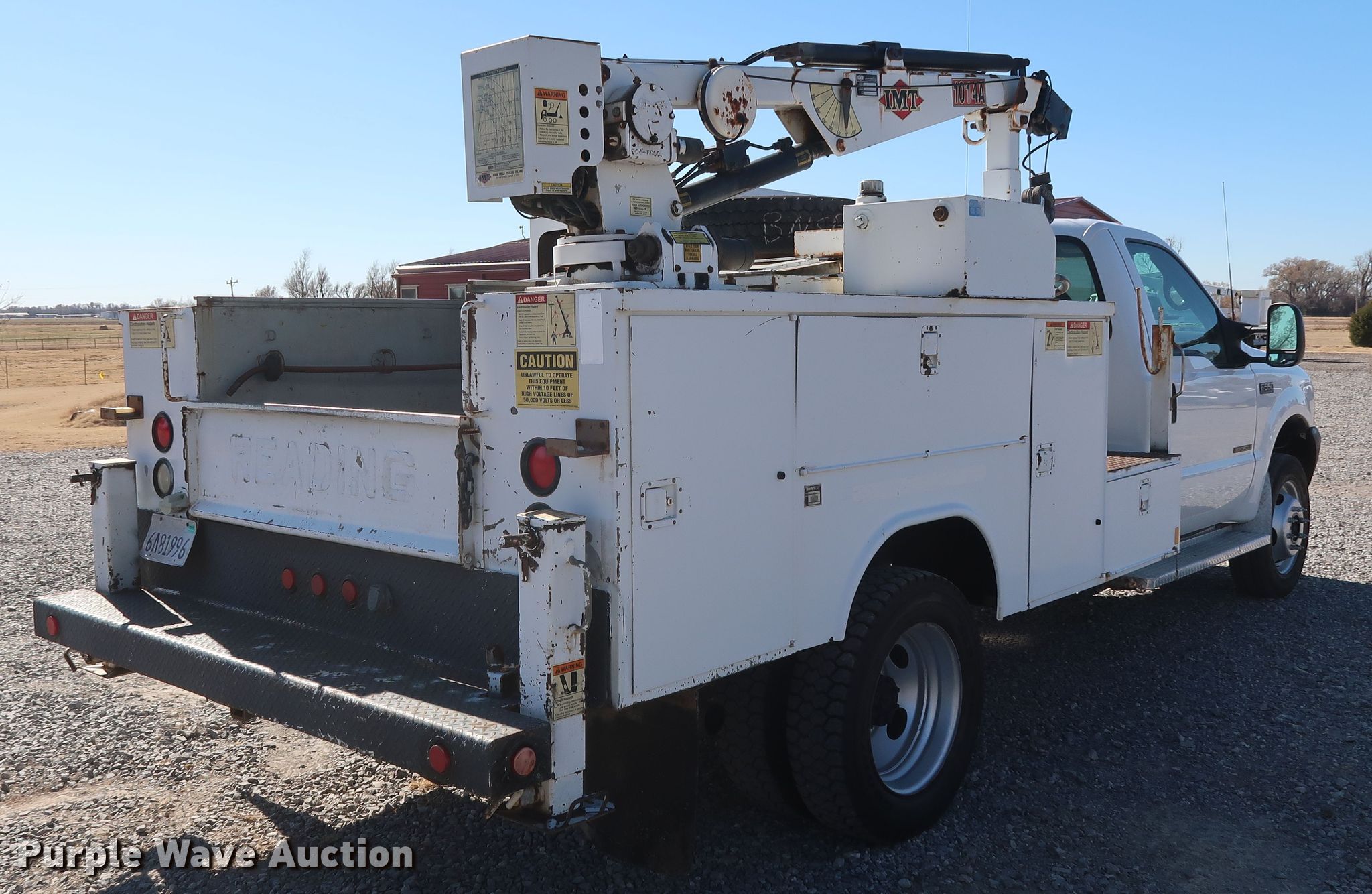 Purple Wave is selling a used Service Truck in Oklahoma. This item is a 1999 Ford F550 Super Duty XL service truck with crane with the following: 100,941 miles on odometer, 7.3L V8 OHV 16V diesel engine, Six speed manual transmission, Single axle, AC and heat, Auxiliary controls, PTO, Reading 132ADW utility bed, 12'L, Torch bottle rack, Stellar air compressor, Hydraulic fluid reservoir, IMT 1014A crane, 15'2" boom length, 3,200 lbs maximum lift capacity, Spring suspension, Hydraulic brakes, 165" wheelbase, Goodyear 225/70R19.5 tires, GVWR 17,500 lbs