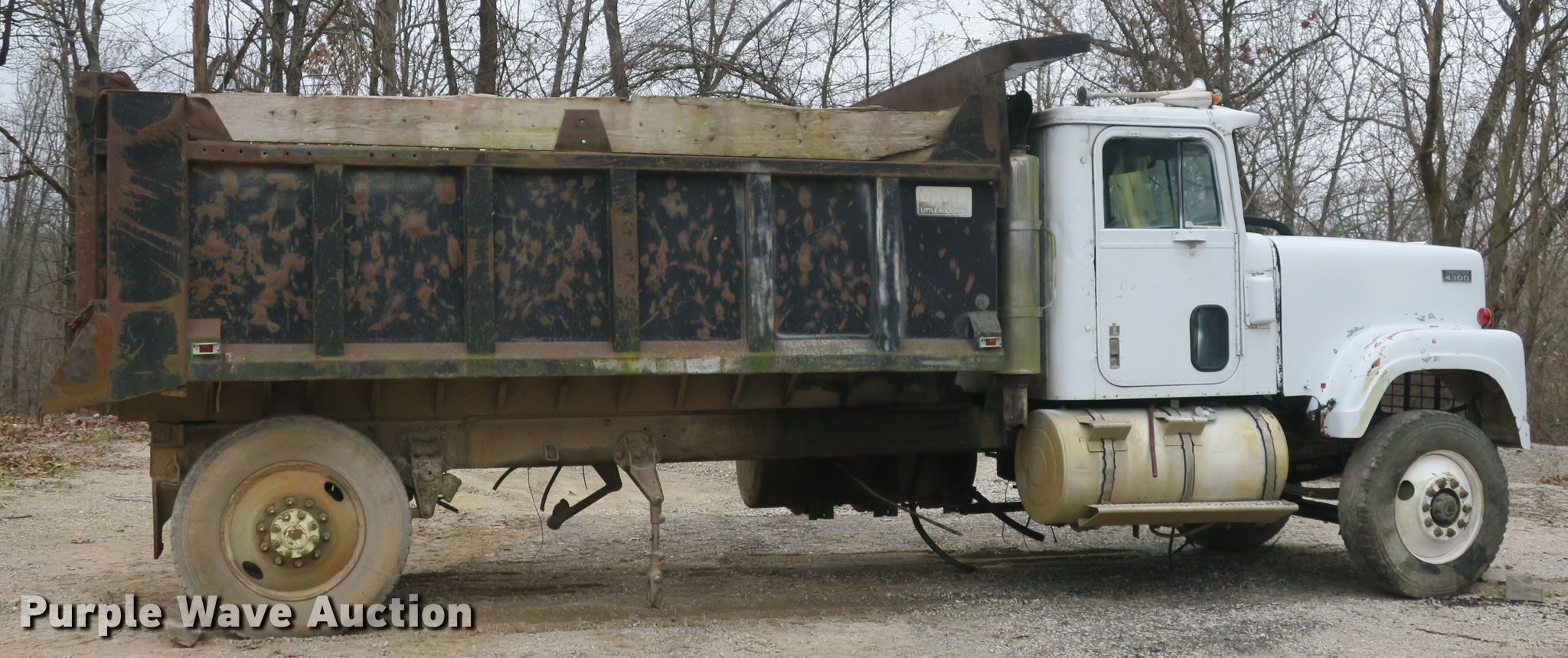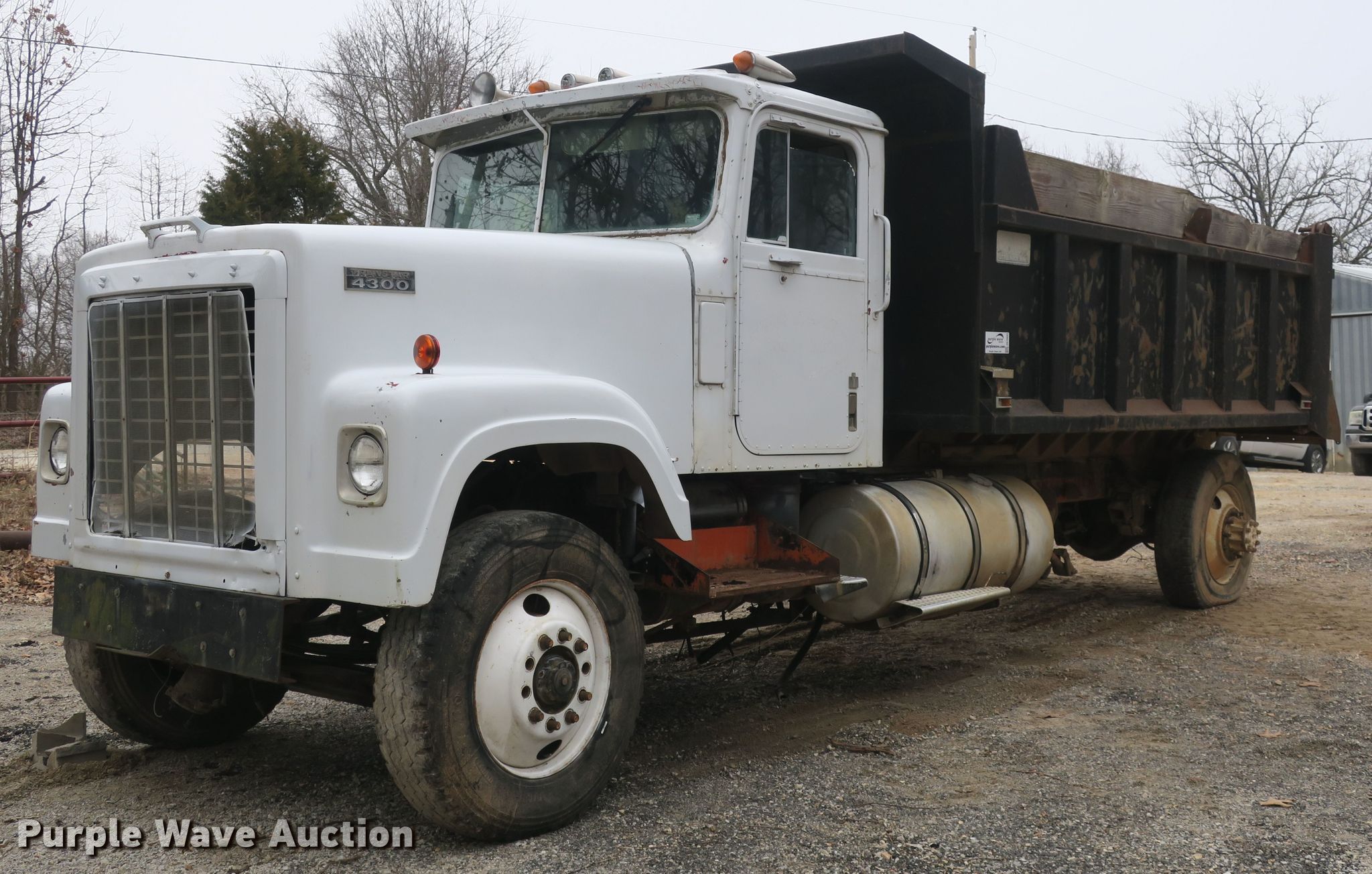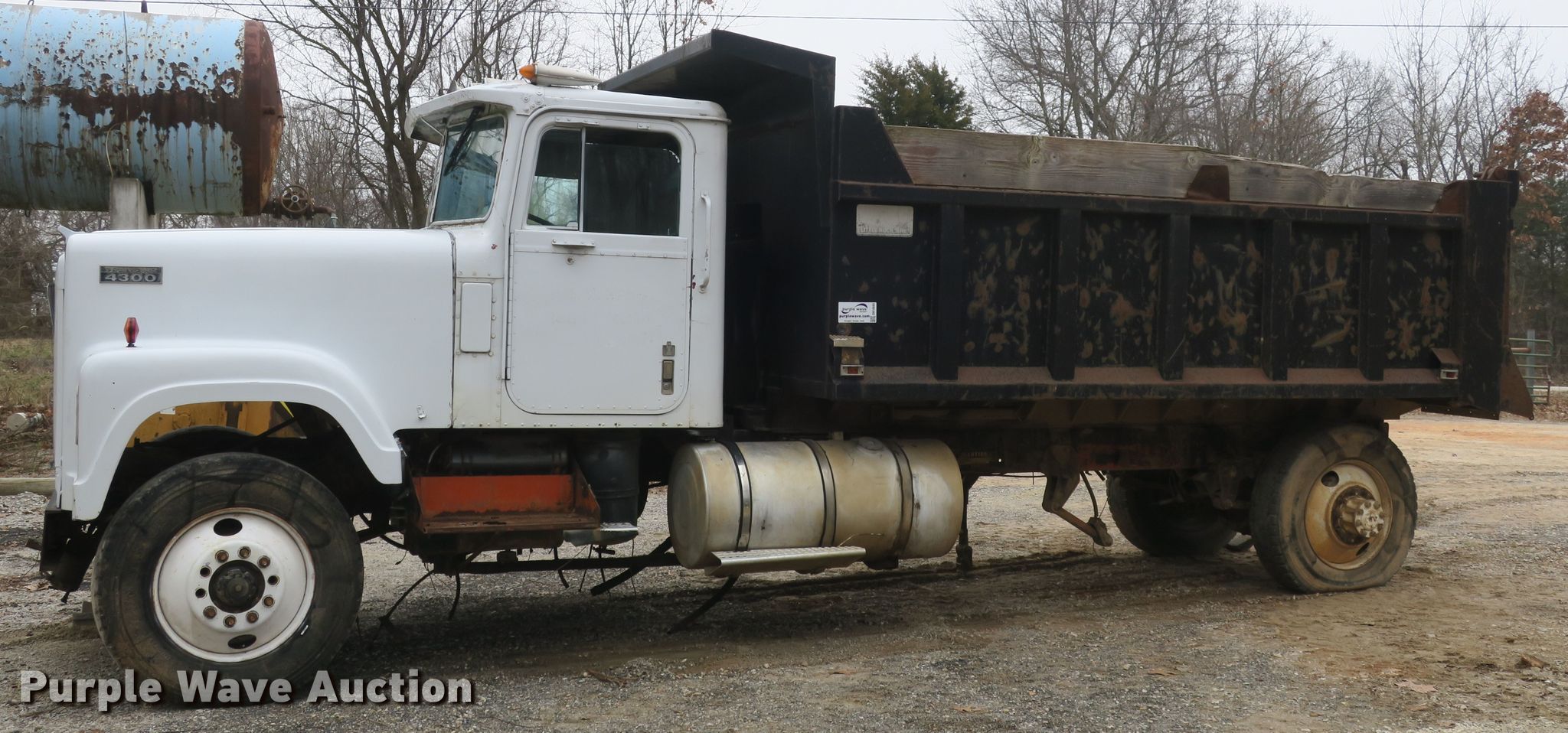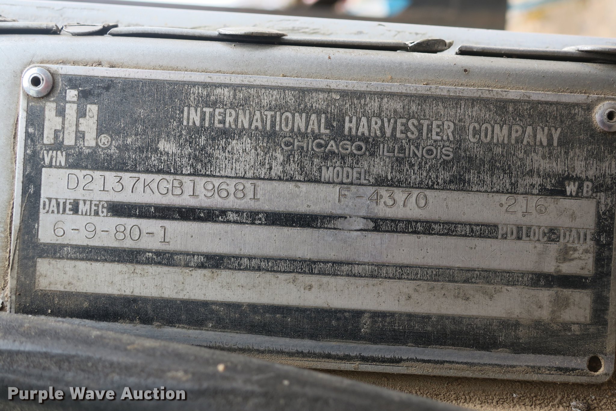 Purple Wave is selling a used Construction Dump Truck in Missouri. This item is a 1980 International F4370 dump truck with the following: 643,834 miles on odometer, No engine, No transmission, Single axle, 14'L x 97"W dump bed, 36" side height, 8" side board height, Spring suspension, 11R24.5 tires, No PTO, Rear unattached, included in bed, Main cylinder unattached, included in bed, No air cylinder for end gate, Parts missing, Non-operational unit, Unit must be towed or hauled