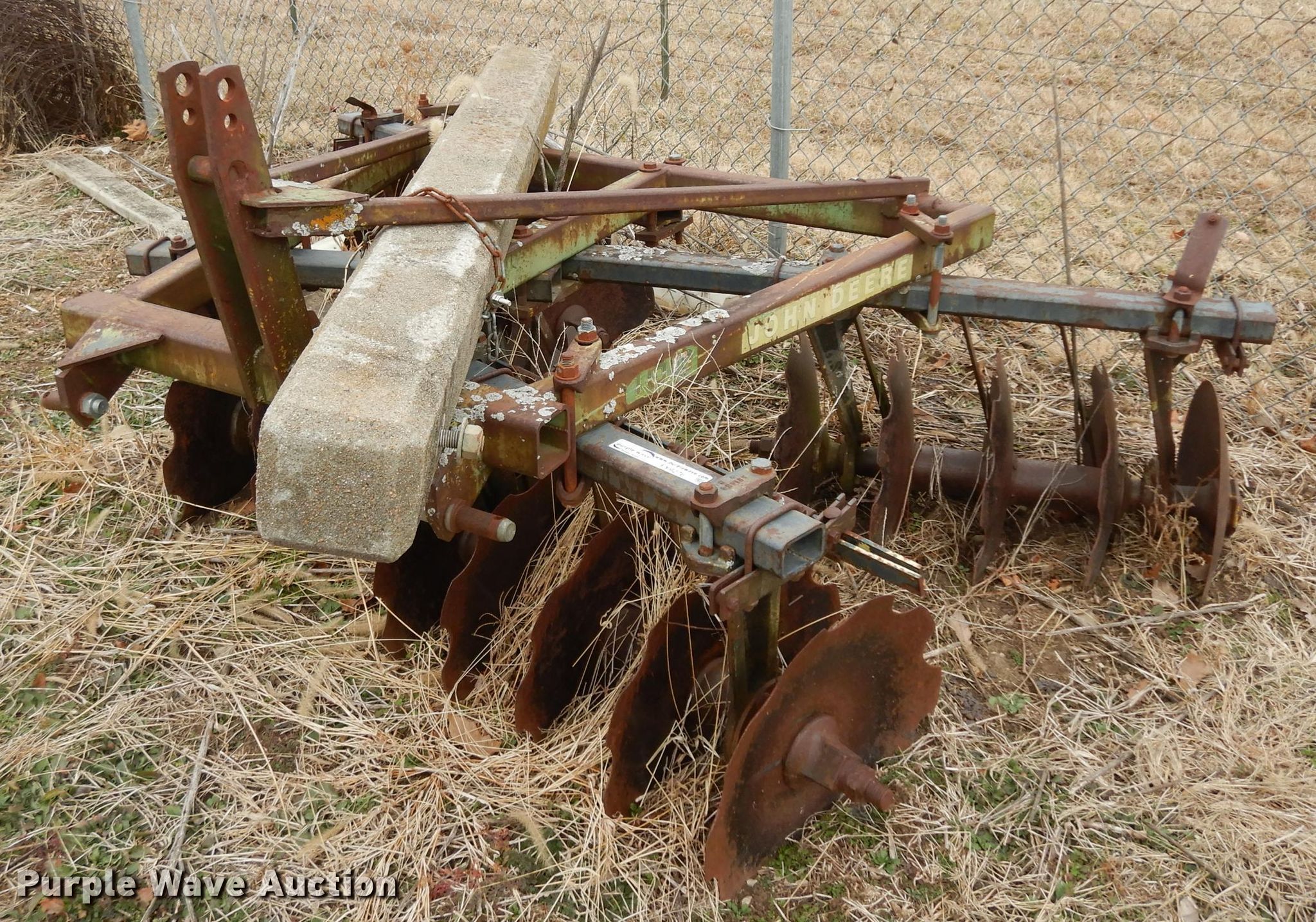 Purple Wave is selling a used Disk in Kansas. This item is a John Deere 100 disk with the following: 7'W, 20" diameter disks, 7" spacing, Top weight, Three point
