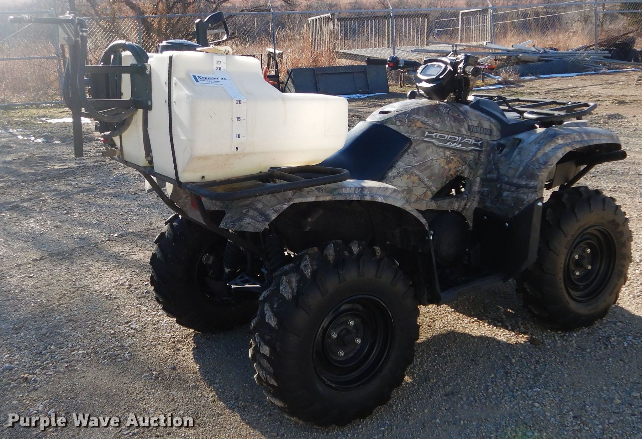 Purple Wave is selling a used ATV in Kansas. This item is a 2016 Yamaha Kodiak ATV with the following: 139 miles on odometer, 15 hours on meter, 700cc single cylinder gas engine, Automatic transmission, Superior 12' boomless sprayer, 27 gallon tank, Wand, AT25x8-12 front tires, AT25x10-12 rear tires