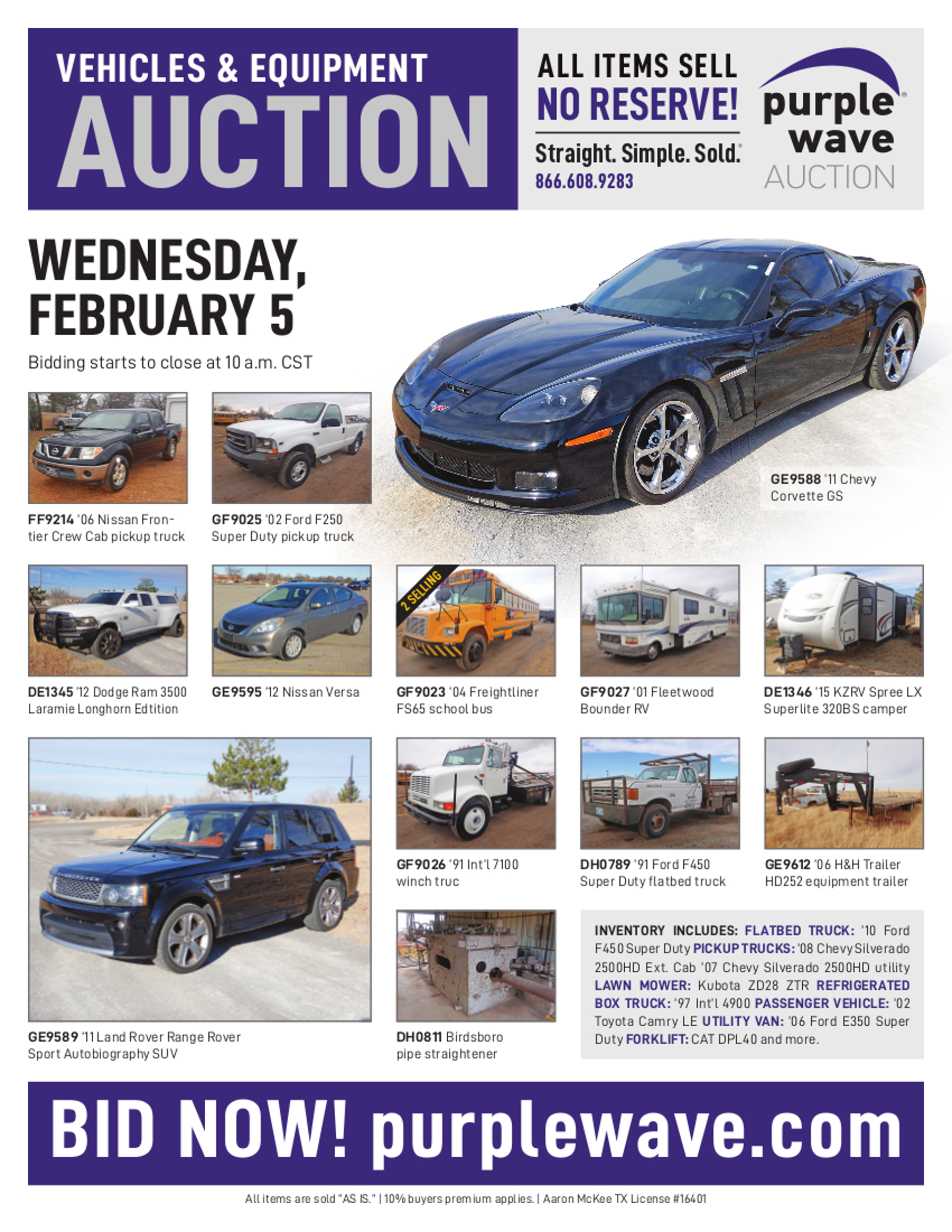 This auction is conducted by Purple Wave, Inc., whose home office is 825 Levee Drive, Manhattan, Kansas. Aaron McKee, Texas auctioneer license # 16401, operates Purple Wave, Inc. Complaints against us may be directed to the Texas Department of Licensing and Regulation, P.O. Box 12157, Austin, Texas 78711, (512) 463-6599. For additional required information, see the attached document.