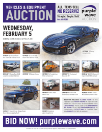 Payments must be made by 4 p.m. CST on the second business day following the auction. Failure to make payment or payment arrangements by the deadline will result in a $30 late payment fee. Purple Wave reserves the right to charge the credit card on file the total purchase price and a $30 late payment fee will be added for invoices not paid within our terms. Payment should be made to Purple Wave, Inc.
