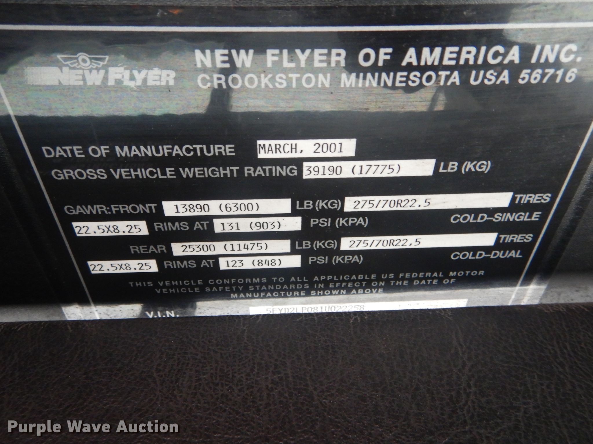 Purple Wave is selling a used Bus in Missouri. This item is a 2001 New Flyer D40LF shuttle bus with the following: 483,292 miles on odometer, 8,000 hours on meter, Cummins ISC 8.3L L6 diesel engine, Automatic transmission, Single axle, AC and heat, Heated mirrors, Electric passenger sliding door, 39 passenger capacity, (39) adult seats, Wheel chair lift, 292" wheelbase, Spring suspension, Air brakes, 275/70R22.5 tires, GVWR 39,190 lbs