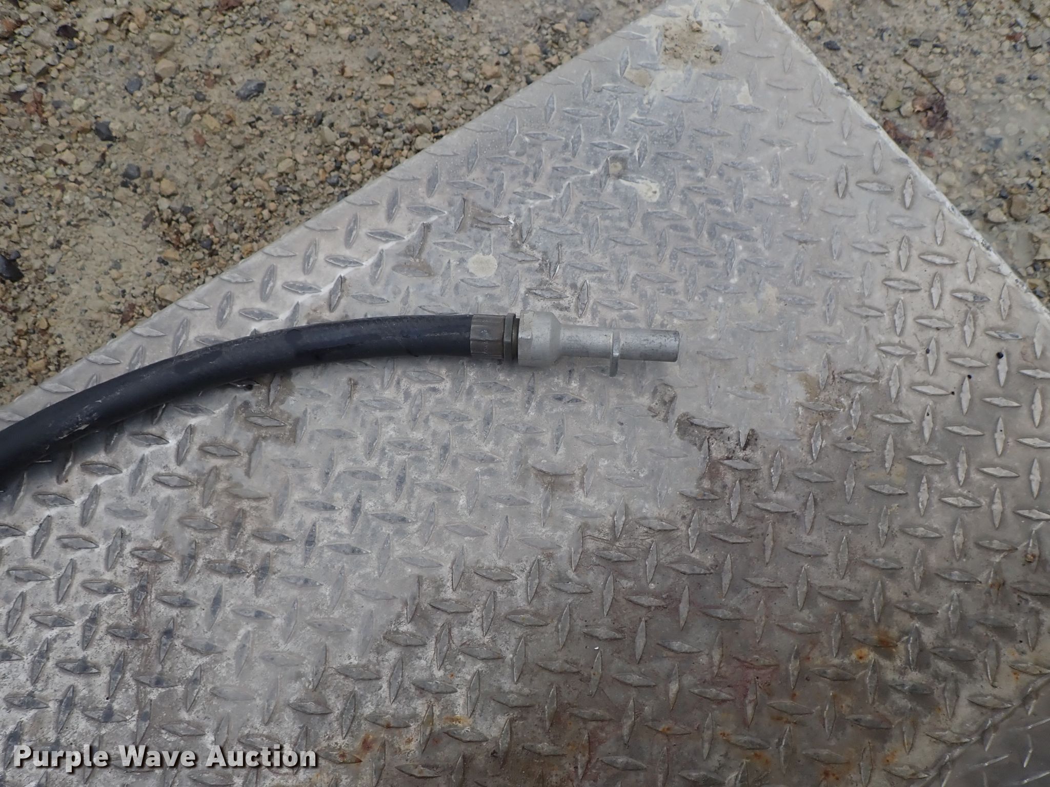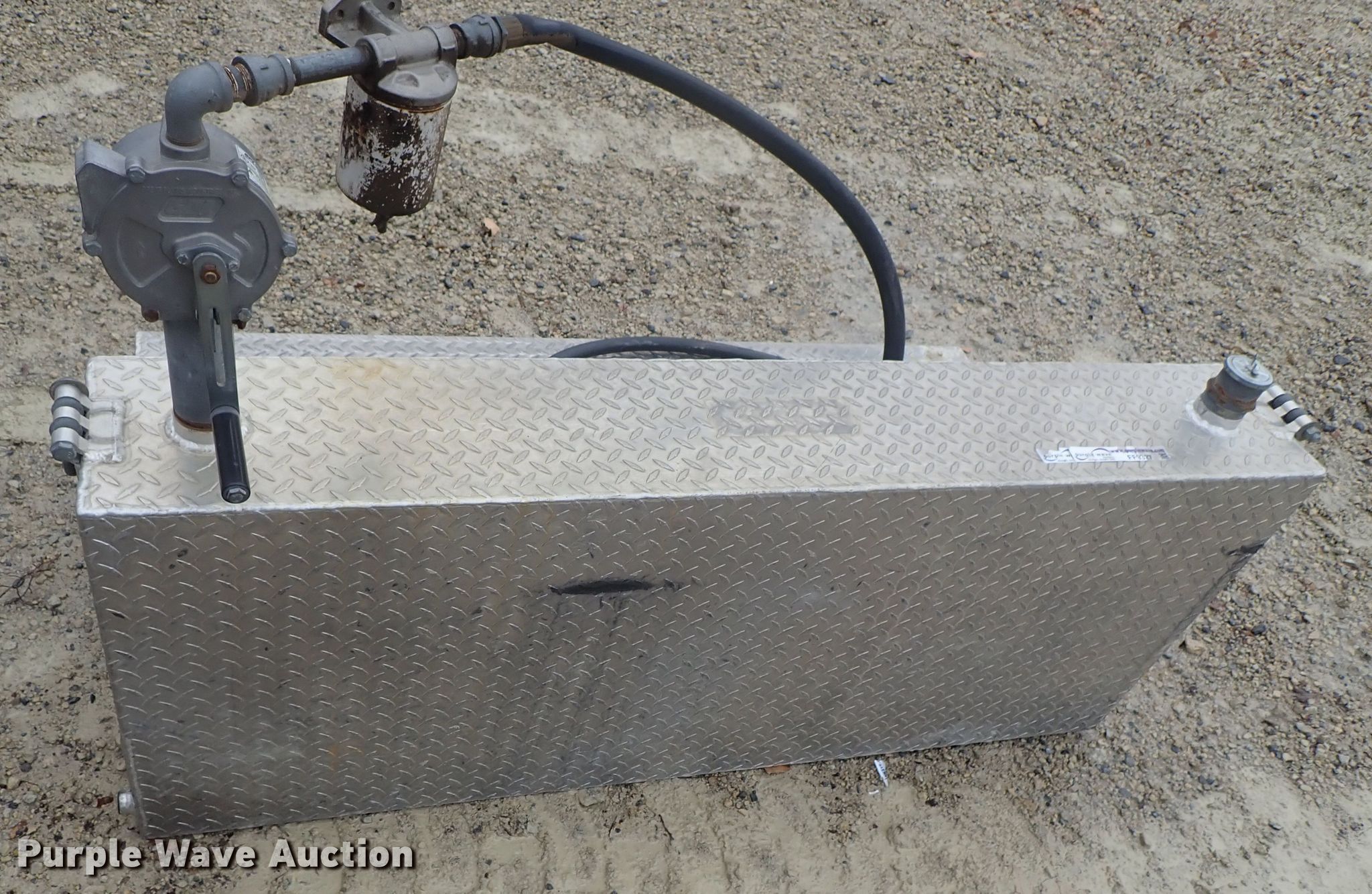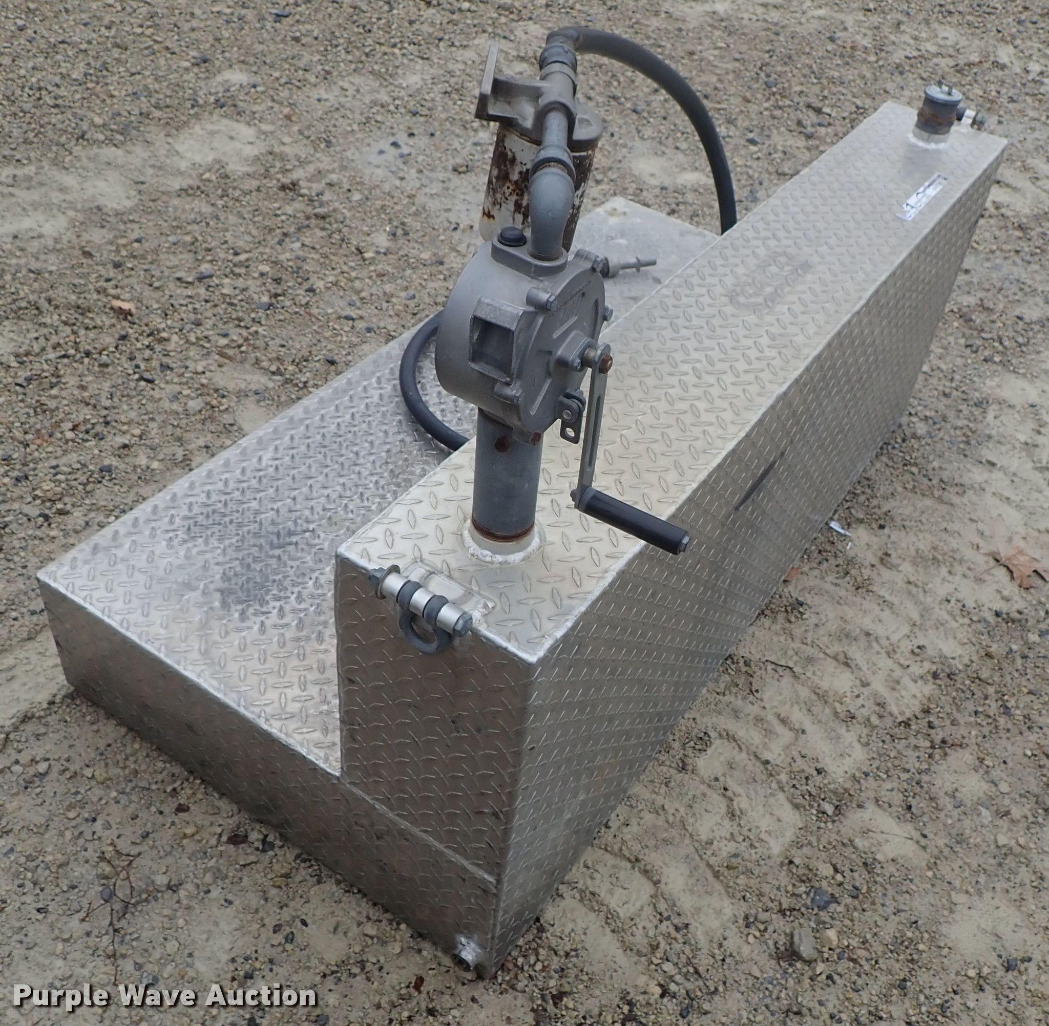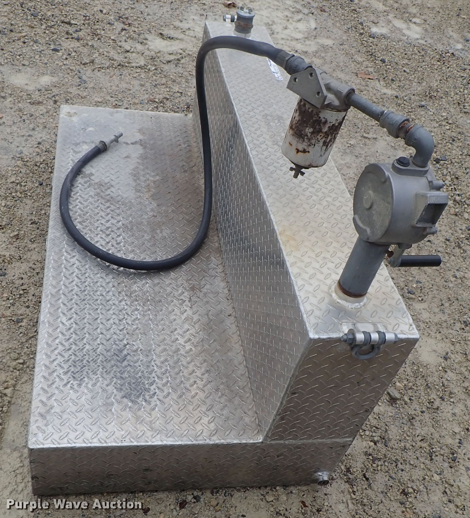 Purple Wave is selling a used Fuel and Lube in Kansas. This item is a L-shaped fuel tank with the following: 60" x 31" x 25", Hand pump, Diamond plate steel construction