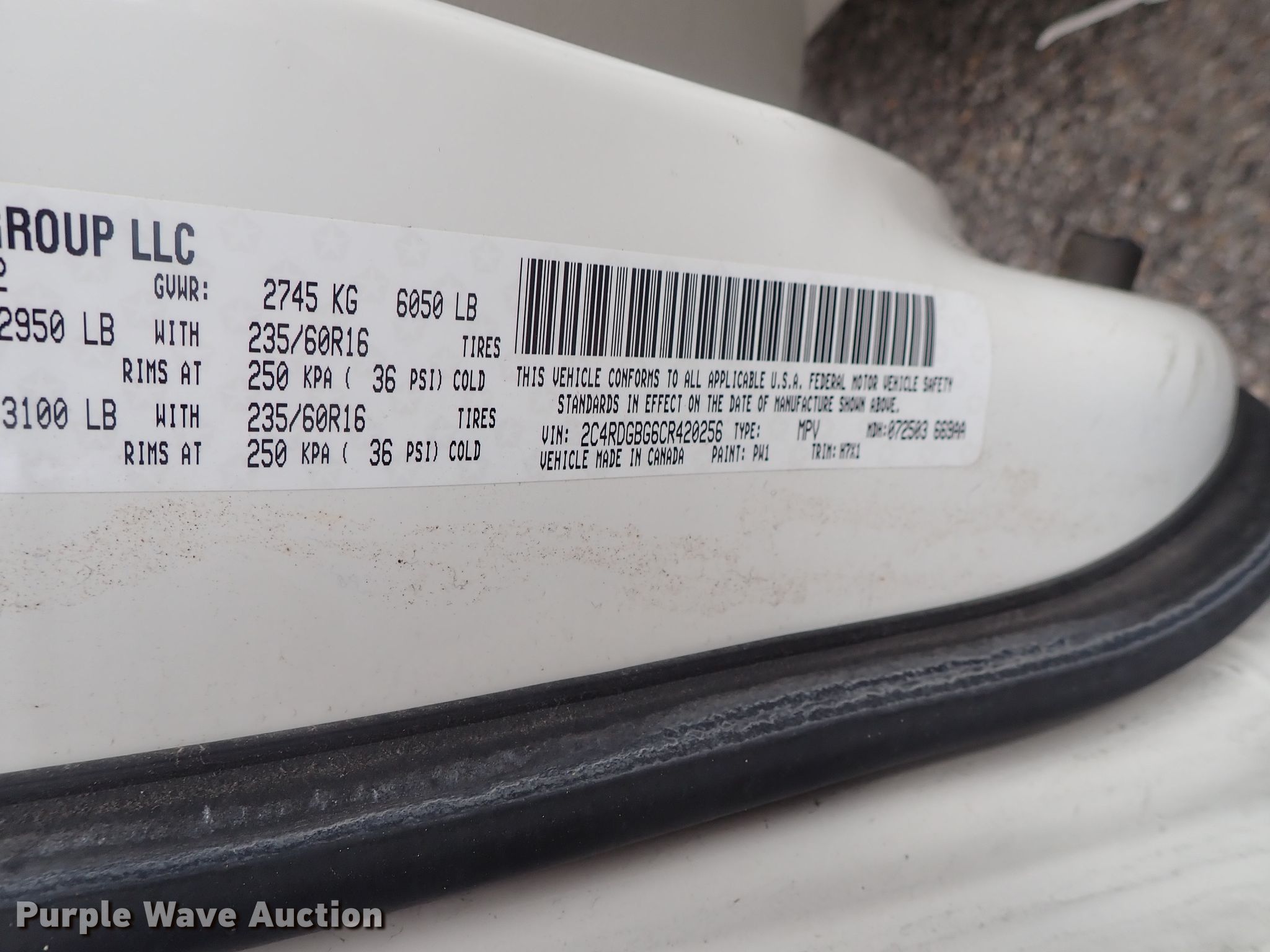 Purple Wave is selling a used Passenger Vehicle in Kansas. This item is a 2012 Dodge Grand Caravan van with the following: 191,263 miles on odometer, 3.6L V6 DOHC 24V gas engine, Automatic transmission, AC and heat, Cruise, Power windows and locks, 235/60R16 tires, Hail damage