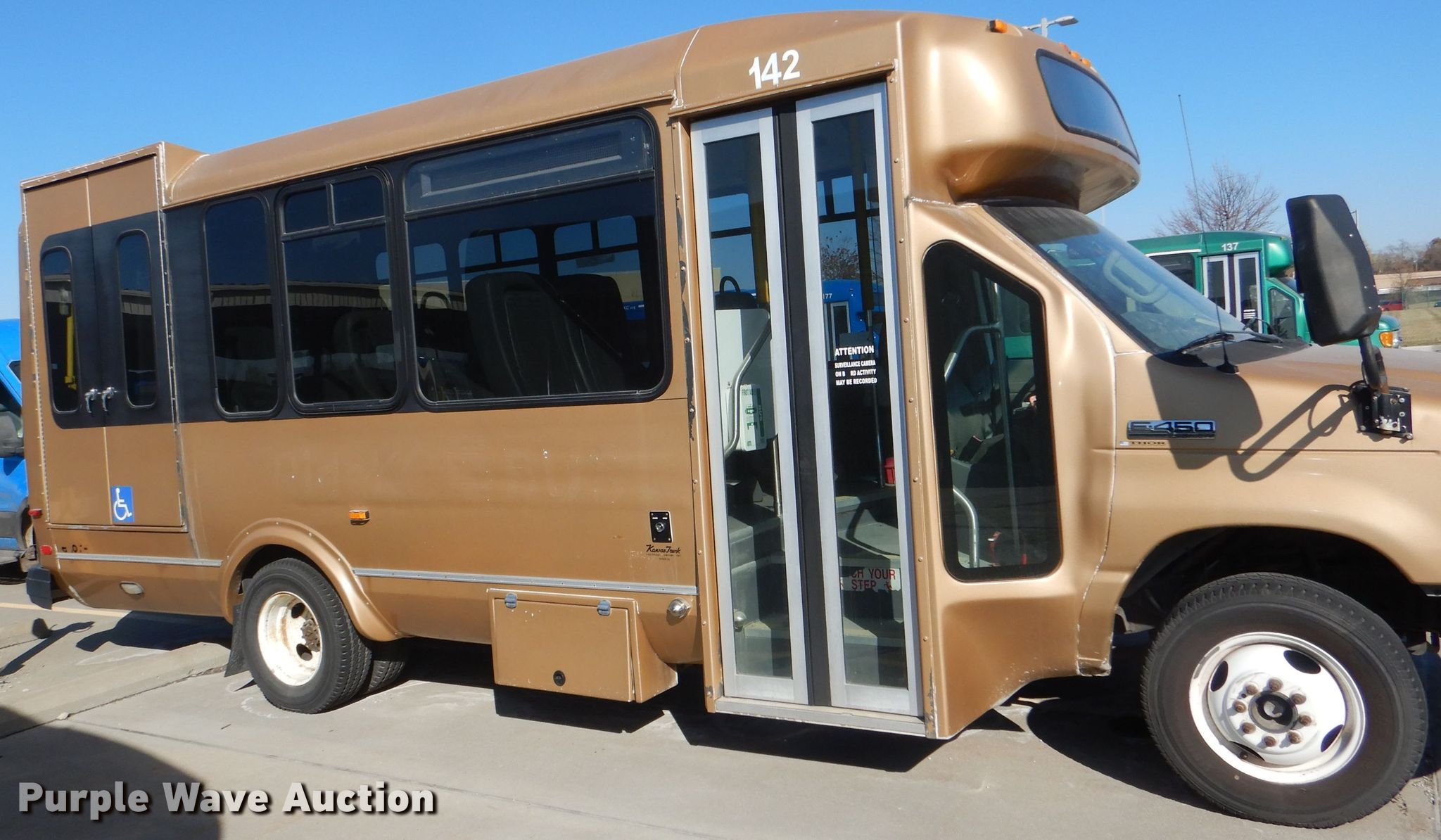 Purple Wave is selling a used Bus in Kansas. This item is a 2008 Ford Econoline E450 Super Duty shuttle bus with the following: Unknown miles on odometer, 6.0L V8 diesel engine, Automatic transmission, Single axle, AC and heat, Cruise, Electric passenger sliding door, 15 passenger capacity, Wheelchair lift, Spring suspension, Hydraulic brakes, 158" wheelbase, Bridgestone 225/75R16 tires, GVWR 14,500 lbs, Unknown operating condition, Unit# JCT142