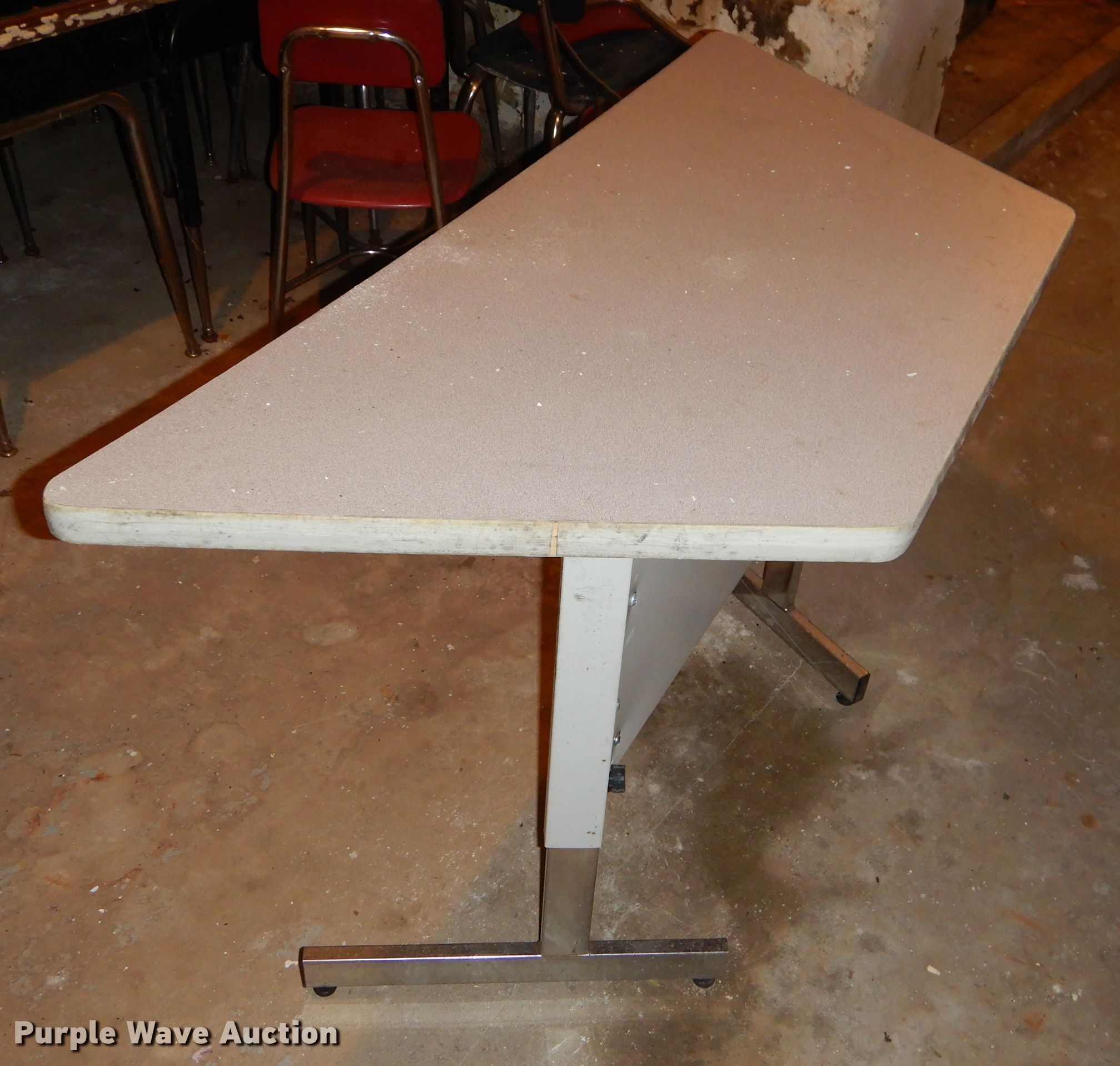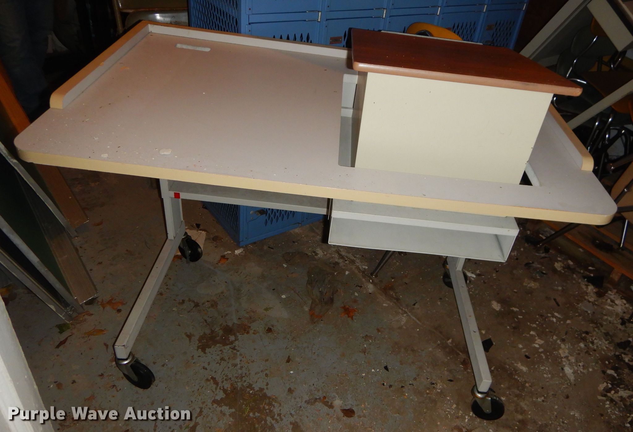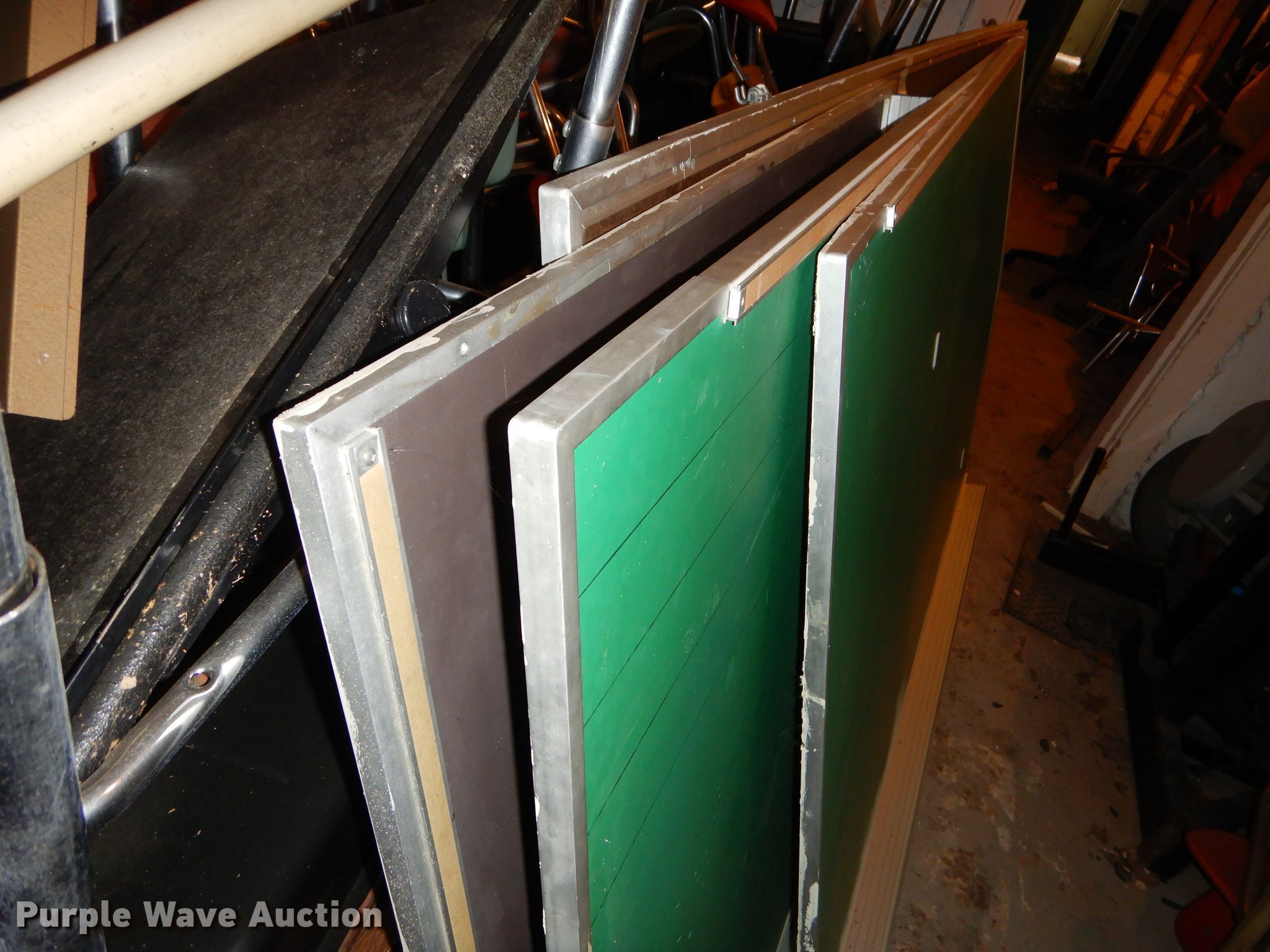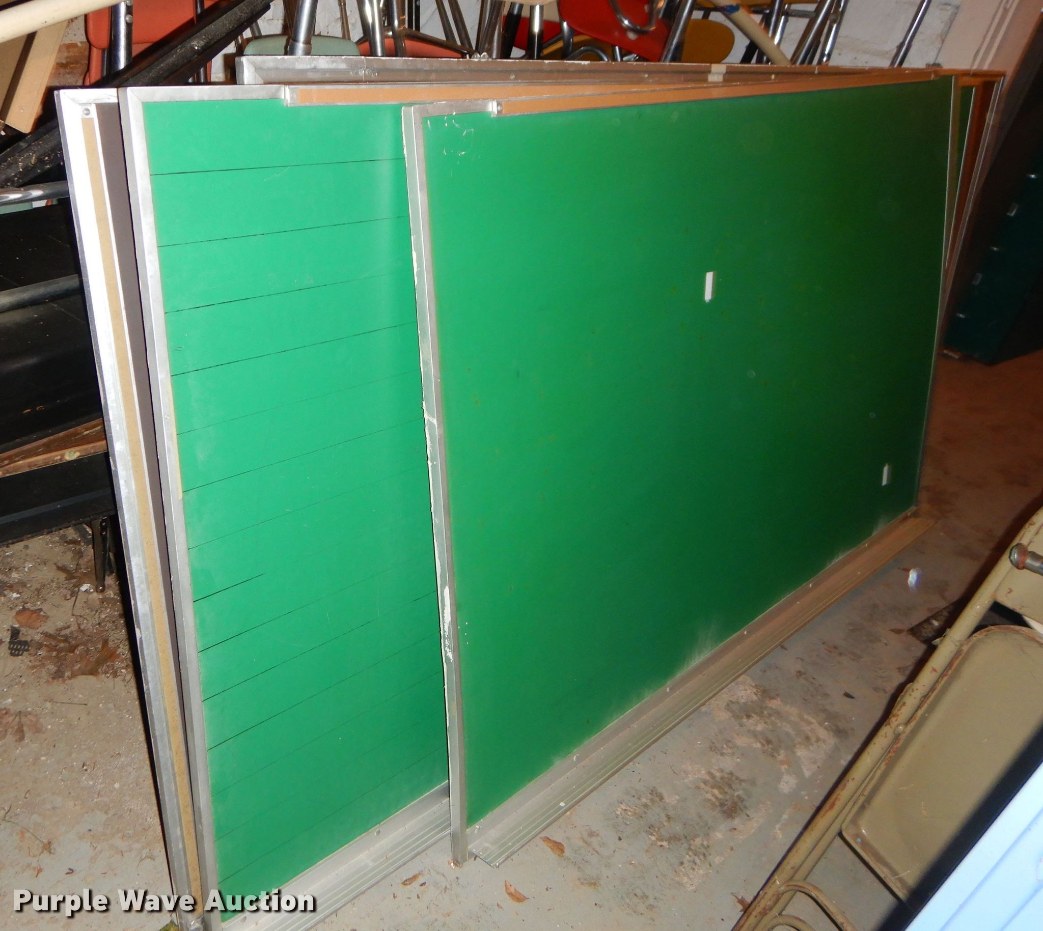 Purple Wave is selling a used Furniture in Kansas. This item is a Office supplies with the following: Metal desks, Chairs, Book shelf, Table, Metal rack, Table with podium, (4) chalk boards