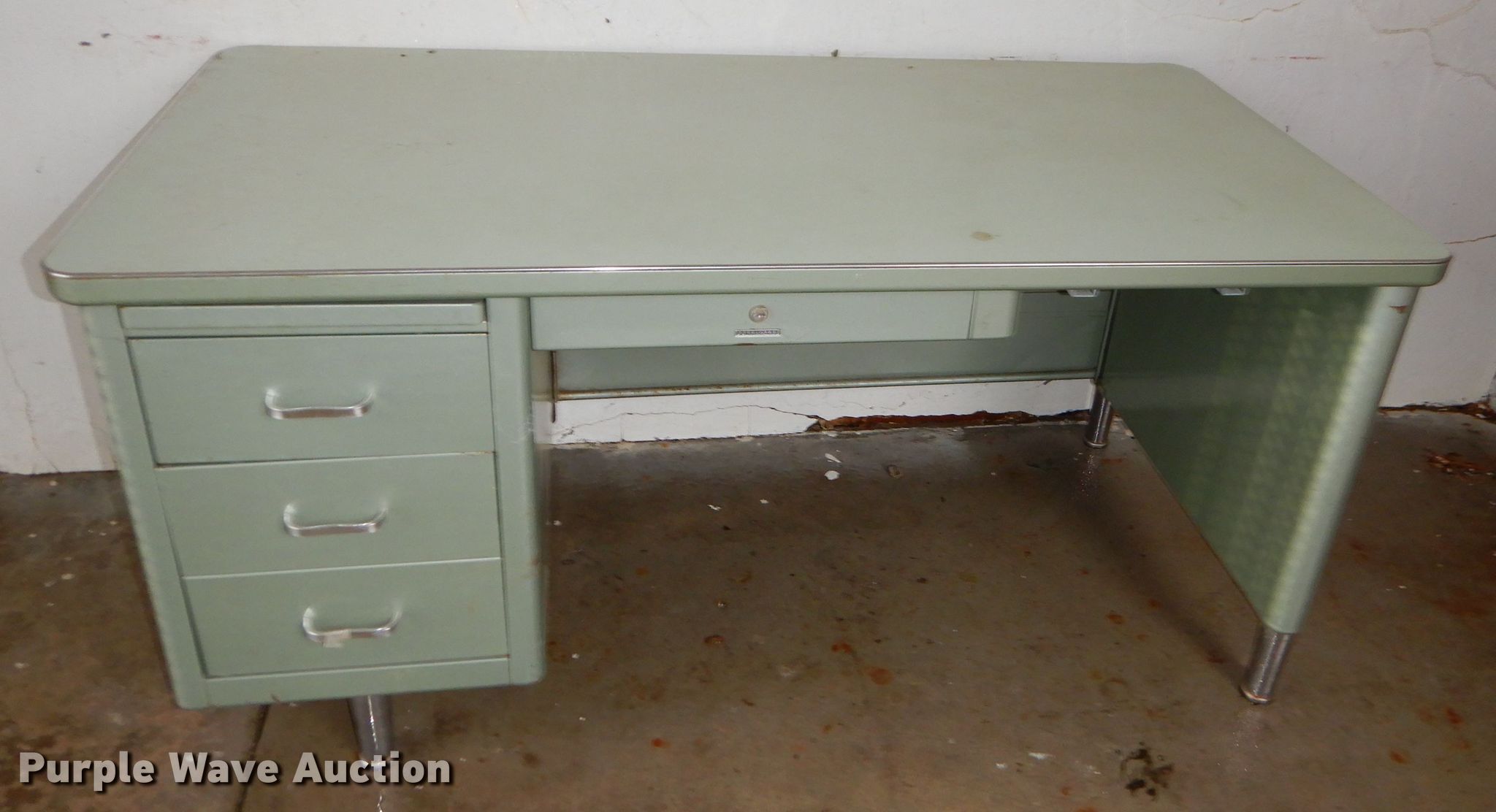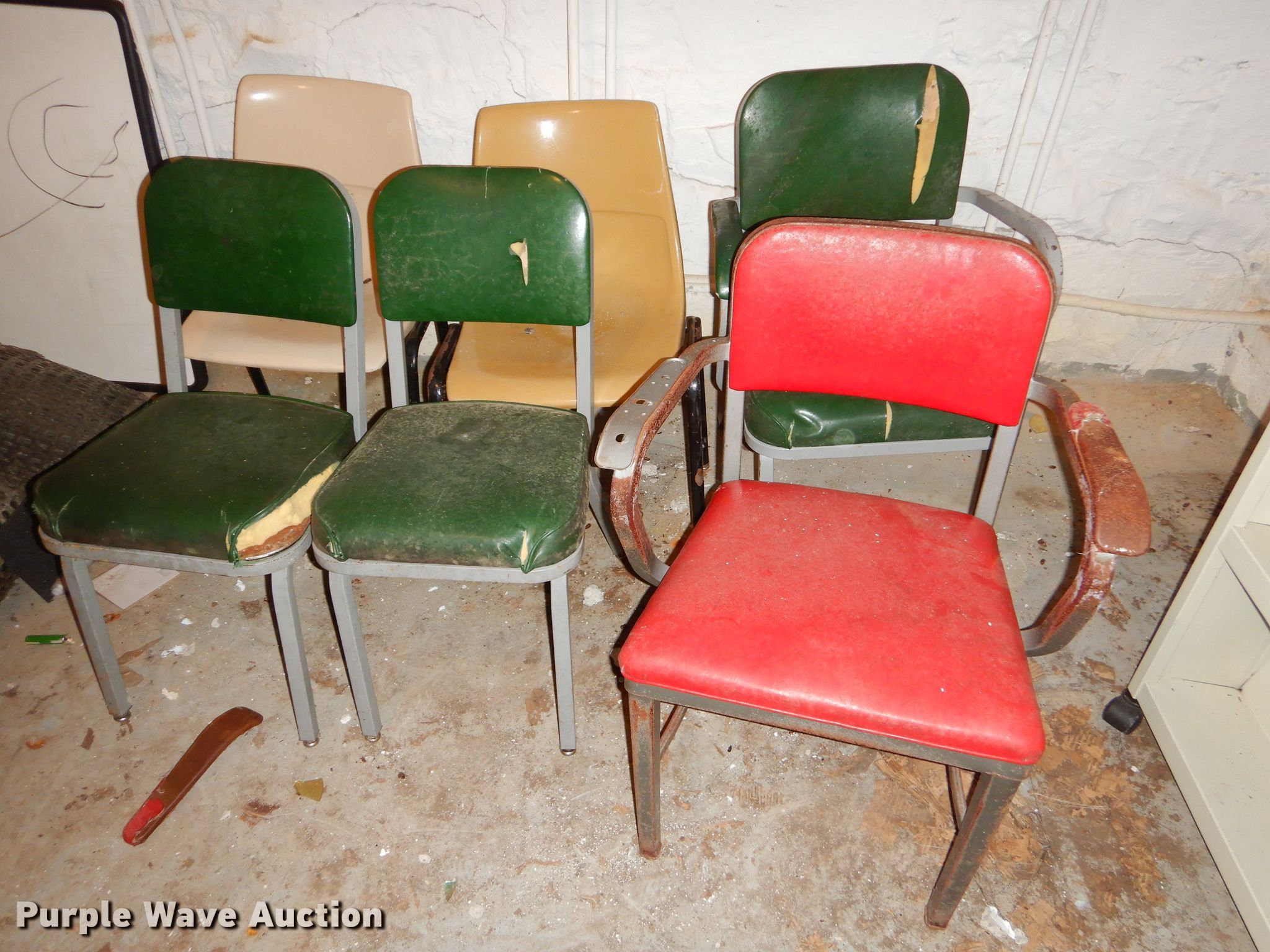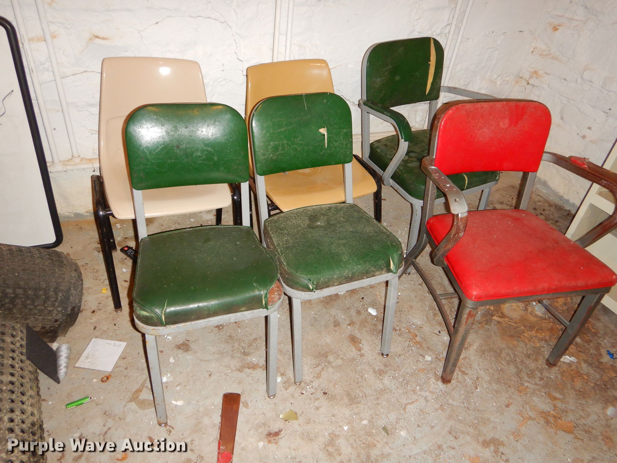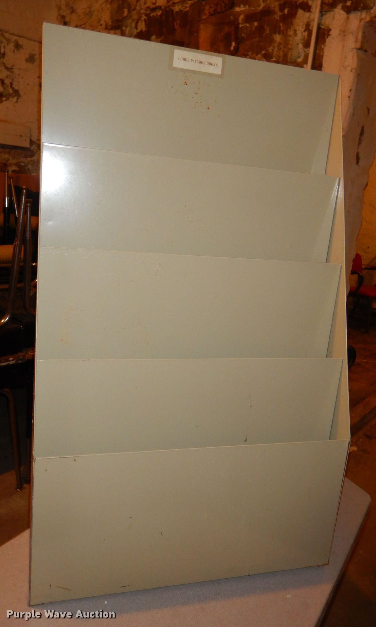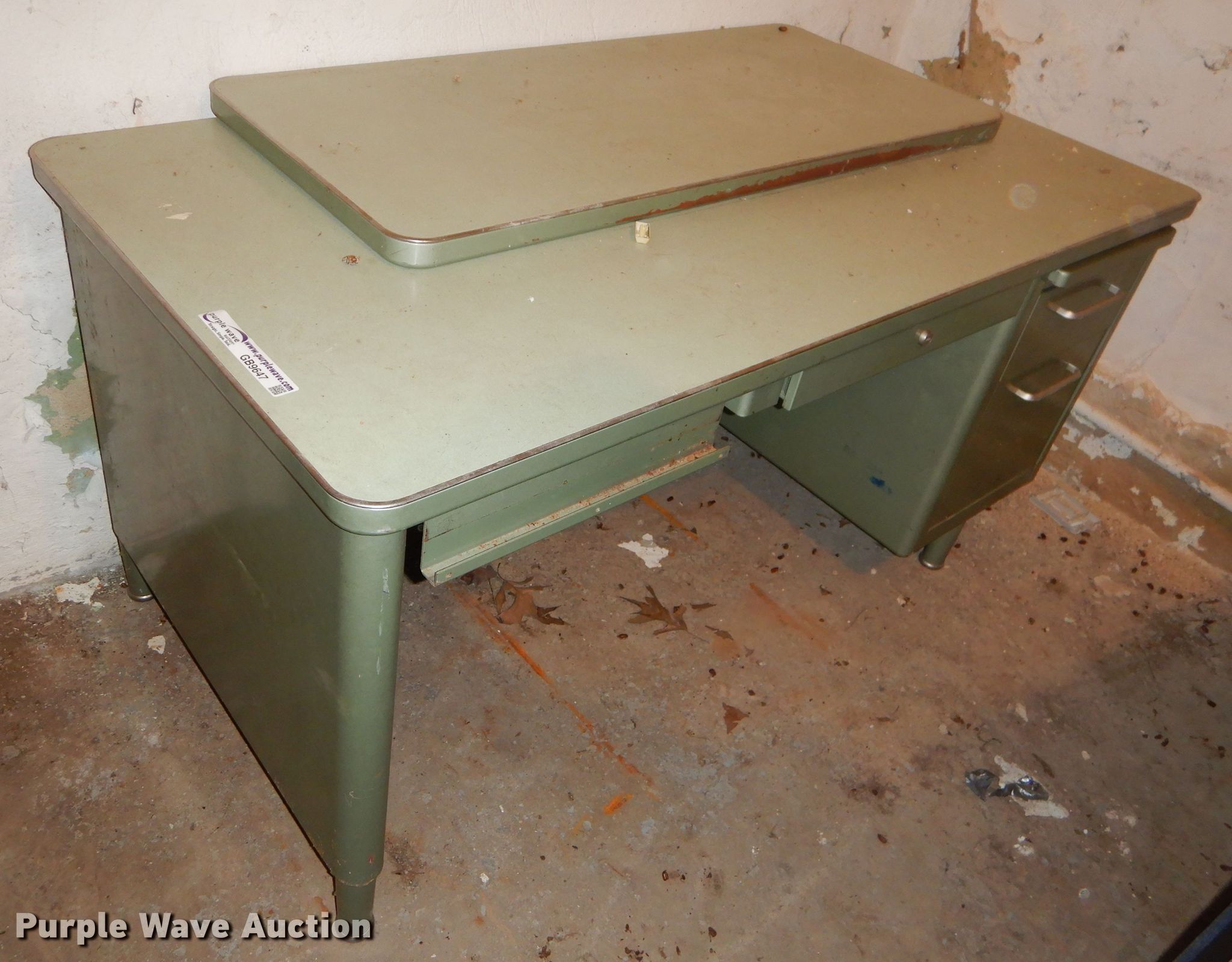 Purple Wave is selling a used Furniture in Kansas. This item is a Office supplies with the following: Metal desks, Chairs, Book shelf, Table, Metal rack, Table with podium, (4) chalk boards