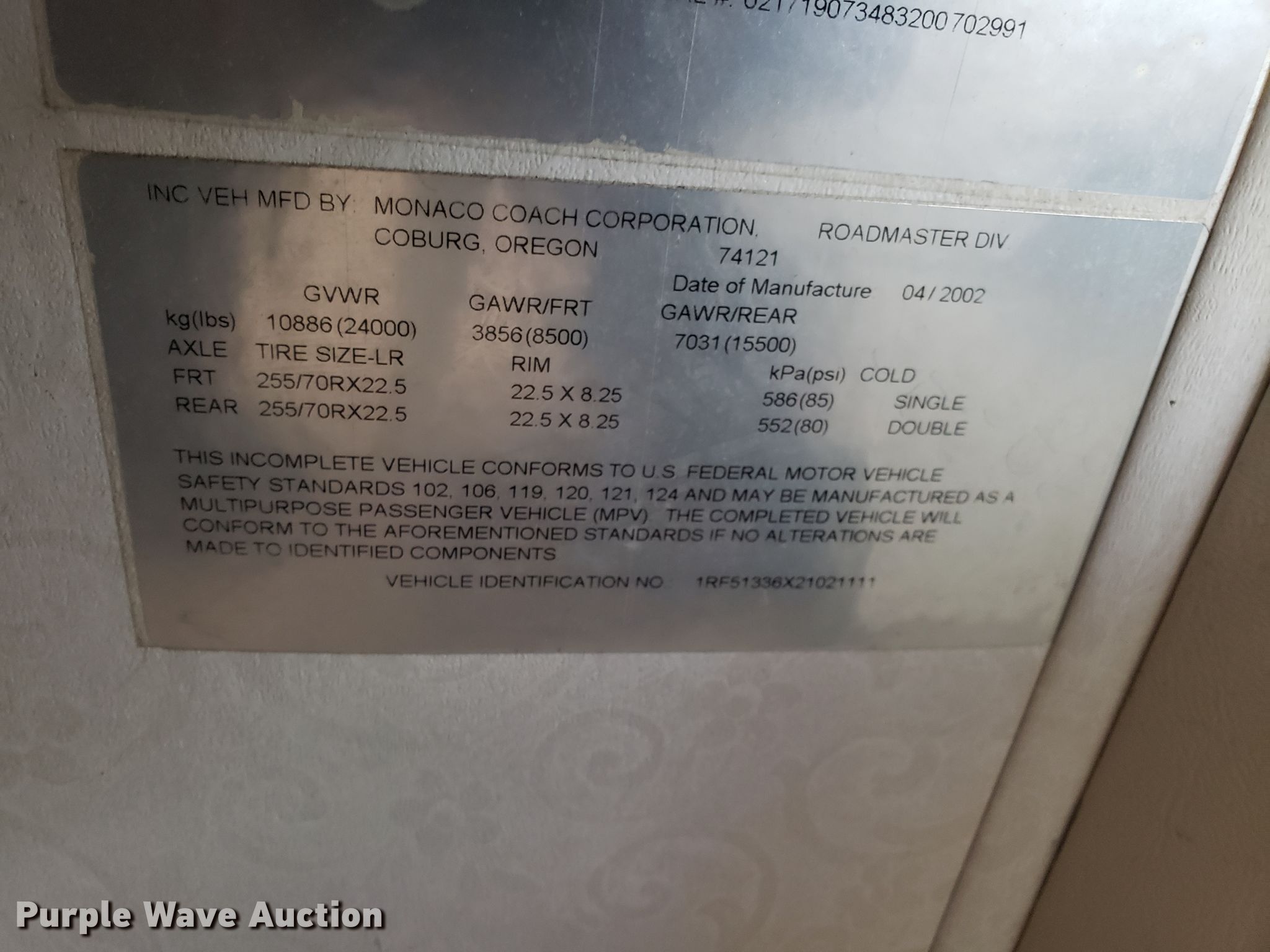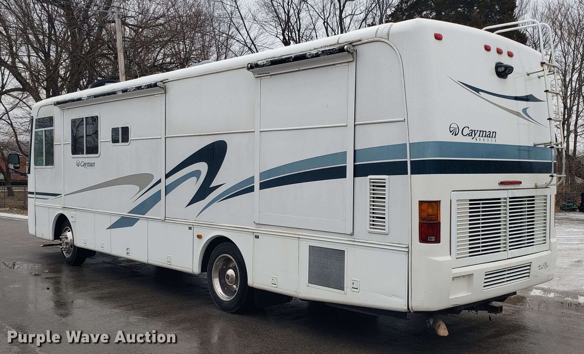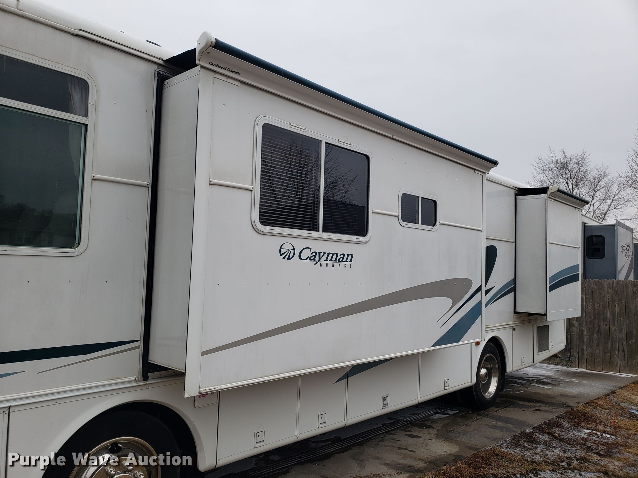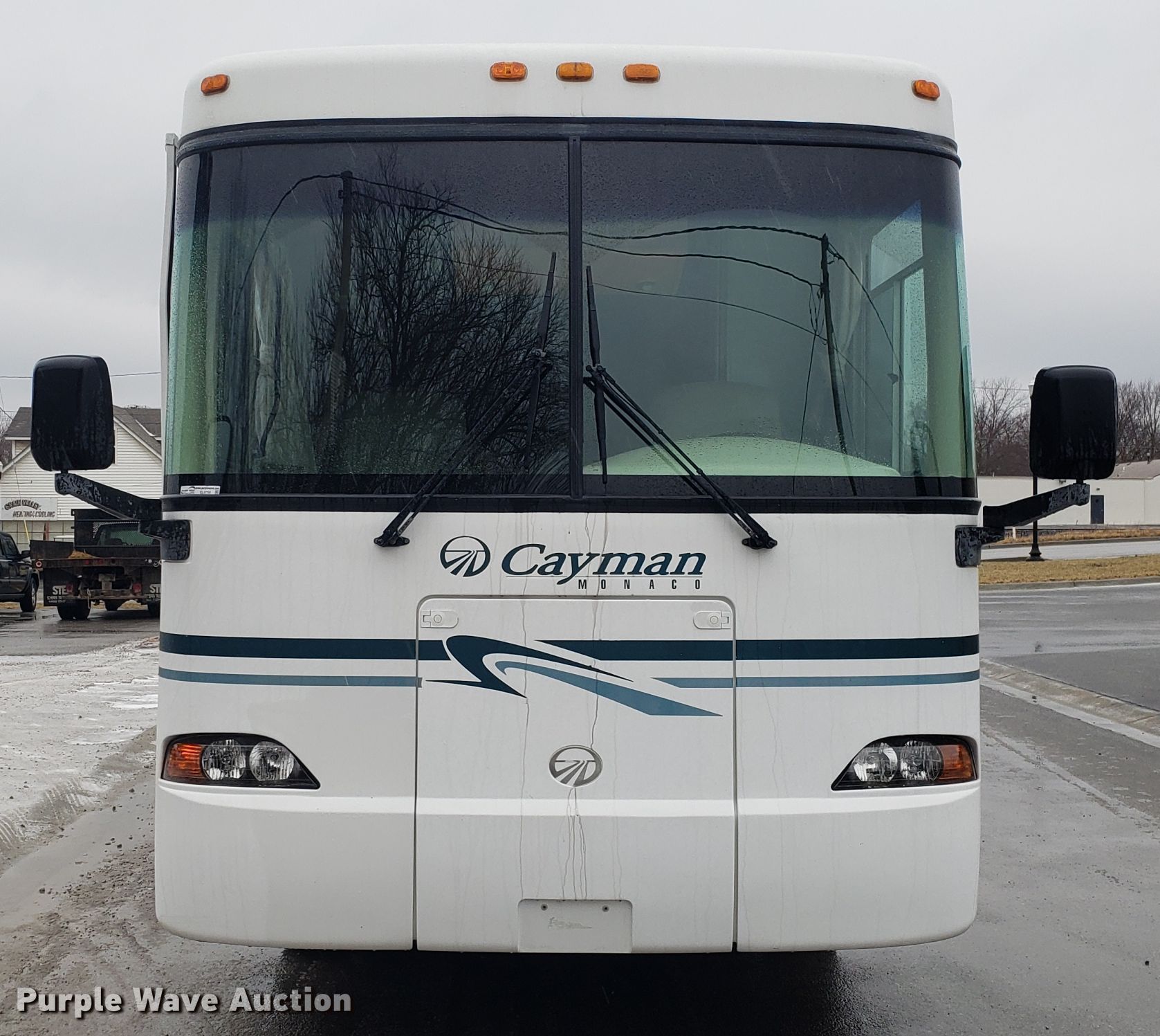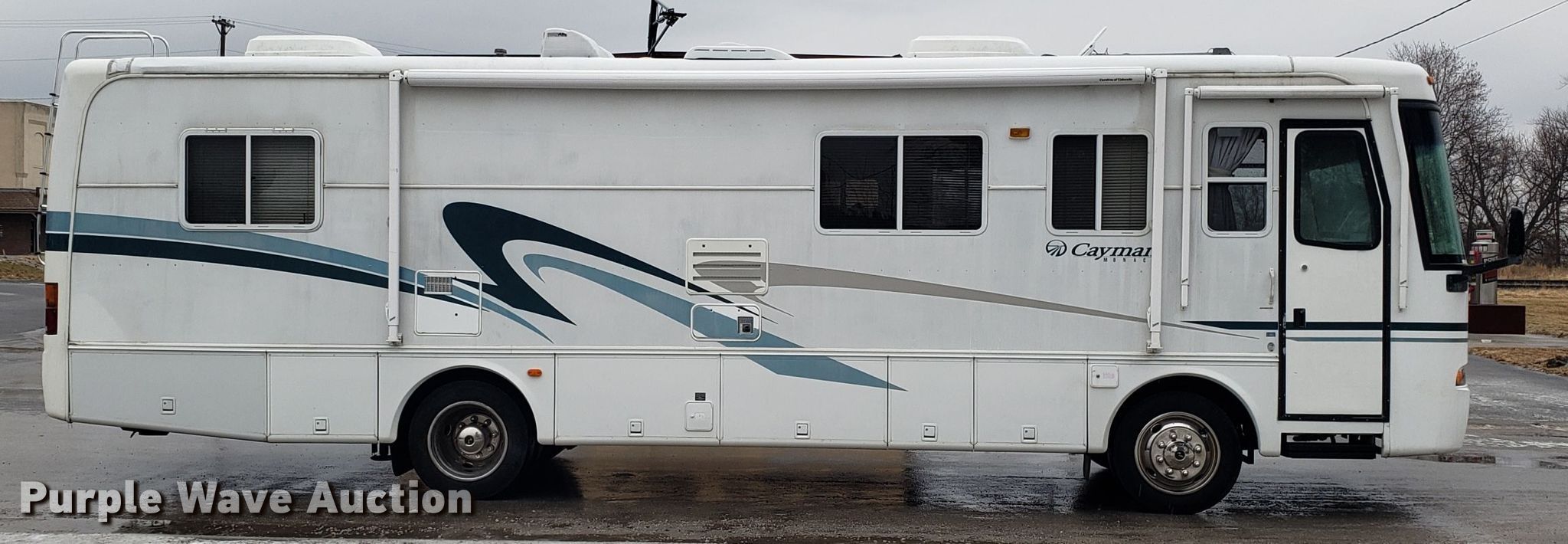 Purple Wave is selling a used RV in Missouri. This item is a 2002 Monaco Cayman RV with the following: 85,162 miles on odometer, Cummins 5.9L L6 diesel engine, Automatic transmission, Single axle, (2) Slide-outs, Awning, Kitchen, Sink, Refrigerator/freezer, Microwave, Propane stove, Living room table, Pull-out couch, Bathroom, Single bed, Heater, (2) AC units, Onan Emerald Advantage 6500 generator, Propane engine, Hydraulic brakes, 225/70R22.5 tires, GVWR 24,000 lbs