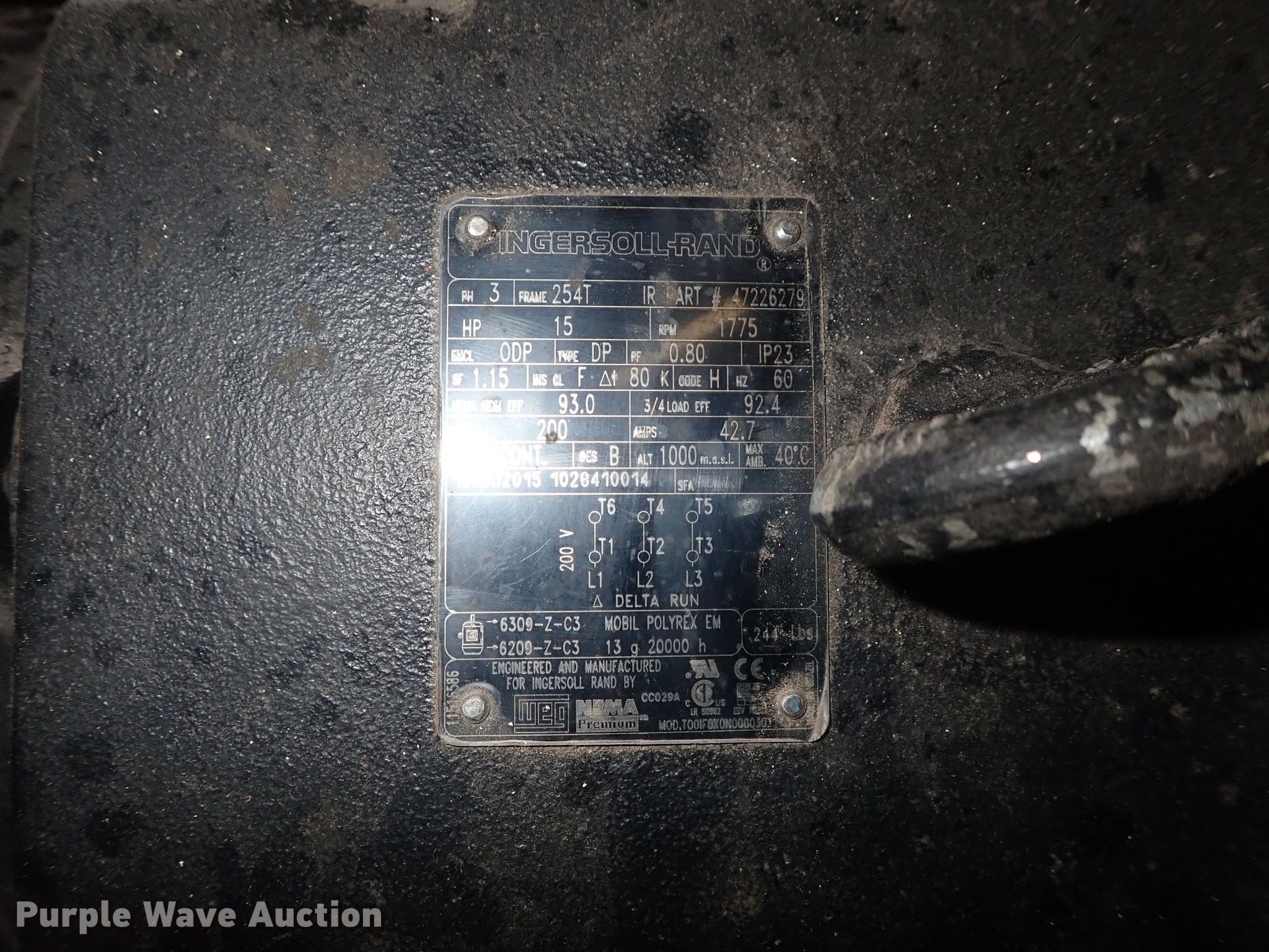 Purple Wave is selling a used Air Compressor in Kansas. This item is a Ingersoll Rand T30 air compressor with the following: Electric motor, 200V, Three phase, 15 HP, 120 gallon steel tank, Approx. 70" x 36" x 60"H overall, Serial 30T860205
