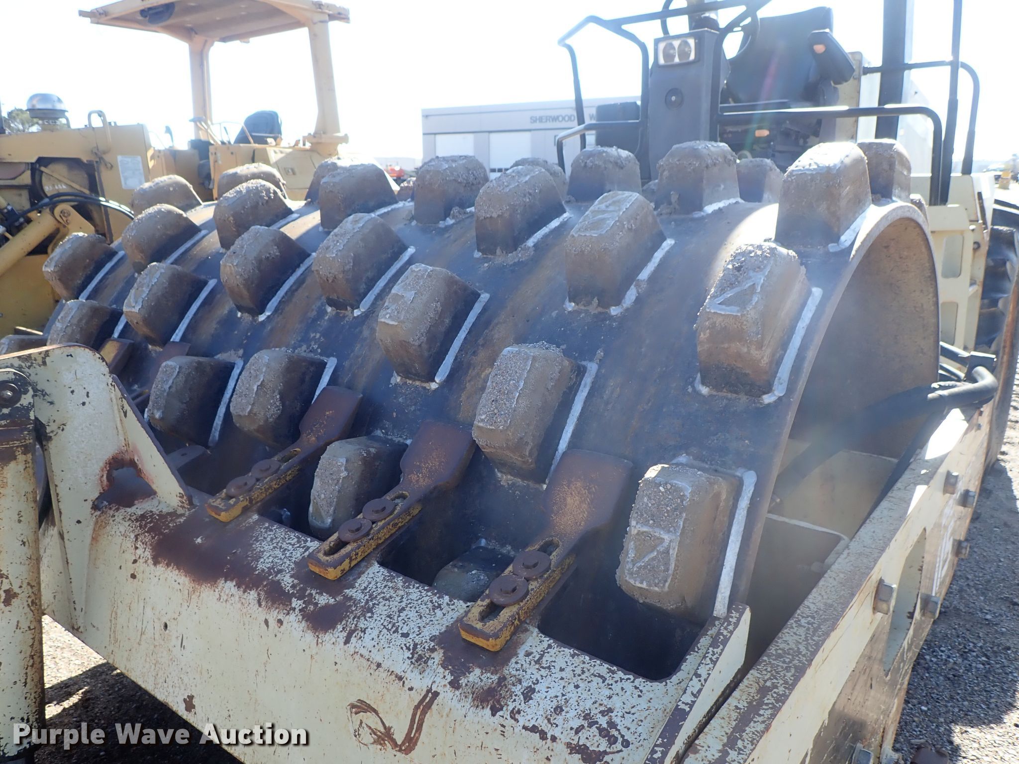1997 Ingersoll Rand SD-115F single drum vibratory roller. 5,714 hours on meter, Cummins six cylinder diesel engine, Hydrostatic transmission, OROPS, 84"W x 59" diameter pad foot drum Two speed vibratory system, 100"W front blade, Steel wheels, 23.1-26 tires, Serial 151568, Unit# 64.07L. Sherwood Construction Company. 3219 W May St. Wichita, KS 67213