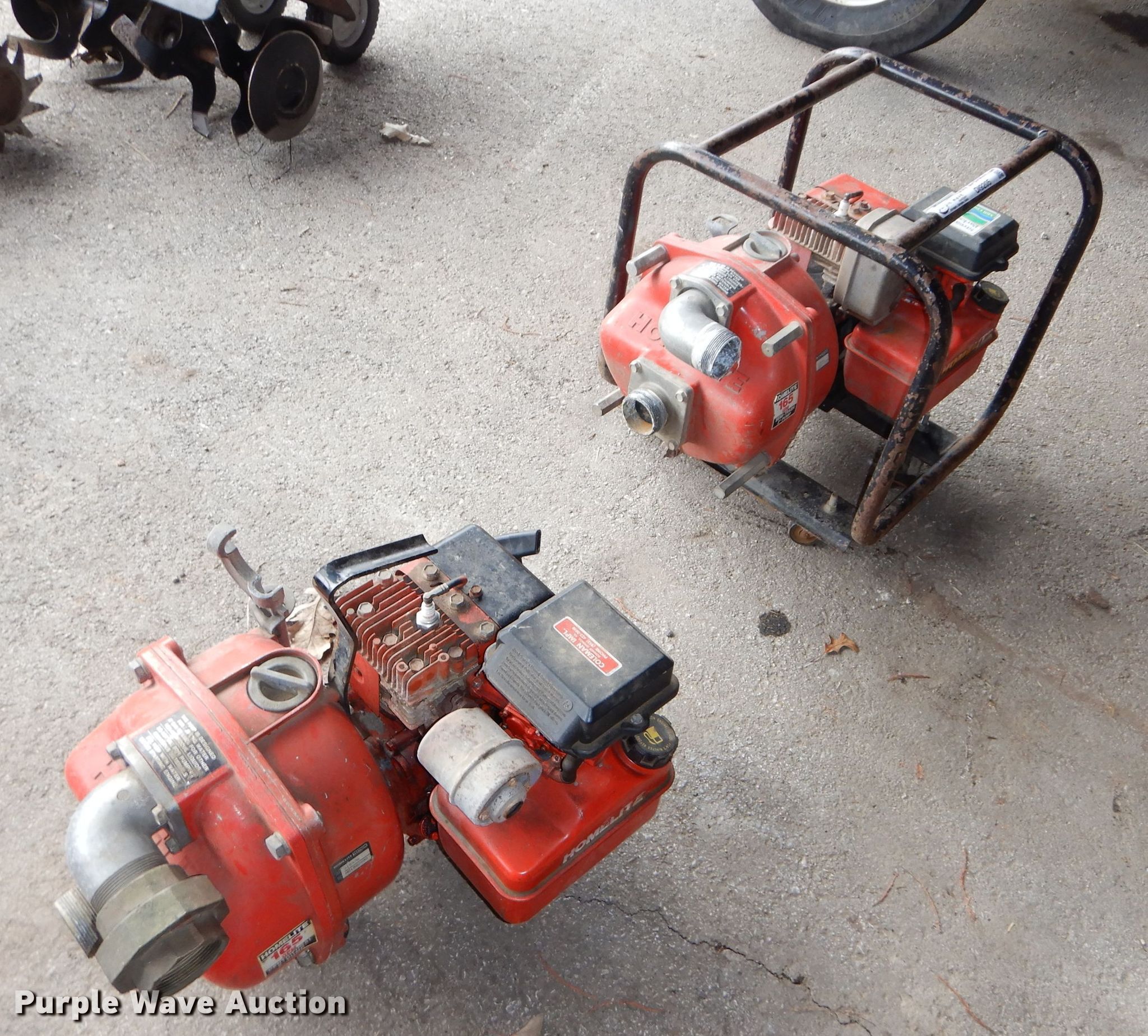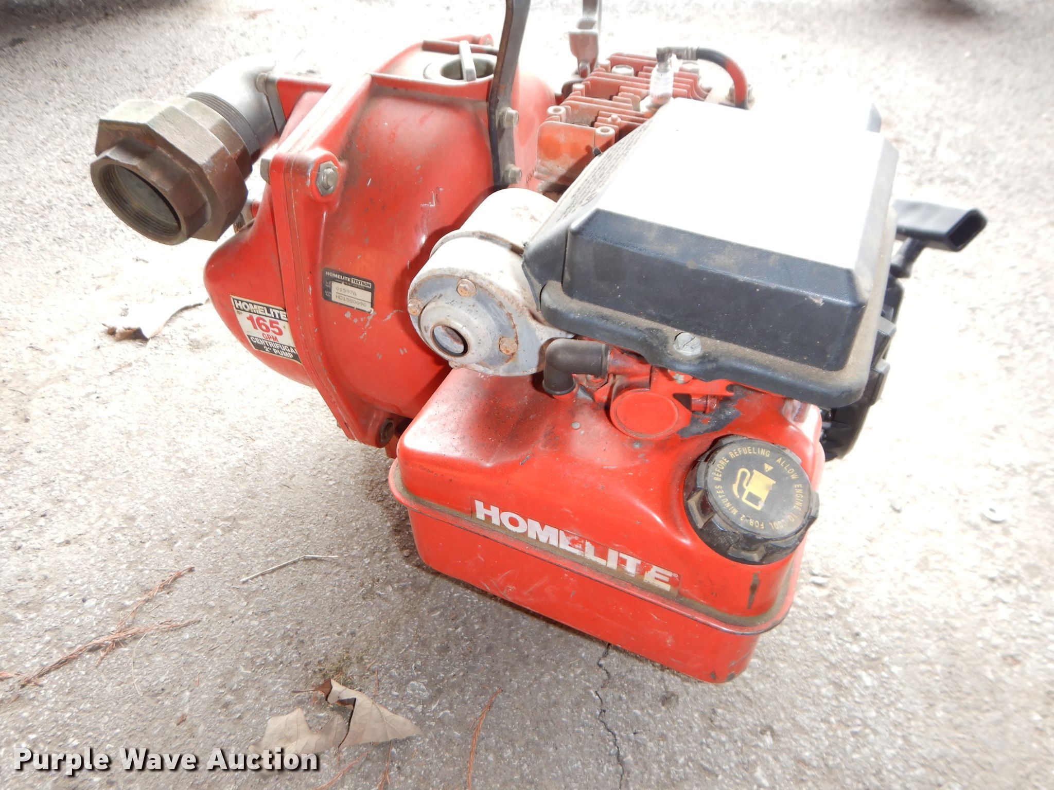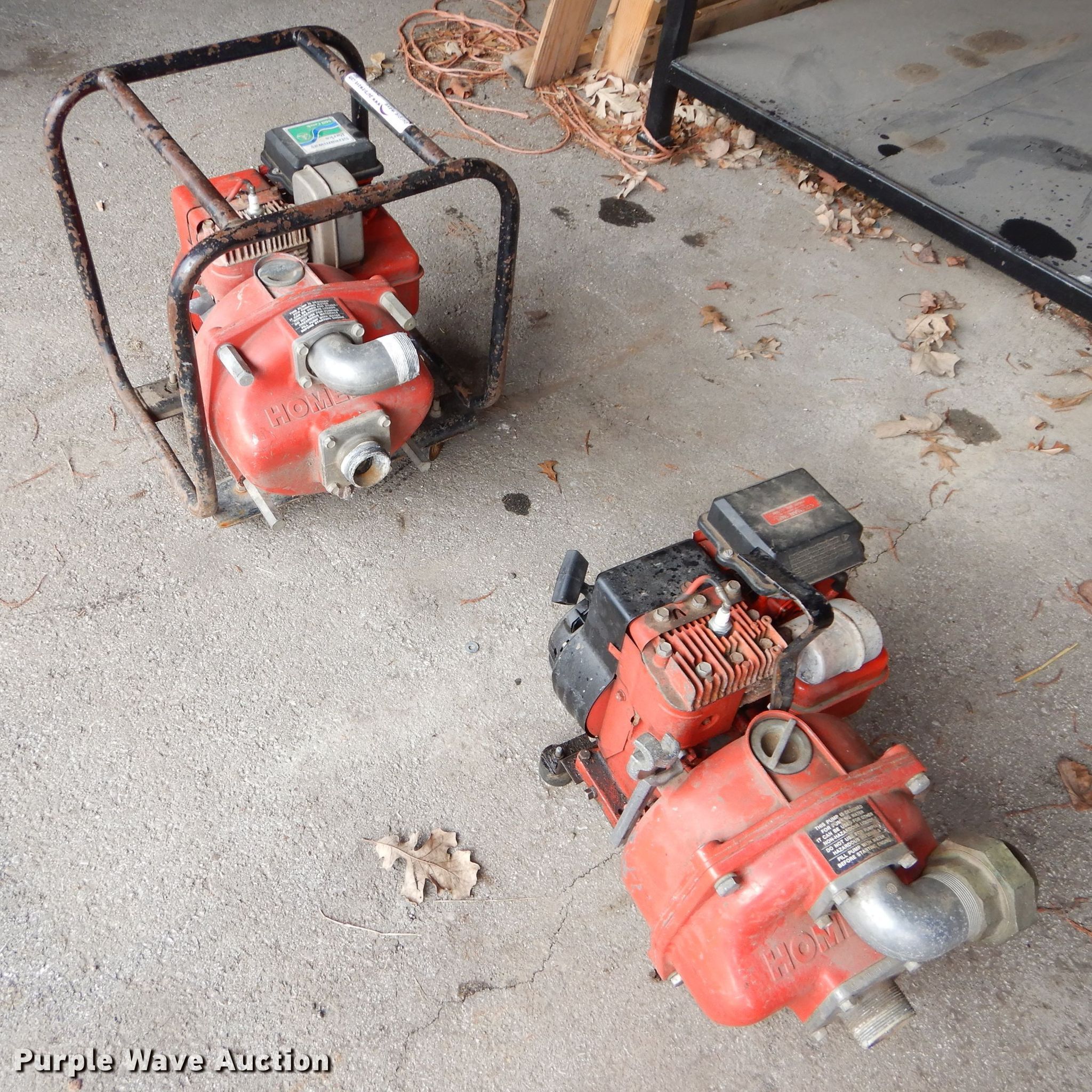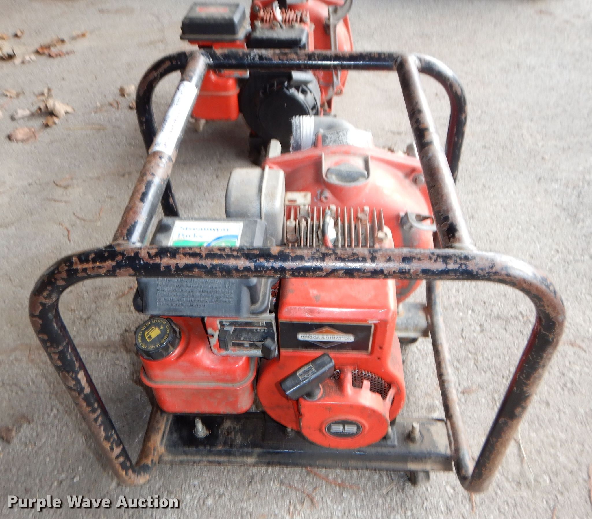 Purple Wave is selling a used Pump in Kansas. This item is a (2) Homelite water pumps with the following: Briggs & Stratton gas engines, 3.5 HP, 165 gallon per minute capacity, 2" inlet/outlet, No hoses