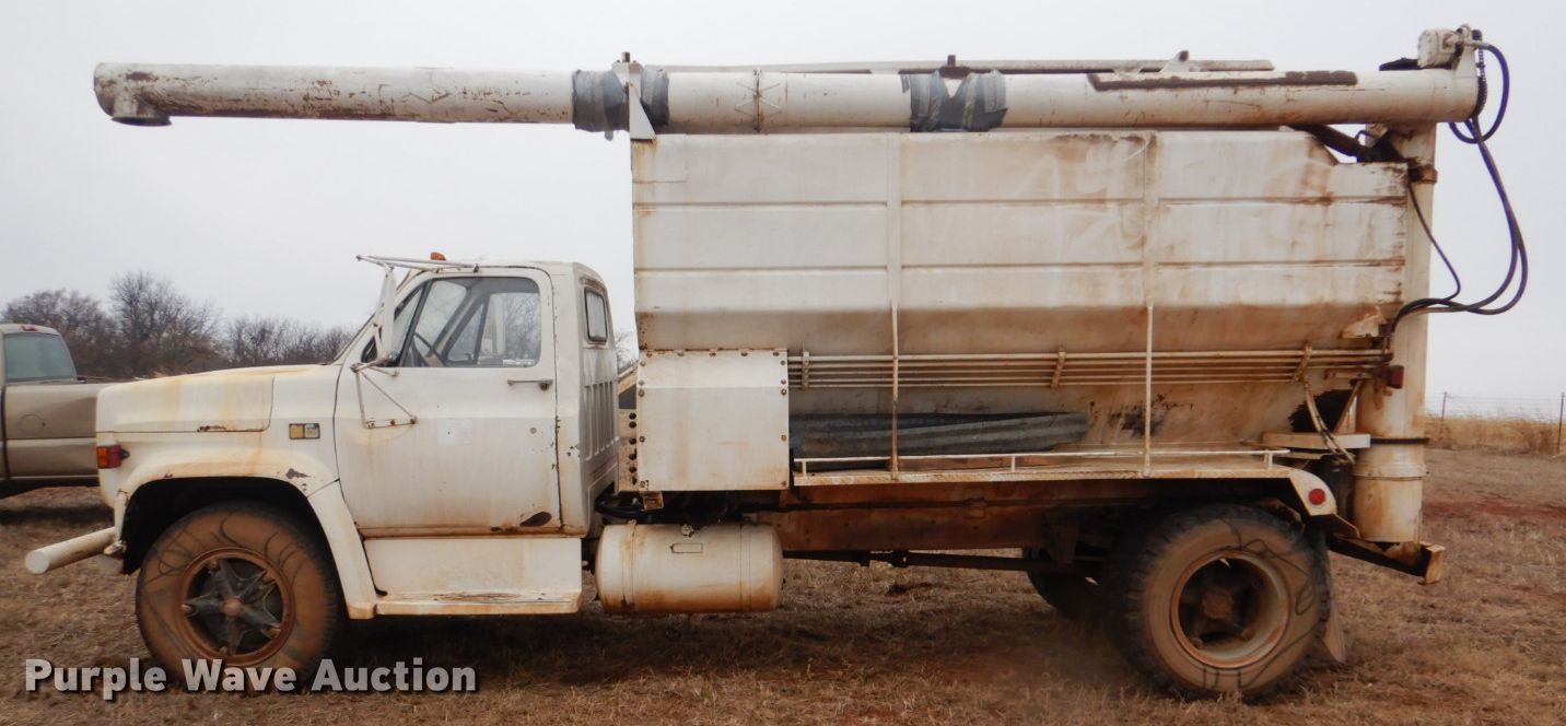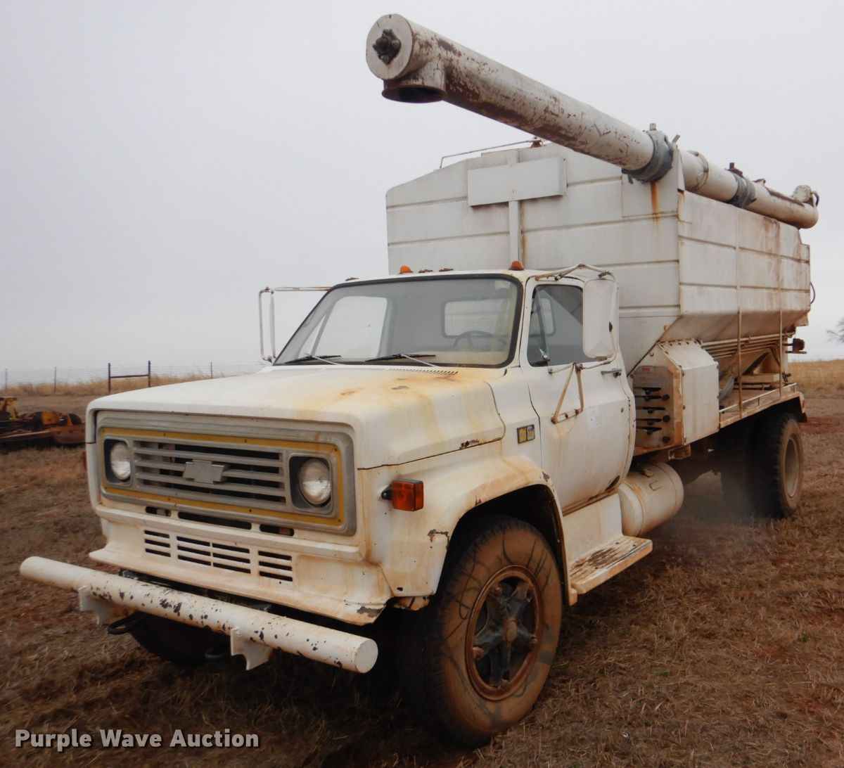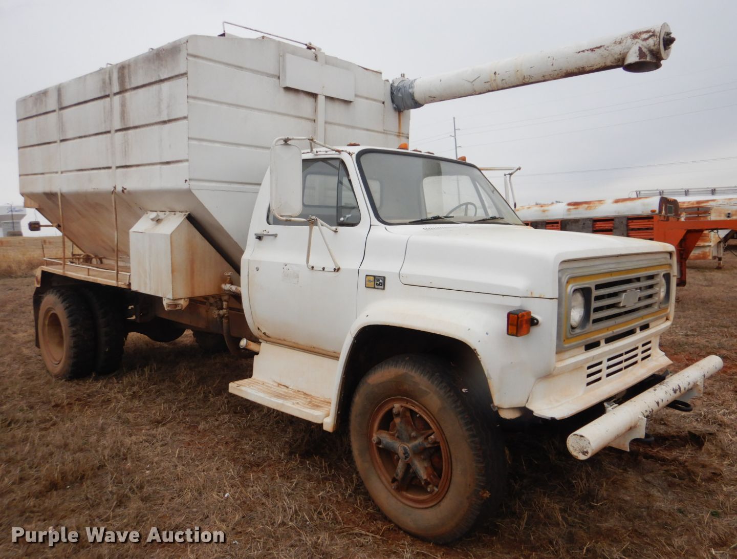 Purple Wave is selling a used Fertilizer or Feed Delivery Truck in Oklahoma. This item is a 1980 Chevrolet CC65042 feed delivery tuck with the following: 91,242 miles on odometer, 350 C.I.D. V8 gas engine, Five speed manual transmission, Two speed rear end, Single axle, AC and heat, PTO, Henderson Manufacturing 12FTB300R feed delivery bed, 12'L, Single compartment, Chief B-330-R feed body, Rear discharge auger, Ground controls, Serial 1830, Spring suspension, Hydraulic brakes, Gladiator 9.0-20 tires, Sale# 2025-KP, Unit# 532