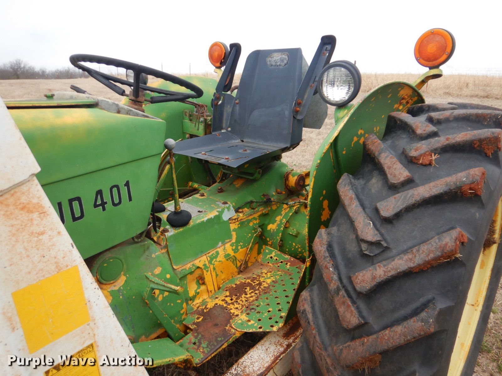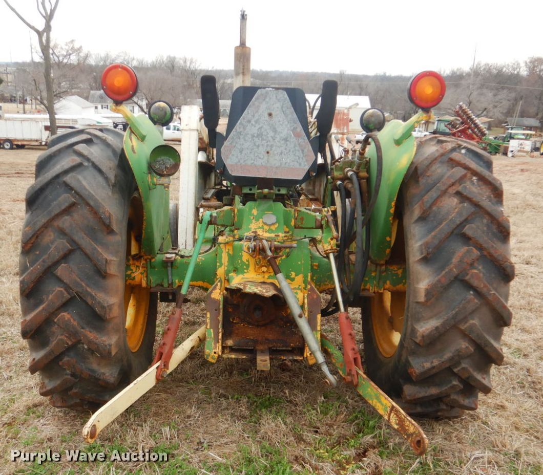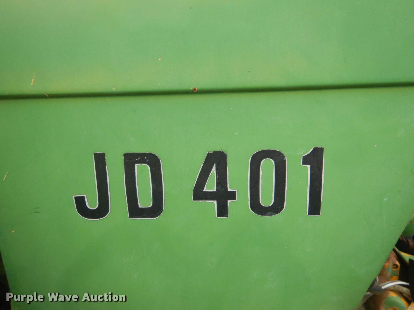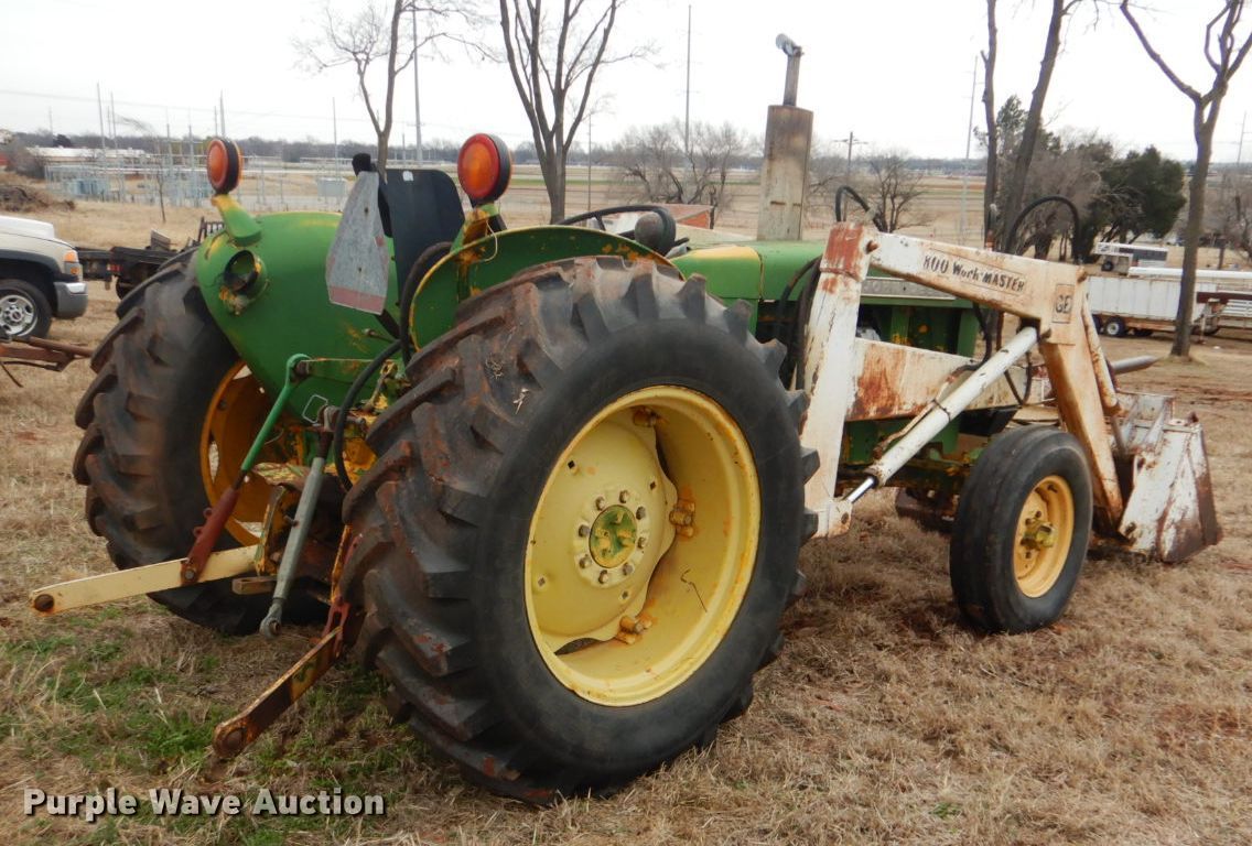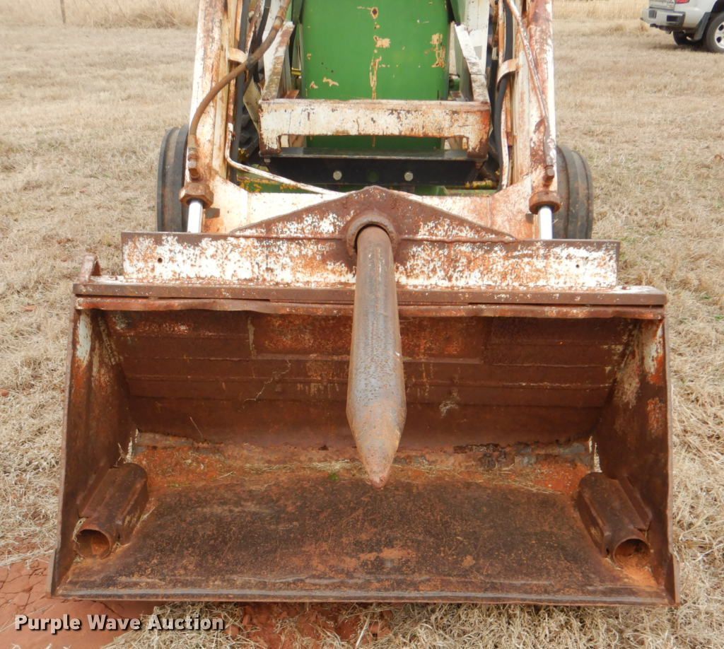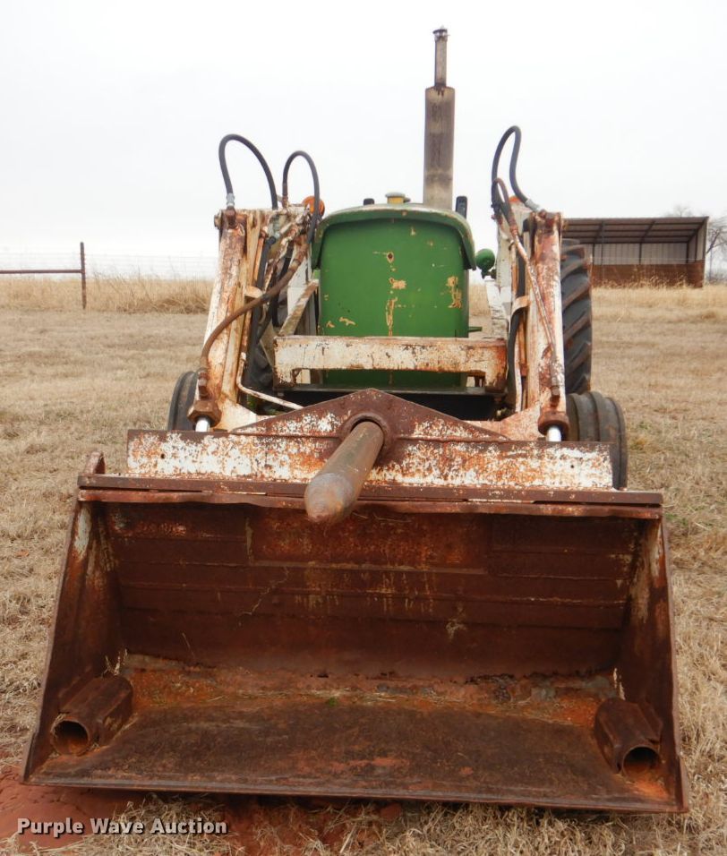 Purple Wave is selling a used Tractor in Oklahoma. This item is a John Deere 401 tractor with the following: 1,887 hours on meter, John Deere 3.3L four cylinder diesel engine, 59 HP, Manual transmission, 8F-4R gears, Work Master 800 loader, 55"W self-leveling bucket, Bale spear, Two lever controls, 540 PTO, Three point, Top link, 7.5-16 front tires, 14.9-28 rear tires, Sale# 2026-KP, Serial 144210