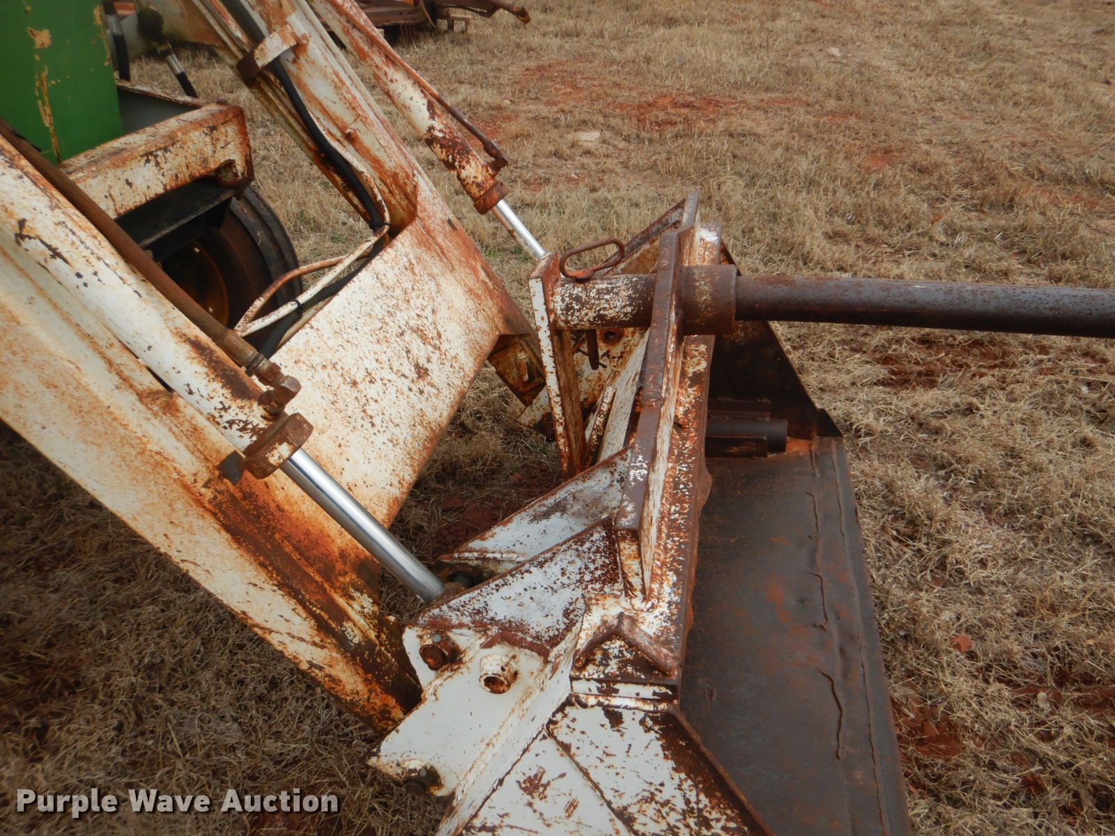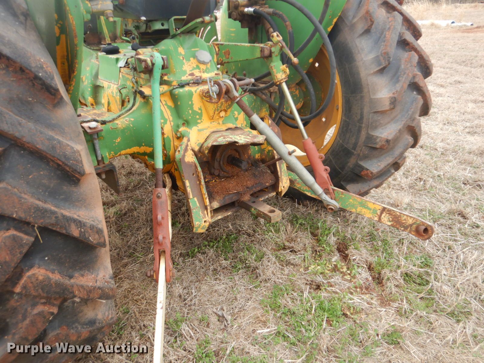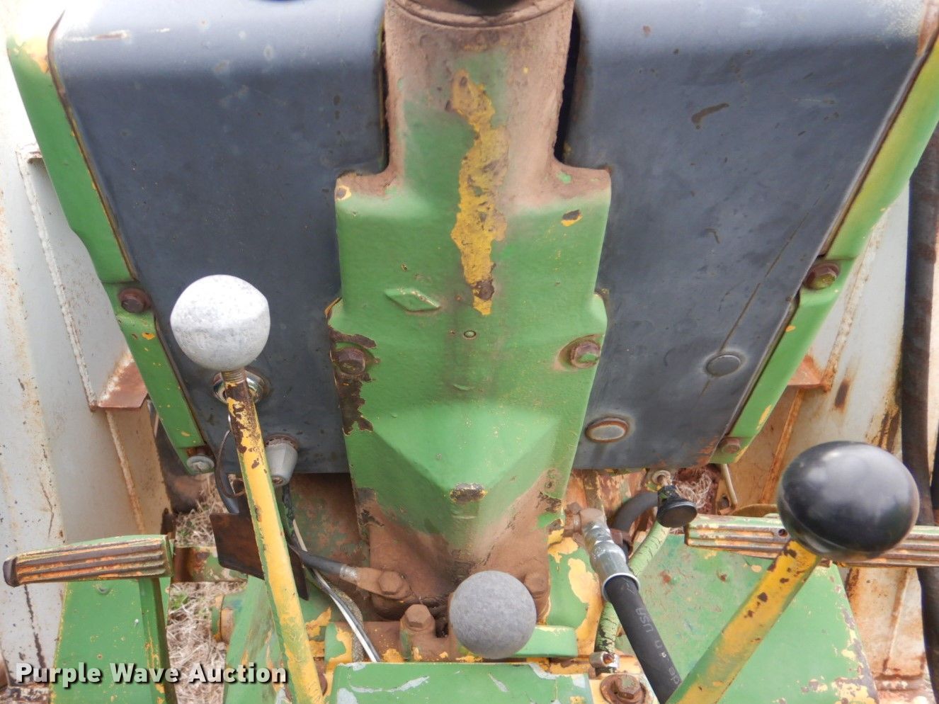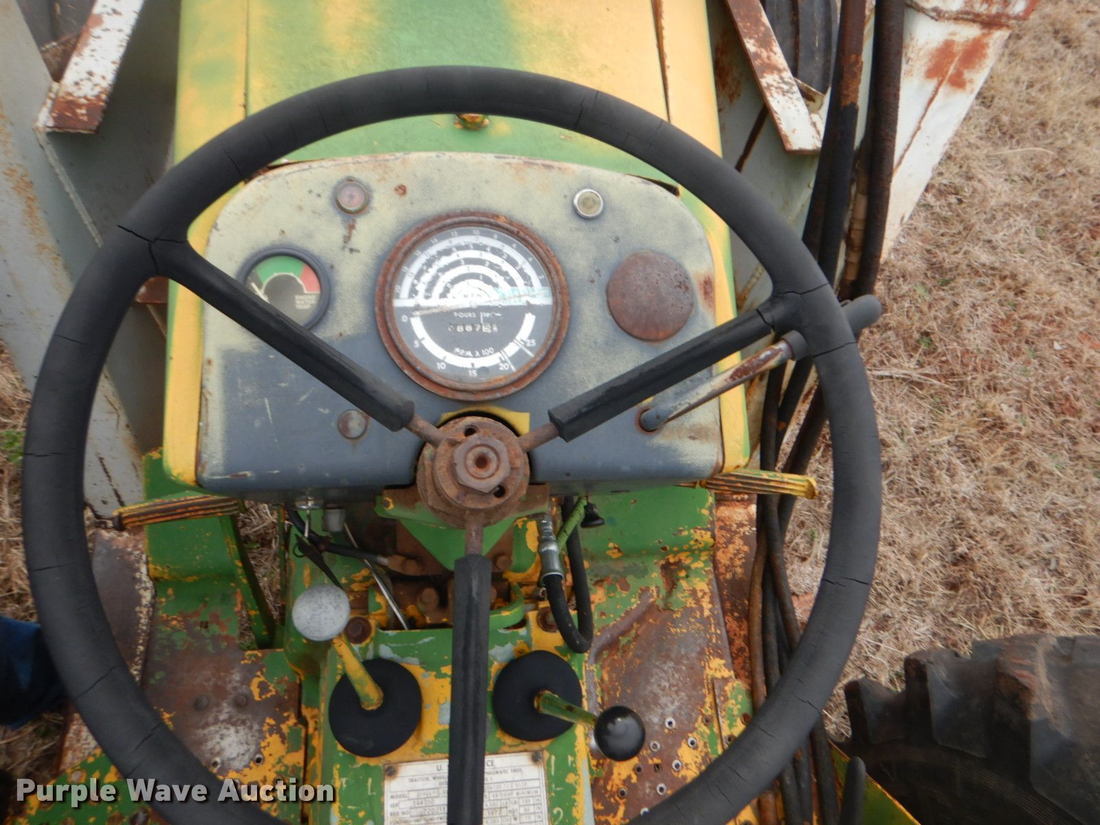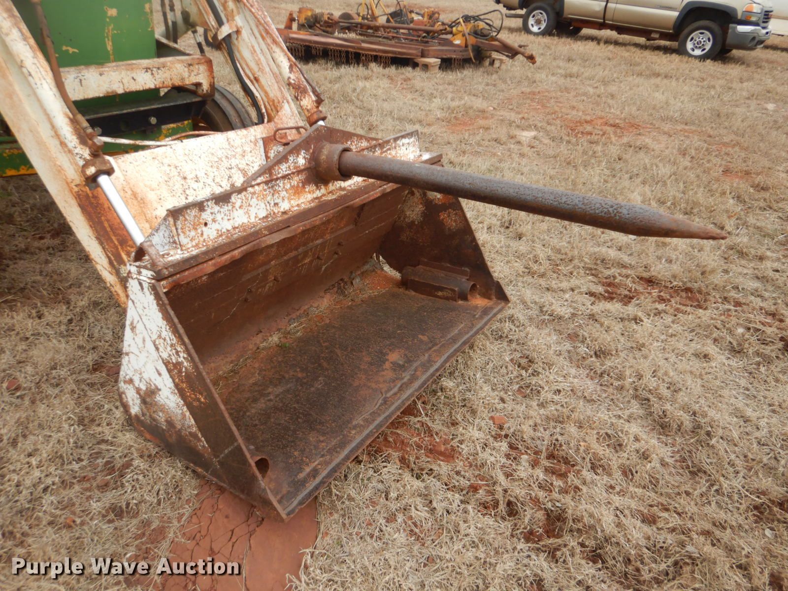 Purple Wave is selling a used Tractor in Oklahoma. This item is a John Deere 401 tractor with the following: 1,887 hours on meter, John Deere 3.3L four cylinder diesel engine, 59 HP, Manual transmission, 8F-4R gears, Work Master 800 loader, 55"W self-leveling bucket, Bale spear, Two lever controls, 540 PTO, Three point, Top link, 7.5-16 front tires, 14.9-28 rear tires, Sale# 2026-KP, Serial 144210