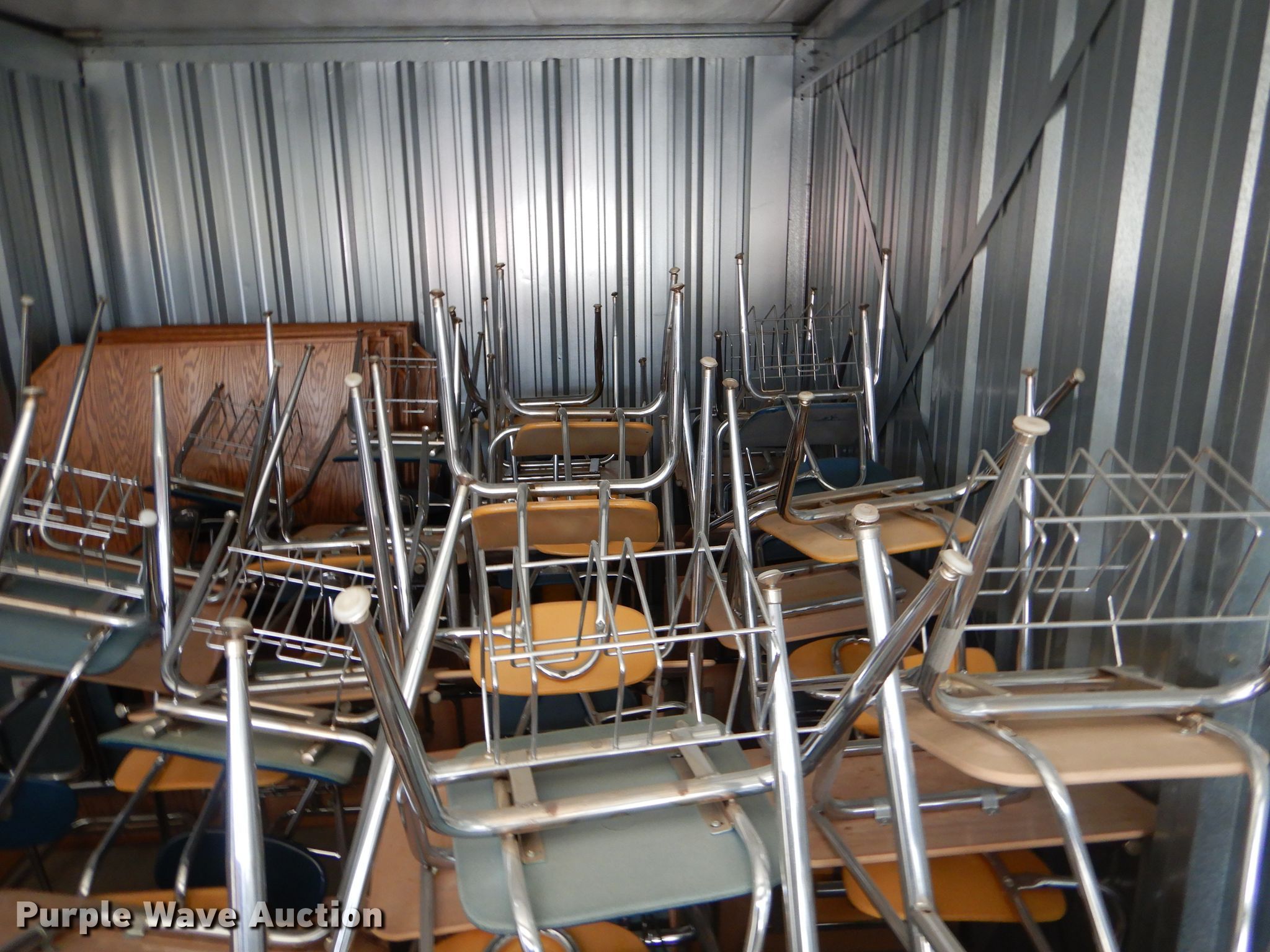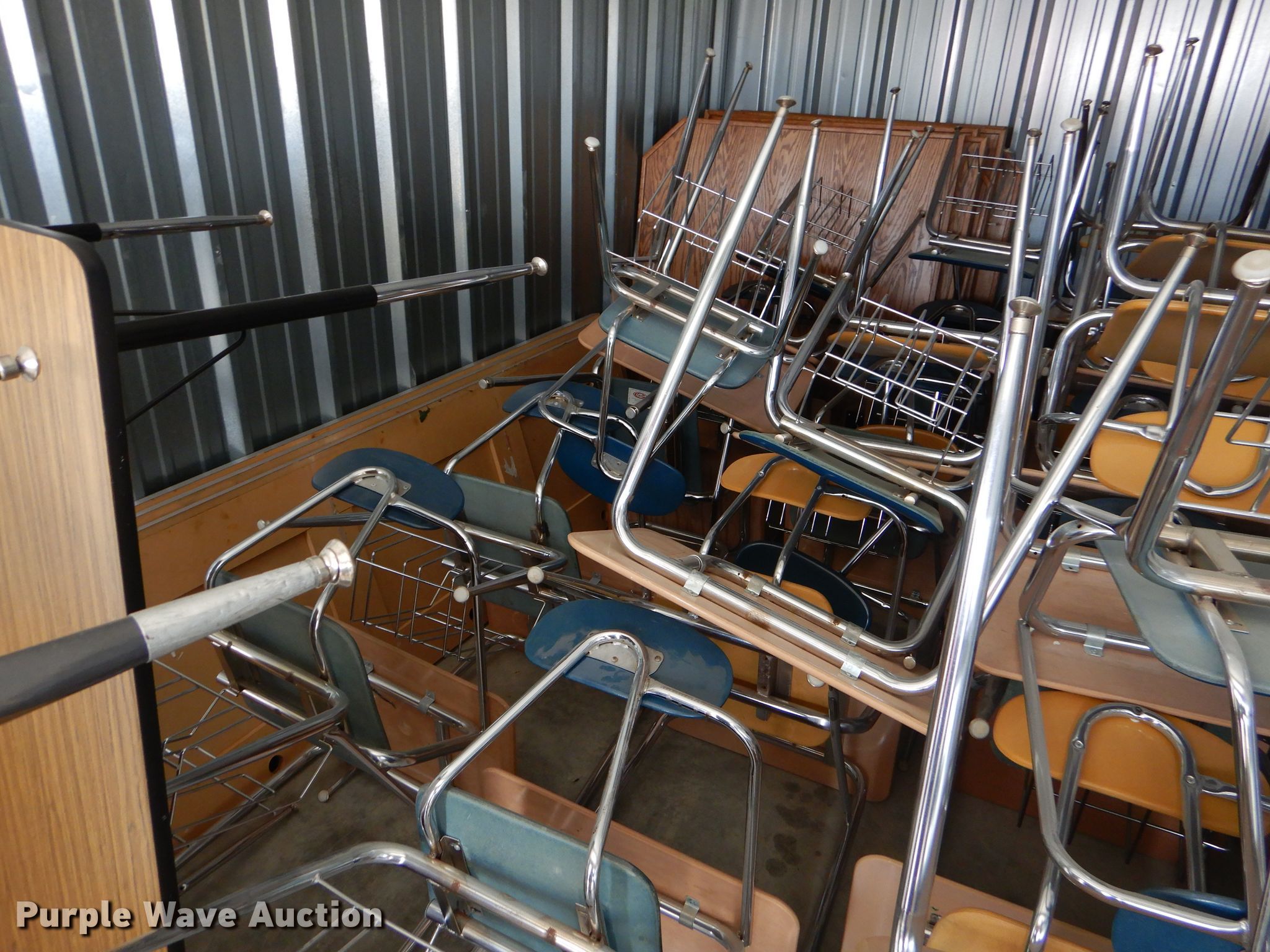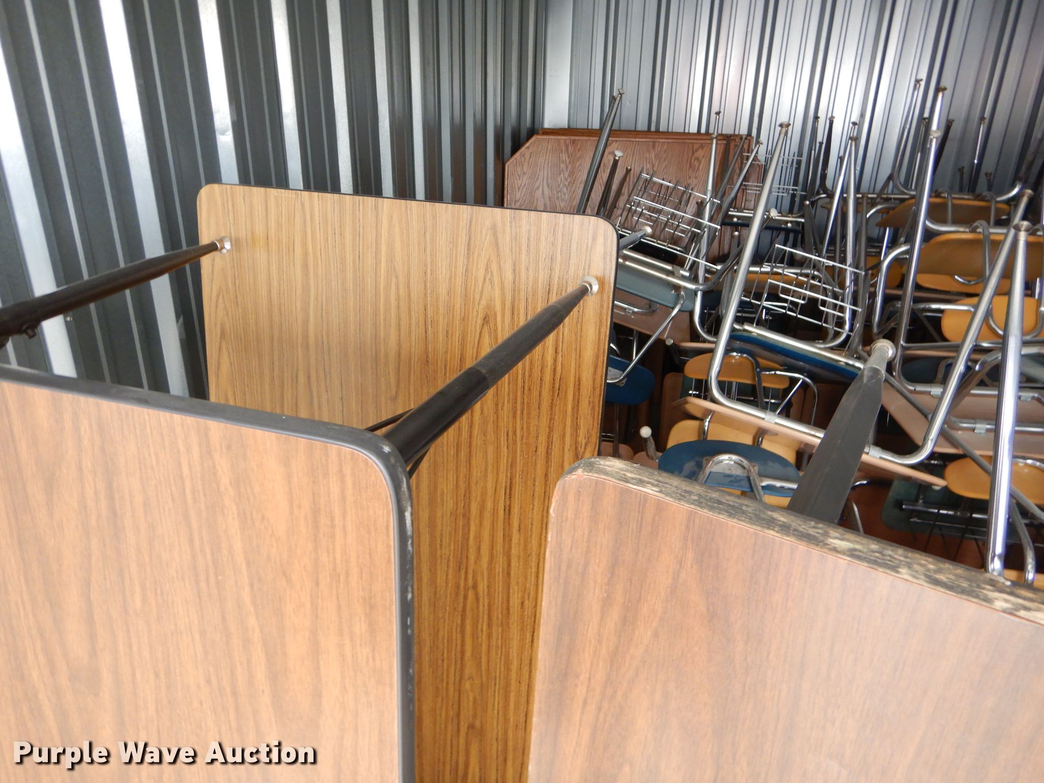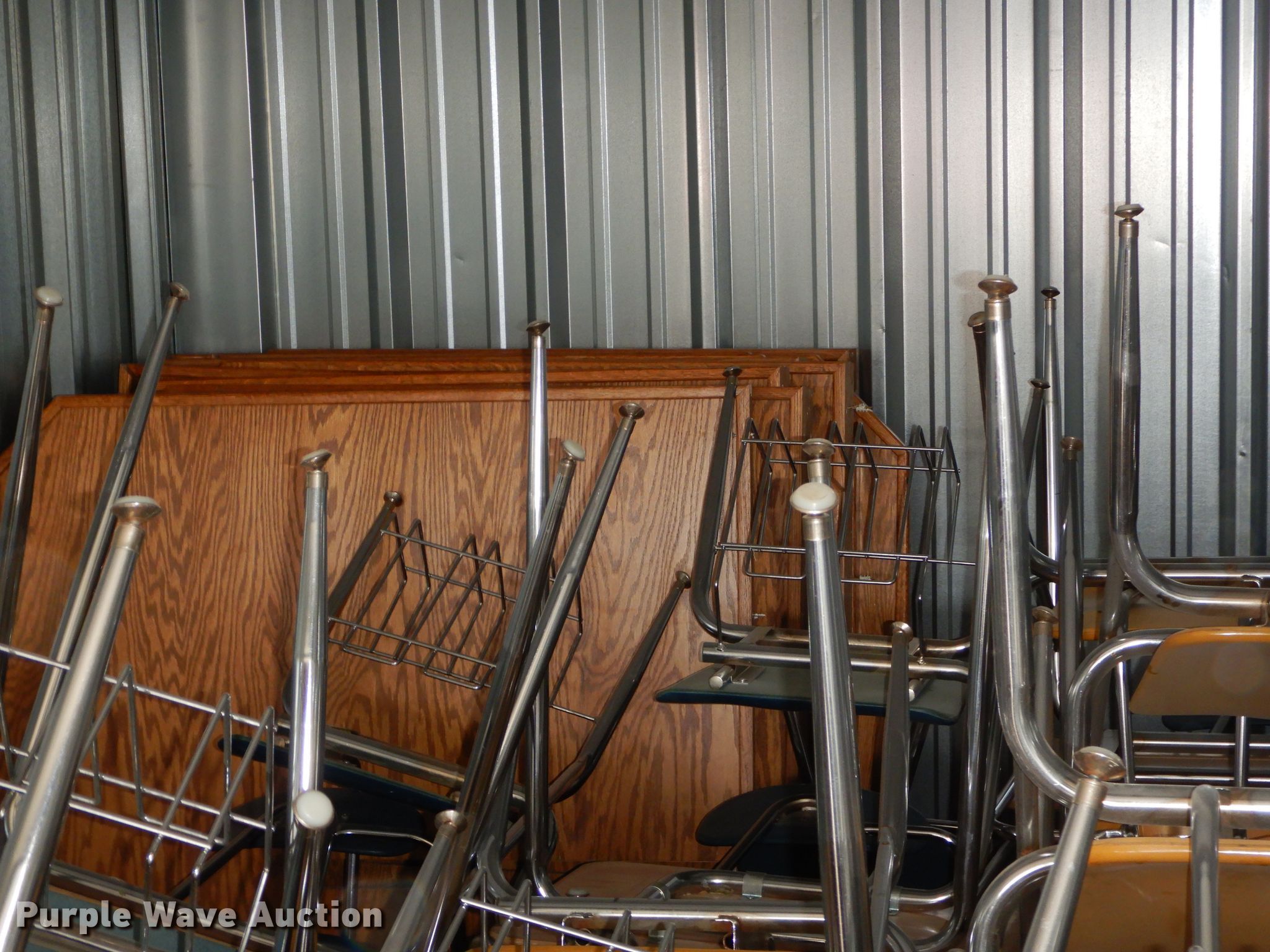 Purple Wave is selling a used Furniture in Kansas. This item is a Furniture with the following: (35) desks, (15) 5' desks, (12) counter tops, Metal table legs, (8) oak dividers, Approximately 40 chairs