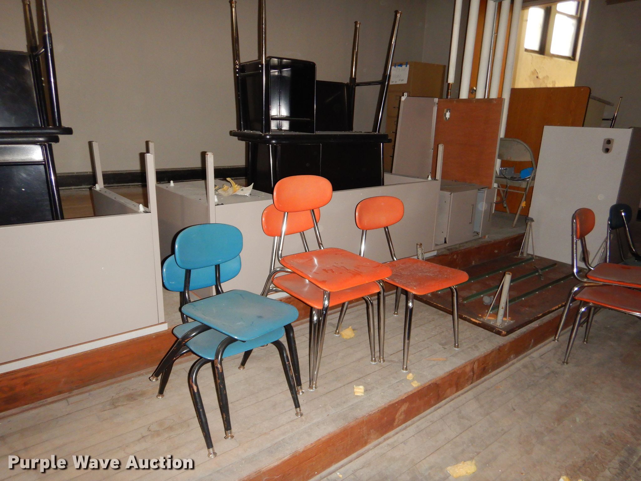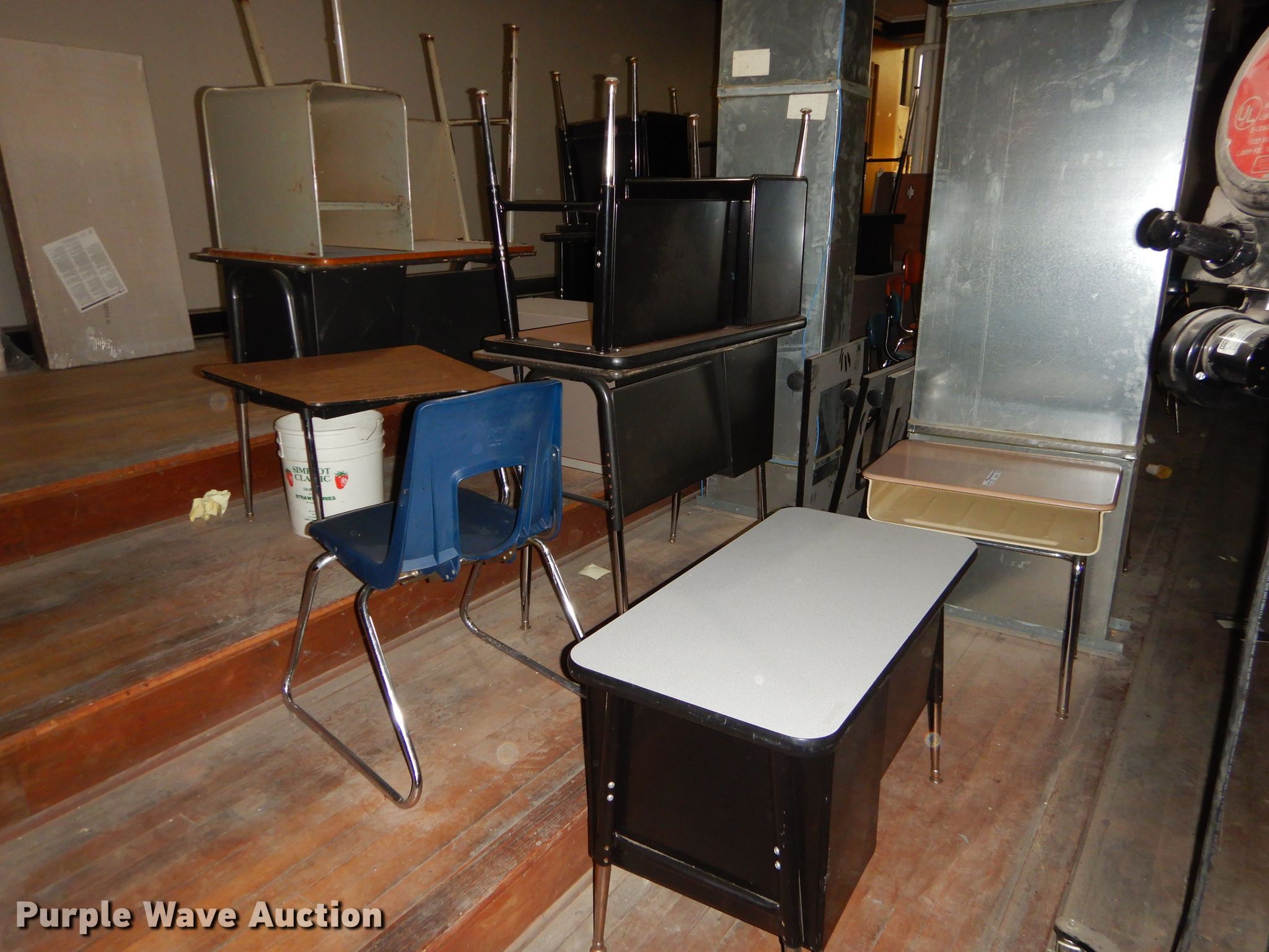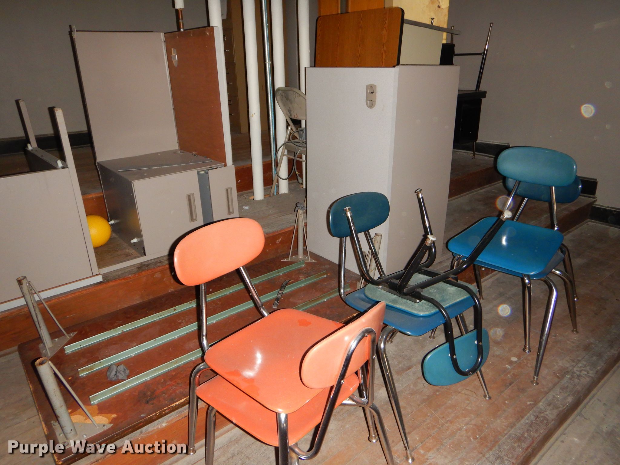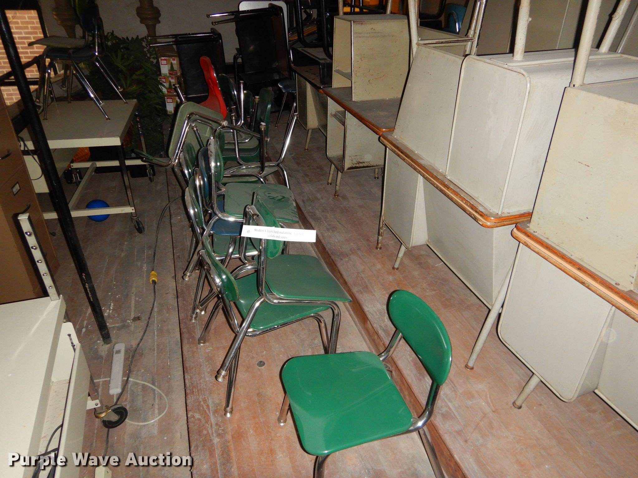 Purple Wave is selling a used Furniture in Kansas. This item is a Furniture with the following: Metal computer cart, Approximately 53 student chairs, Approximately 26 student desks, Teacher desks, Filing cabinet