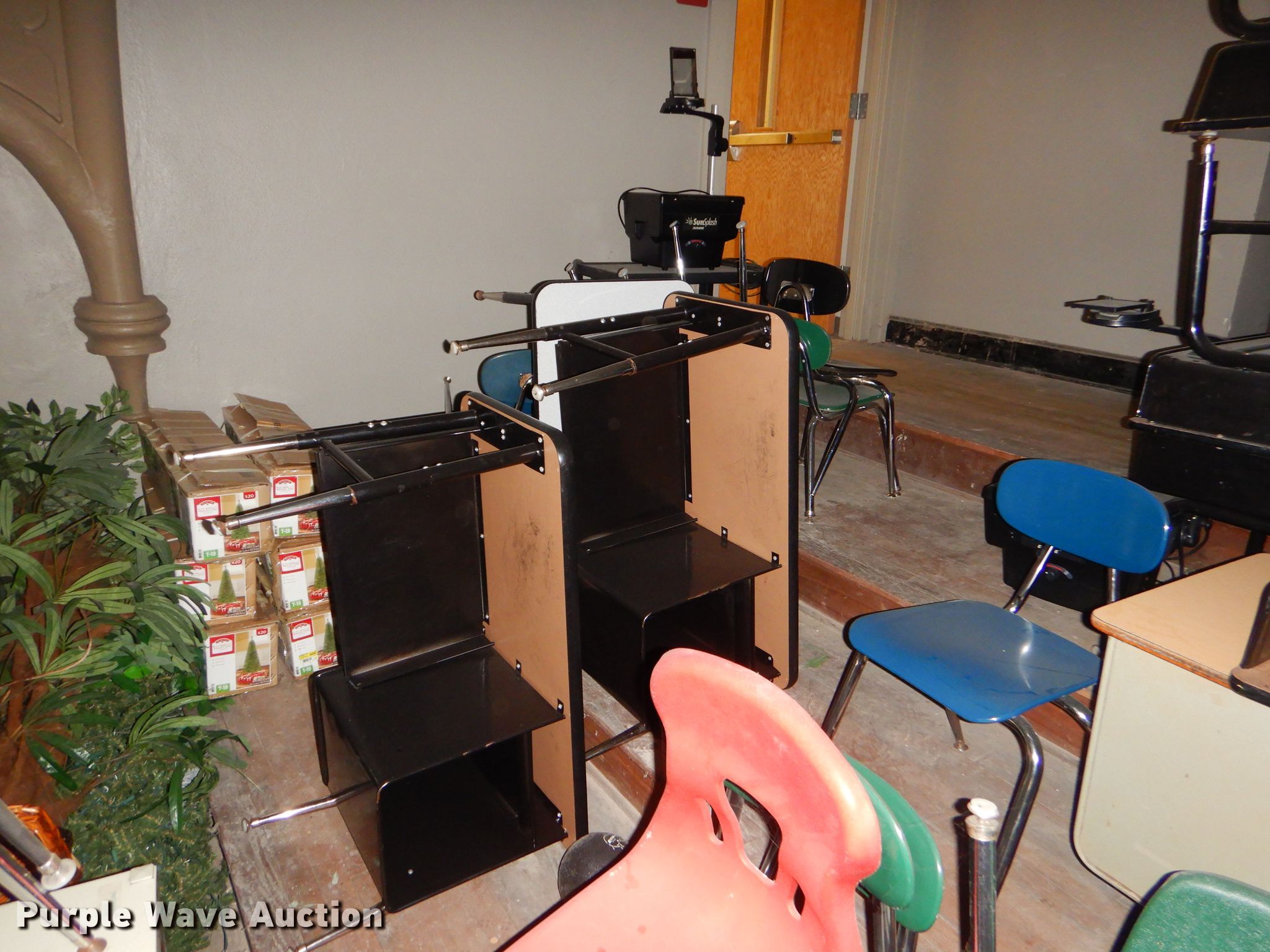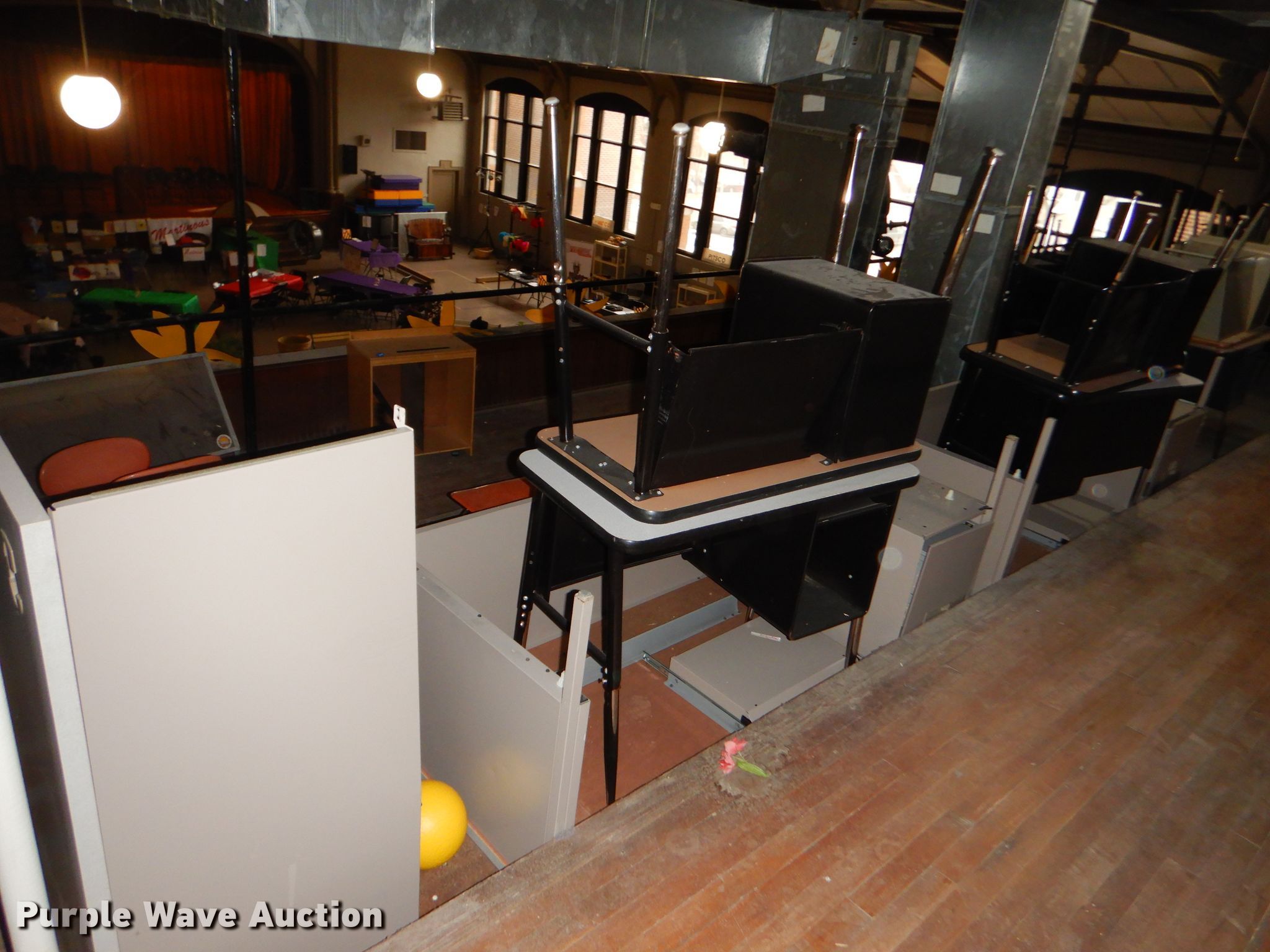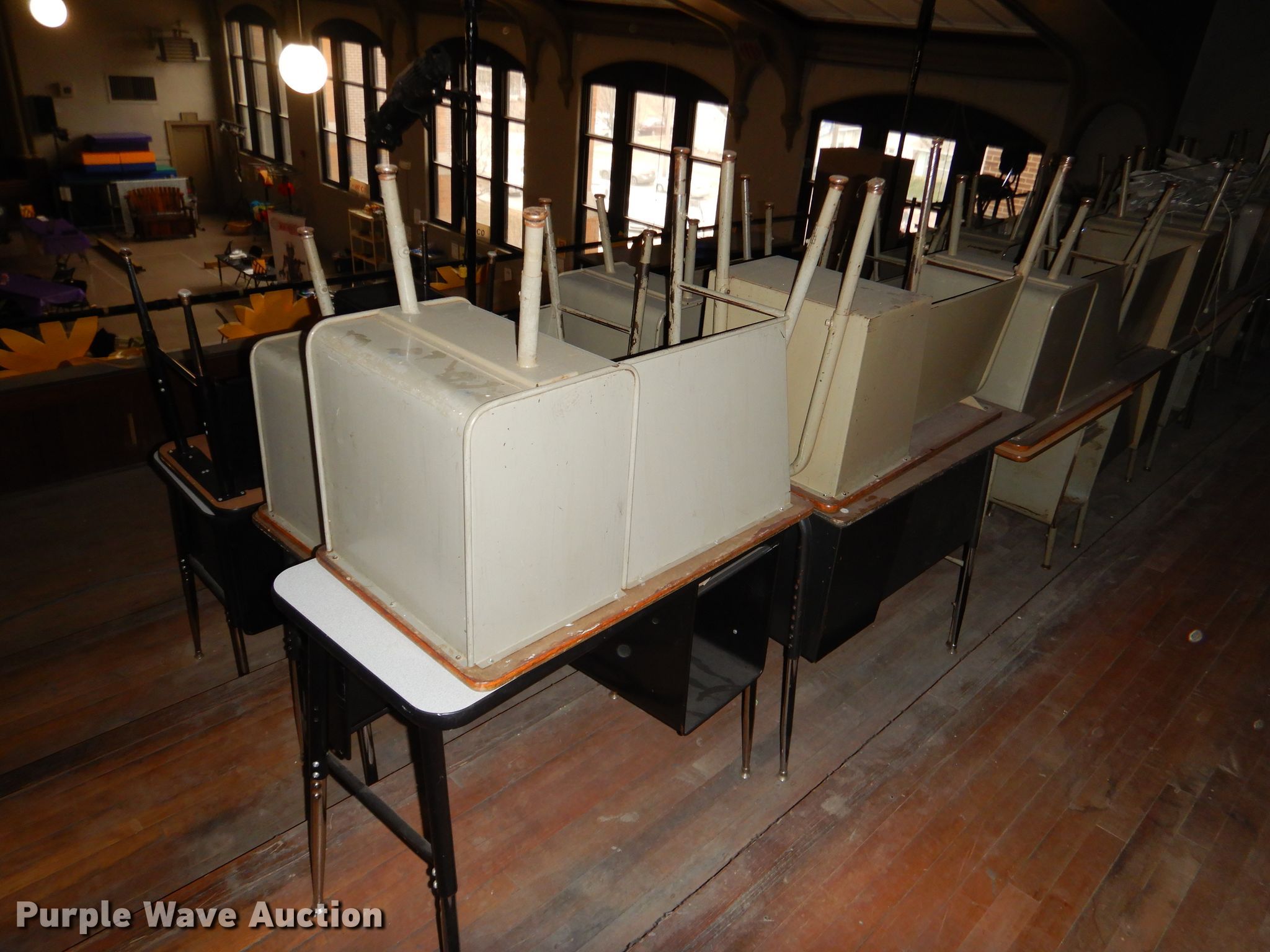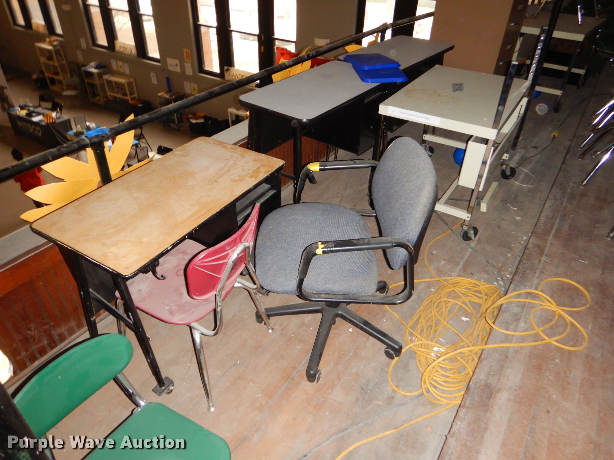 Purple Wave is selling a used Furniture in Kansas. This item is a Furniture with the following: Metal computer cart, Approximately 53 student chairs, Approximately 26 student desks, Teacher desks, Filing cabinet