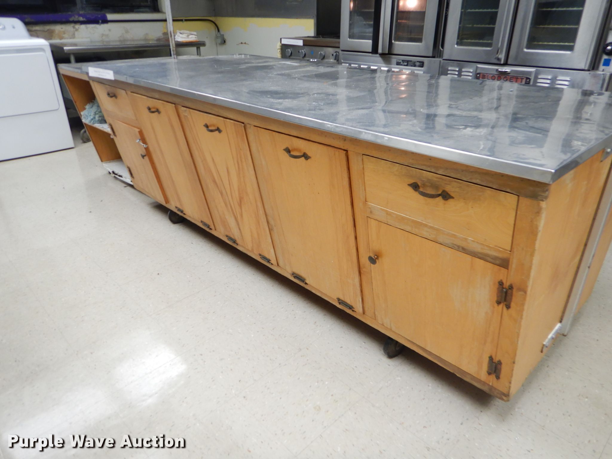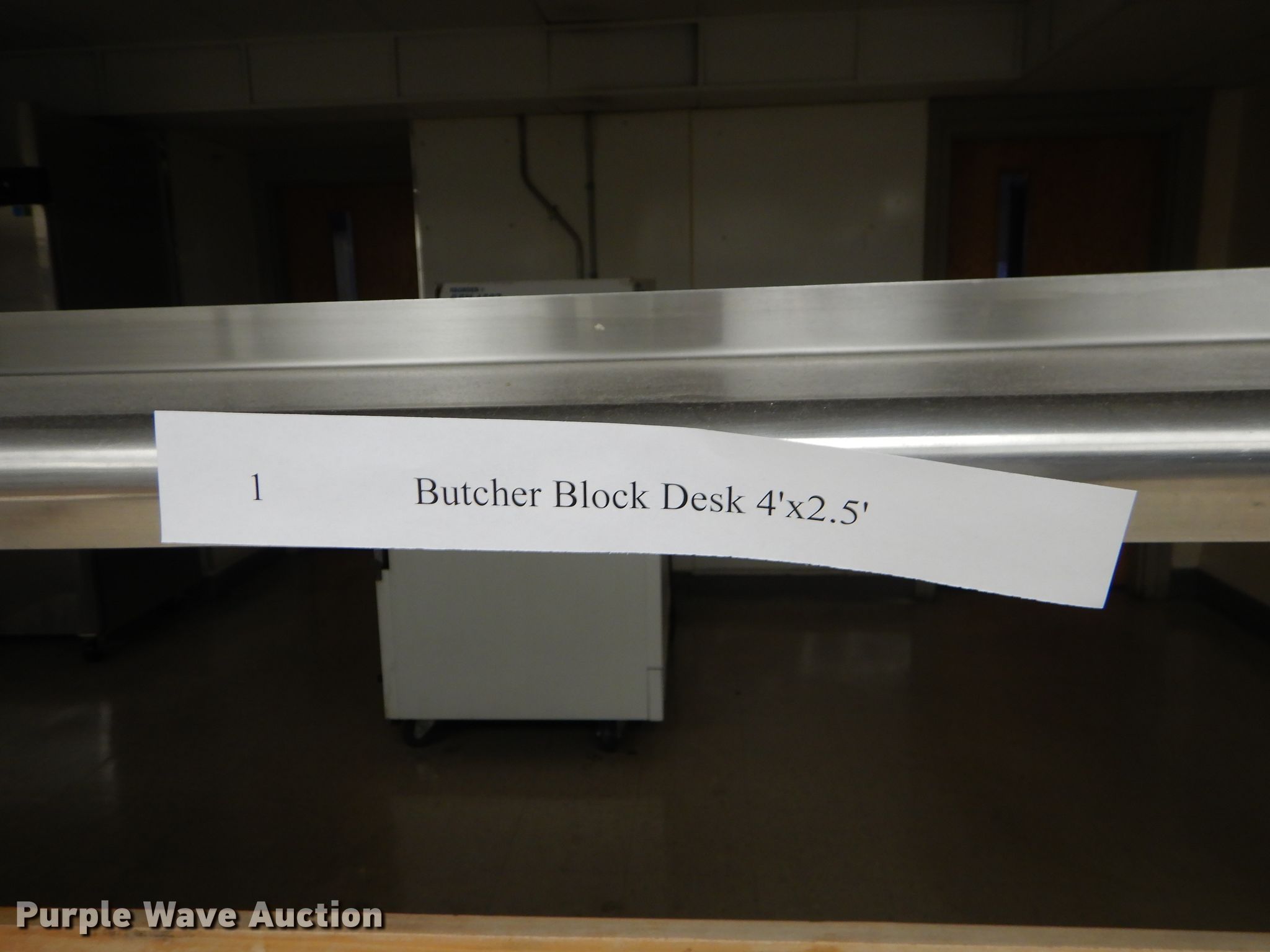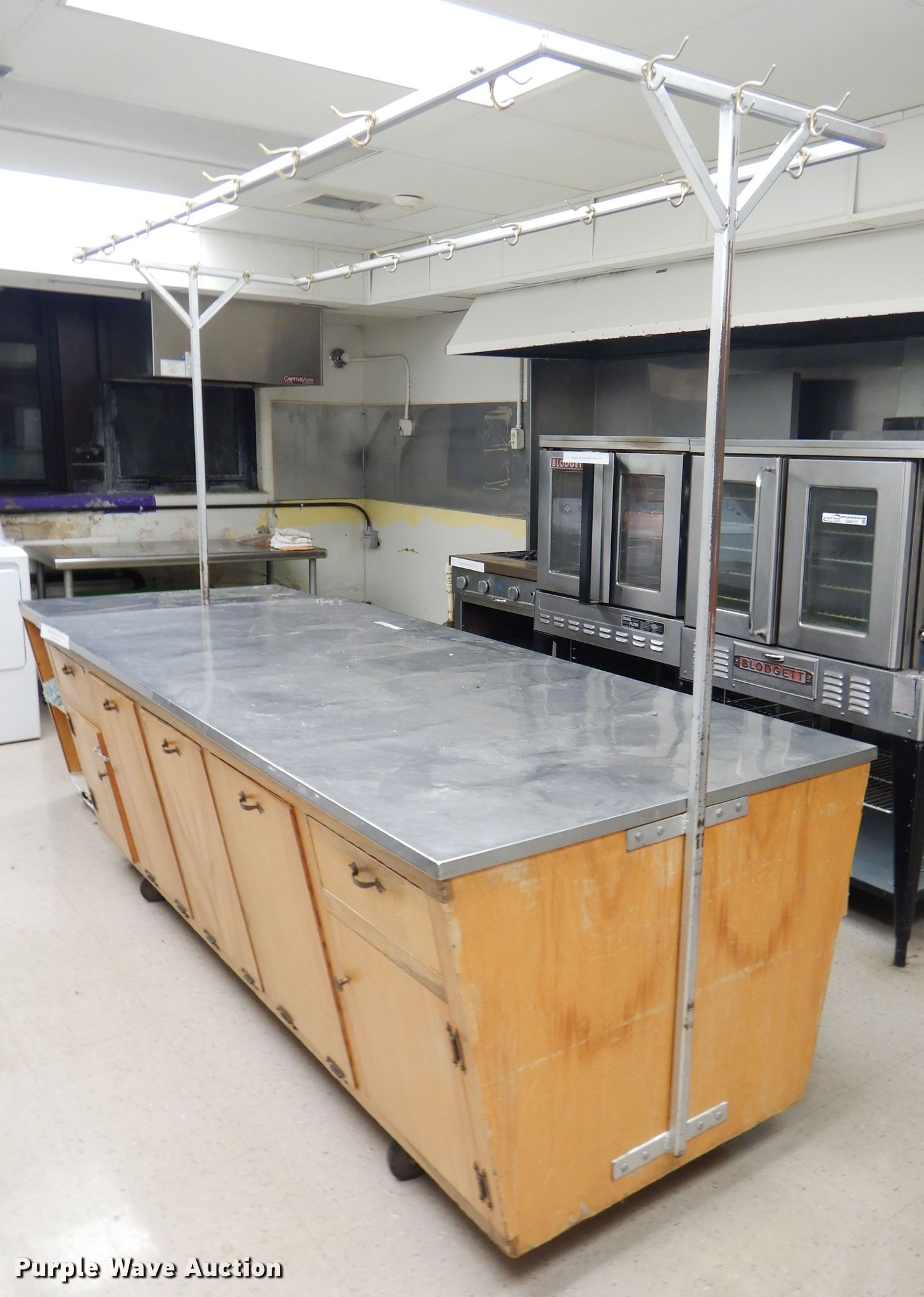 Purple Wave is selling a used Restaurant Equip. in Kansas. This item is a Stainless steel top table with the following: 8' x 3'7", Pot rack, Butcher block desk, 4' x 2.5', Steel serving cart, 24" x 16"