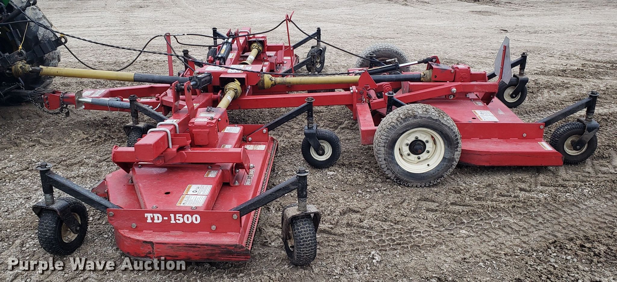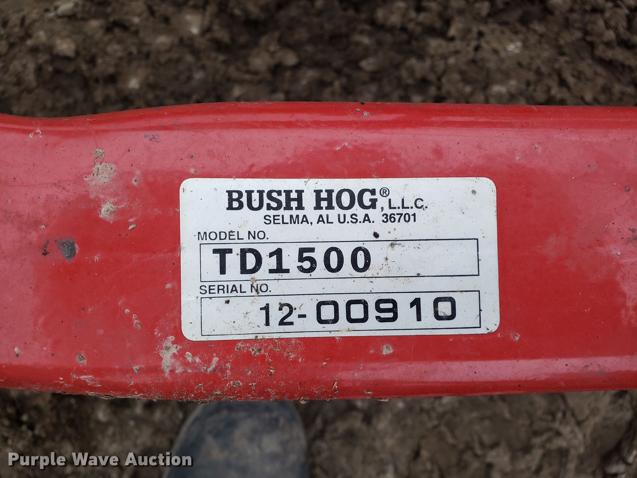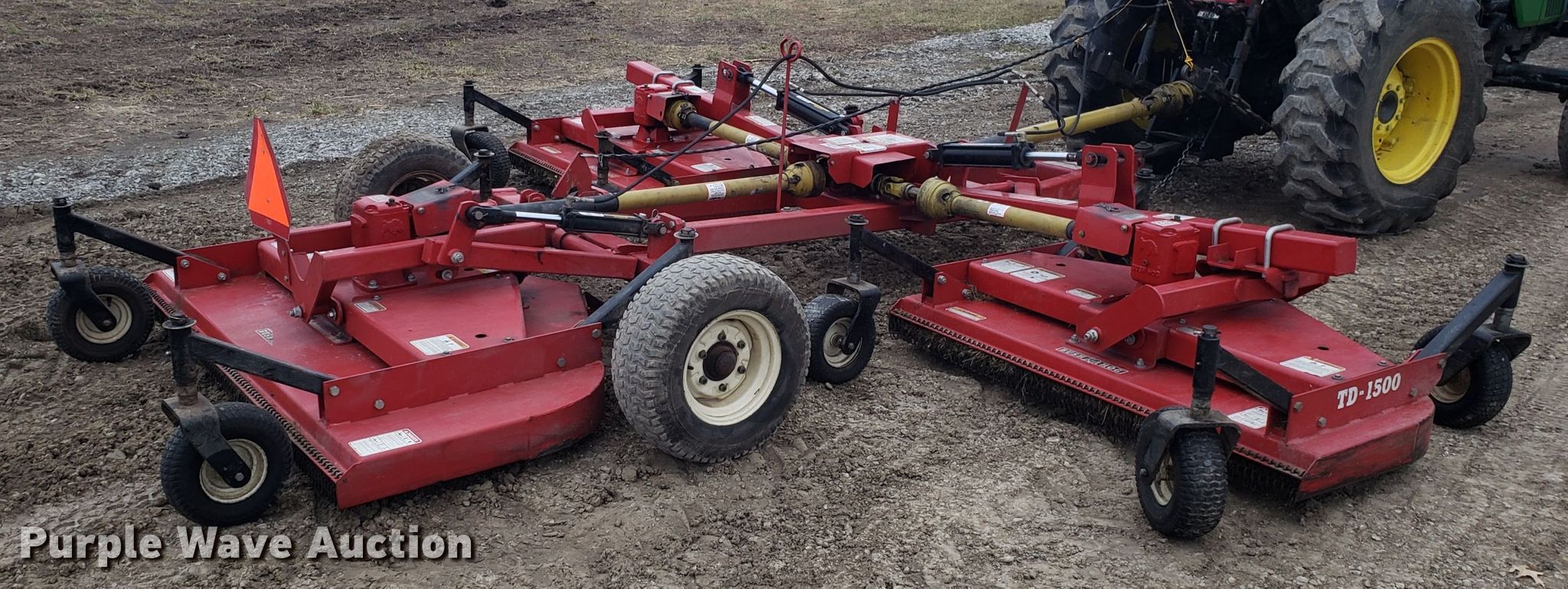 Purple Wave is selling a used Mower, Cutter, Shredder in Missouri. This item is a Bush Hog TD1500 batwing finish mower with the following: 15'W, Hydraulic fold, 540 PTO, 23x9.50x12 transport tires, Serial 12-00910