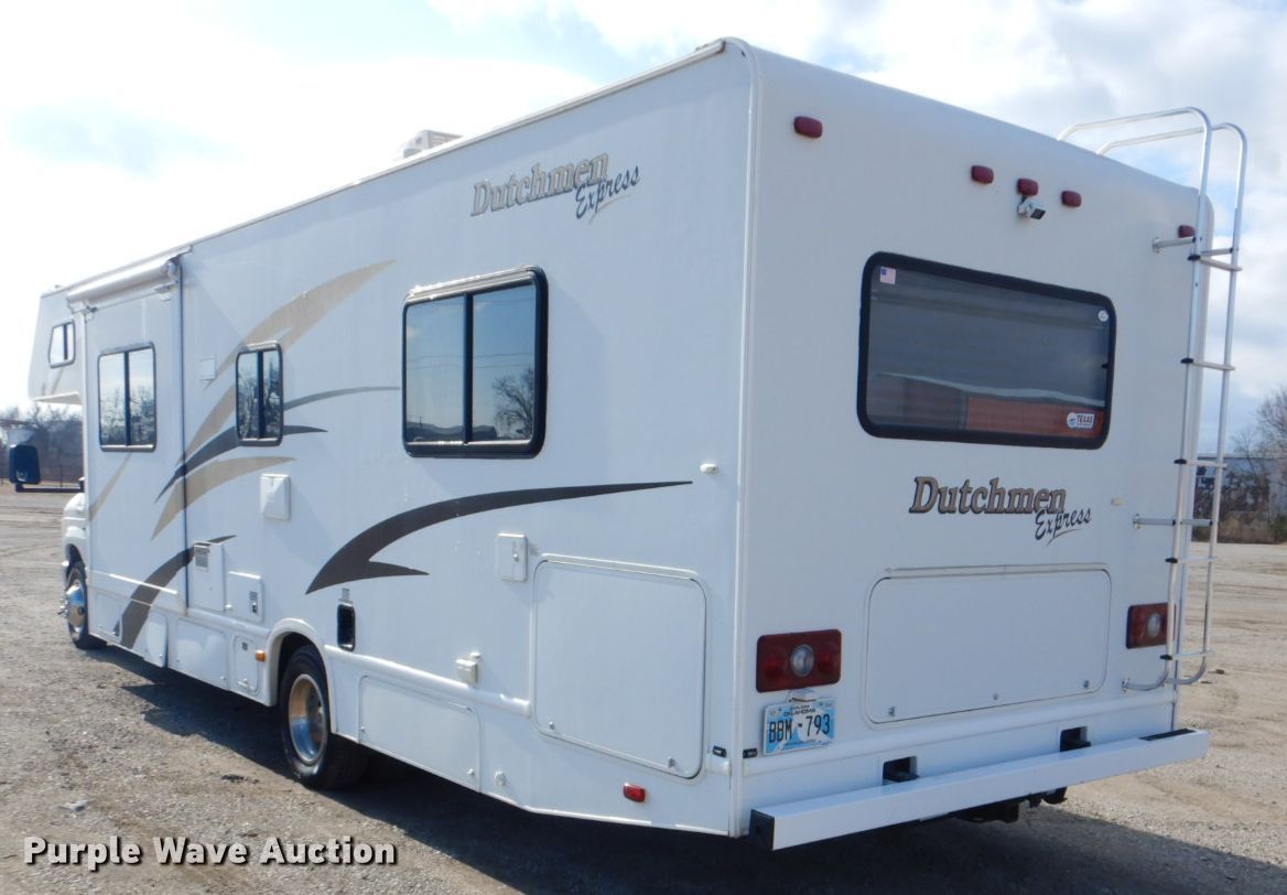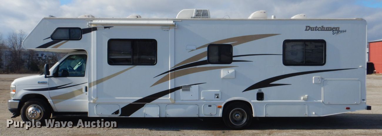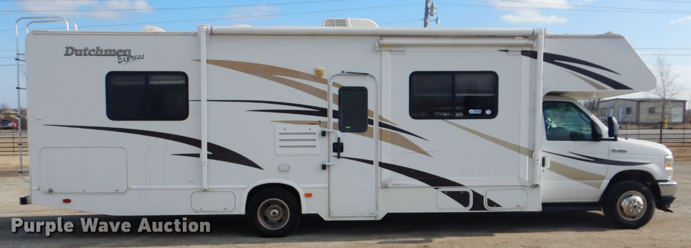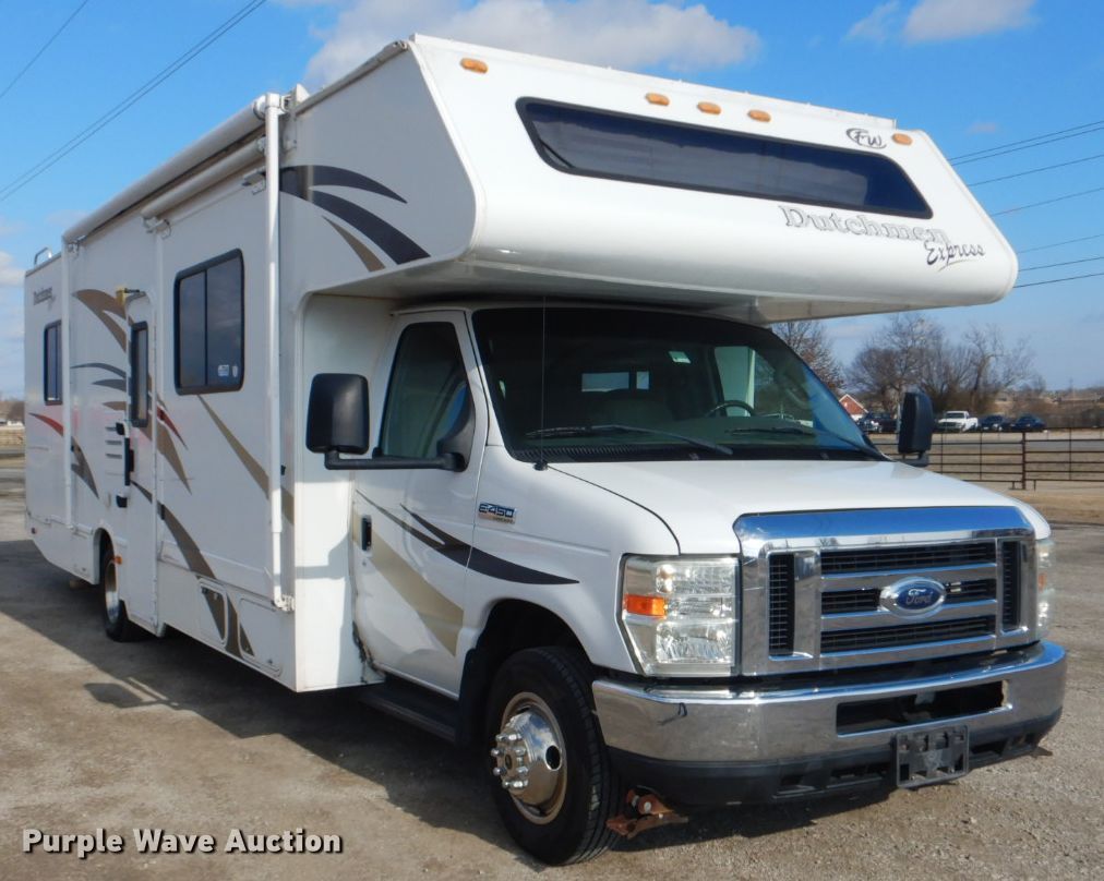 Purple Wave is selling a used RV in Oklahoma. This item is a 2008 Ford Econoline E450 camper with the following: 67,907 miles on odometer, 6.8L V10 SOHC 20V gas engine, Automatic transmission, Single axle, 29.5'L, (2) slide-outs, Electric awning, Kitchen, Sink, Refrigerator/freezer, Microwave, Oven, Electric stove, Living room, Table, Couch, (2) bedrooms, Queen bed, Double bed, Television, Heater, AC unit, Generator, 158" wheelbase, Spring suspension, Hydraulic brakes, LT225/75R16 tires