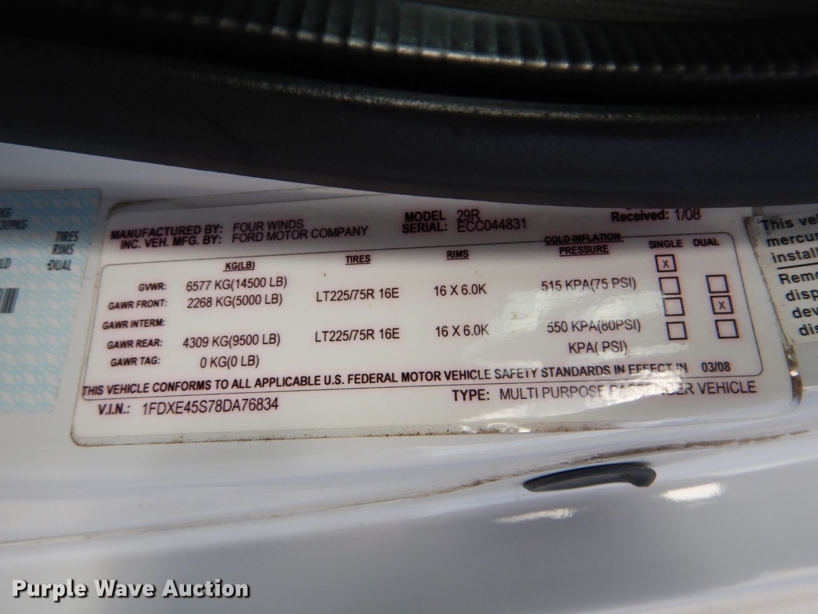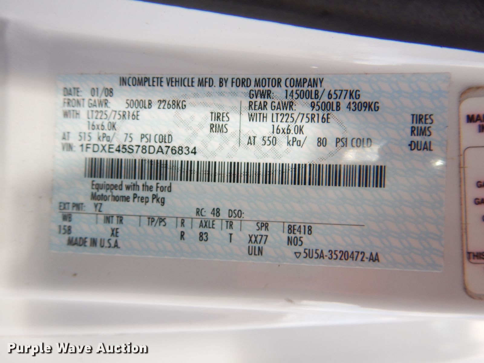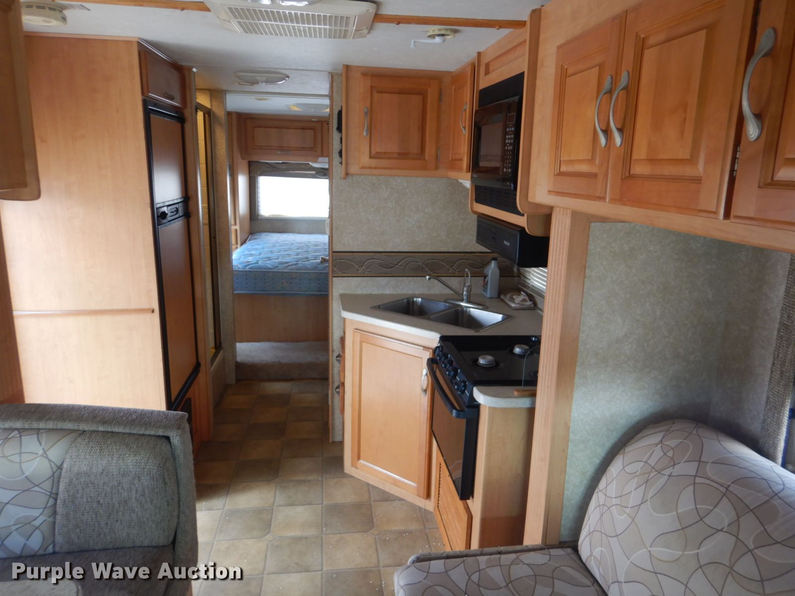 Purple Wave is selling a used RV in Oklahoma. This item is a 2008 Ford Econoline E450 camper with the following: 67,907 miles on odometer, 6.8L V10 SOHC 20V gas engine, Automatic transmission, Single axle, 29.5'L, (2) slide-outs, Electric awning, Kitchen, Sink, Refrigerator/freezer, Microwave, Oven, Electric stove, Living room, Table, Couch, (2) bedrooms, Queen bed, Double bed, Television, Heater, AC unit, Generator, 158" wheelbase, Spring suspension, Hydraulic brakes, LT225/75R16 tires