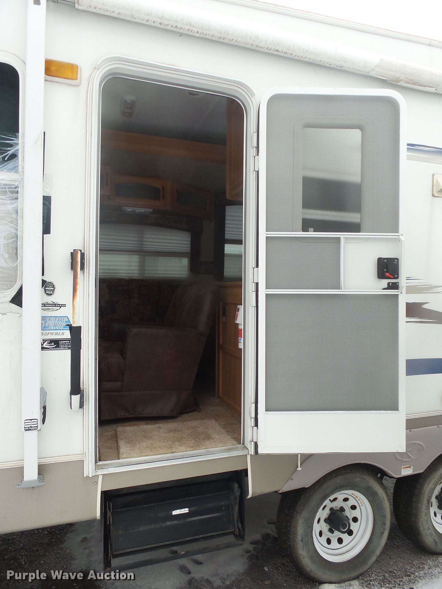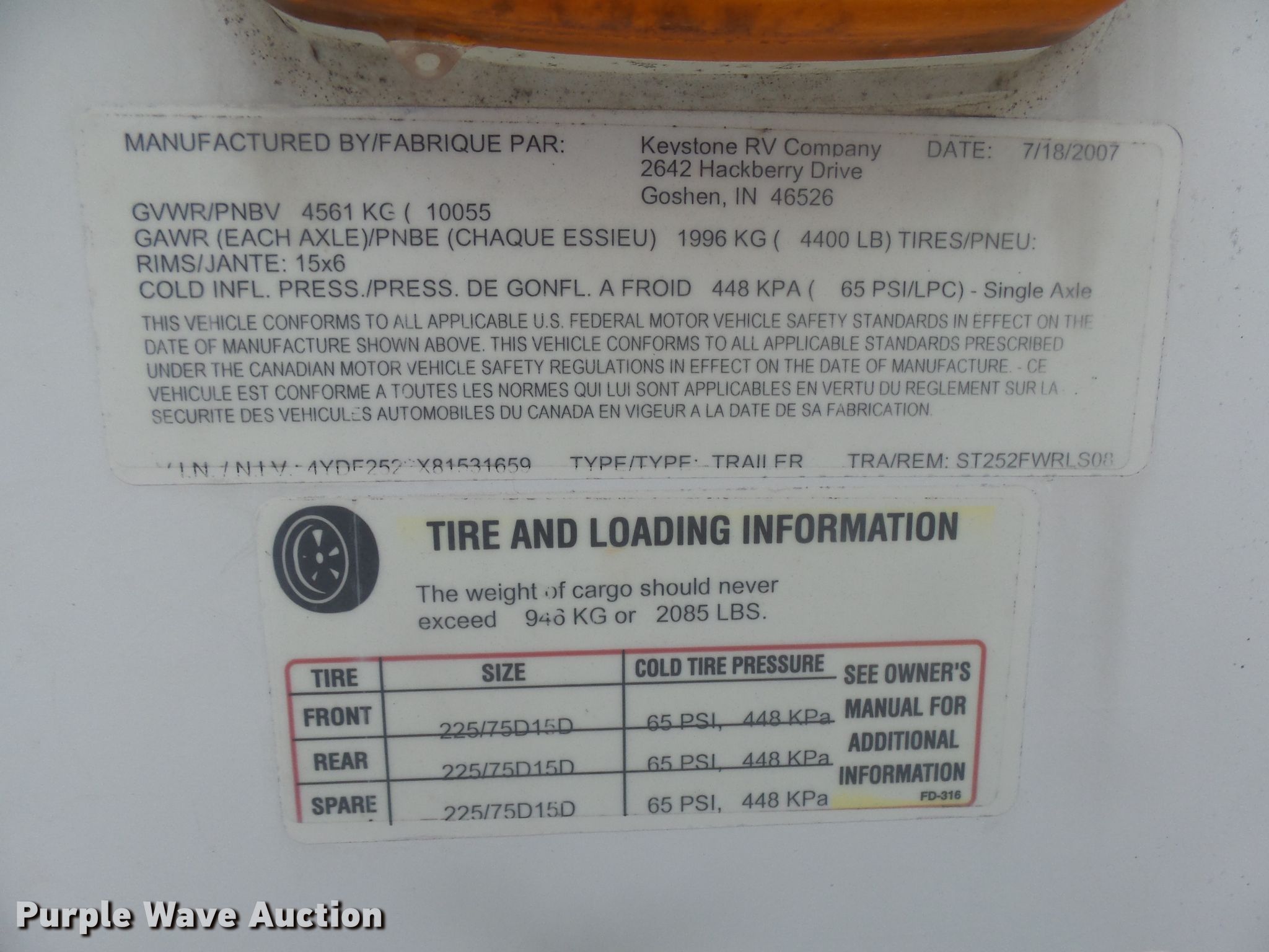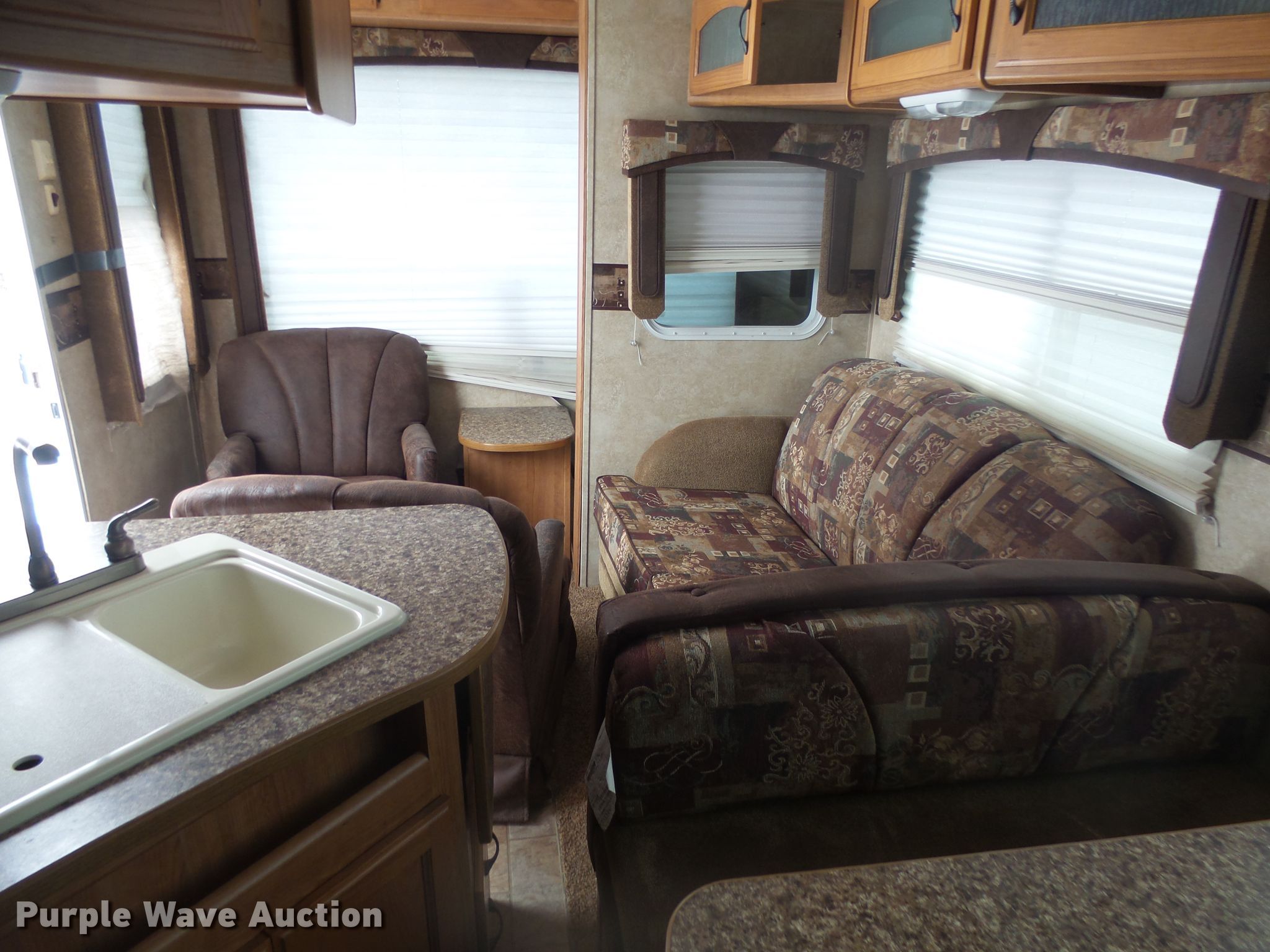 Purple Wave is selling a used RV in South Dakota. This item is a 2008 Keystone 252RL camper with the following: 28'11"L, Slide-out, Electric awning, Kitchen, Sink, Refrigerator/freezer, Microwave, Oven, Propane stove, Living room, Table, Couch, Bathroom, Queen bed, Sound system, AC and heat unit, Auto leveler, Spring suspension, Electric brakes, Tandem axle, ST225/75R15 tires, GAWR 4,400 lbs, (2) windows broken, Non-operational unit