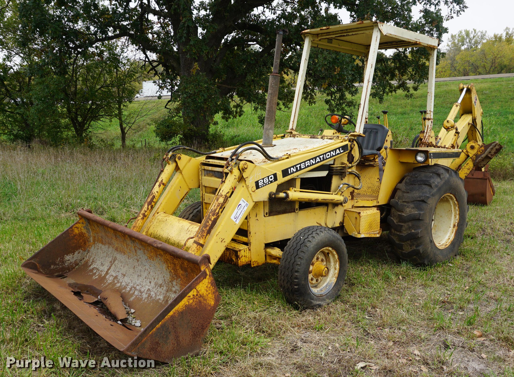Purple Wave is selling a used Tractor Loader Backhoe in Kansas. This item is a International 260A backhoe with the following: International 3.9L four cylinder diesel engine, 74 HP, 6F-3R gears, OROPS, Four stick backhoe controls, Front work lights, 83"W loader bucket, 24"W backhoe bucket, Front counter weight, 11-16 front tires, 16.9-24 rear tires, Last used 11 years ago, Unknown operating condition, unit will not start, Serial 2710096U101244