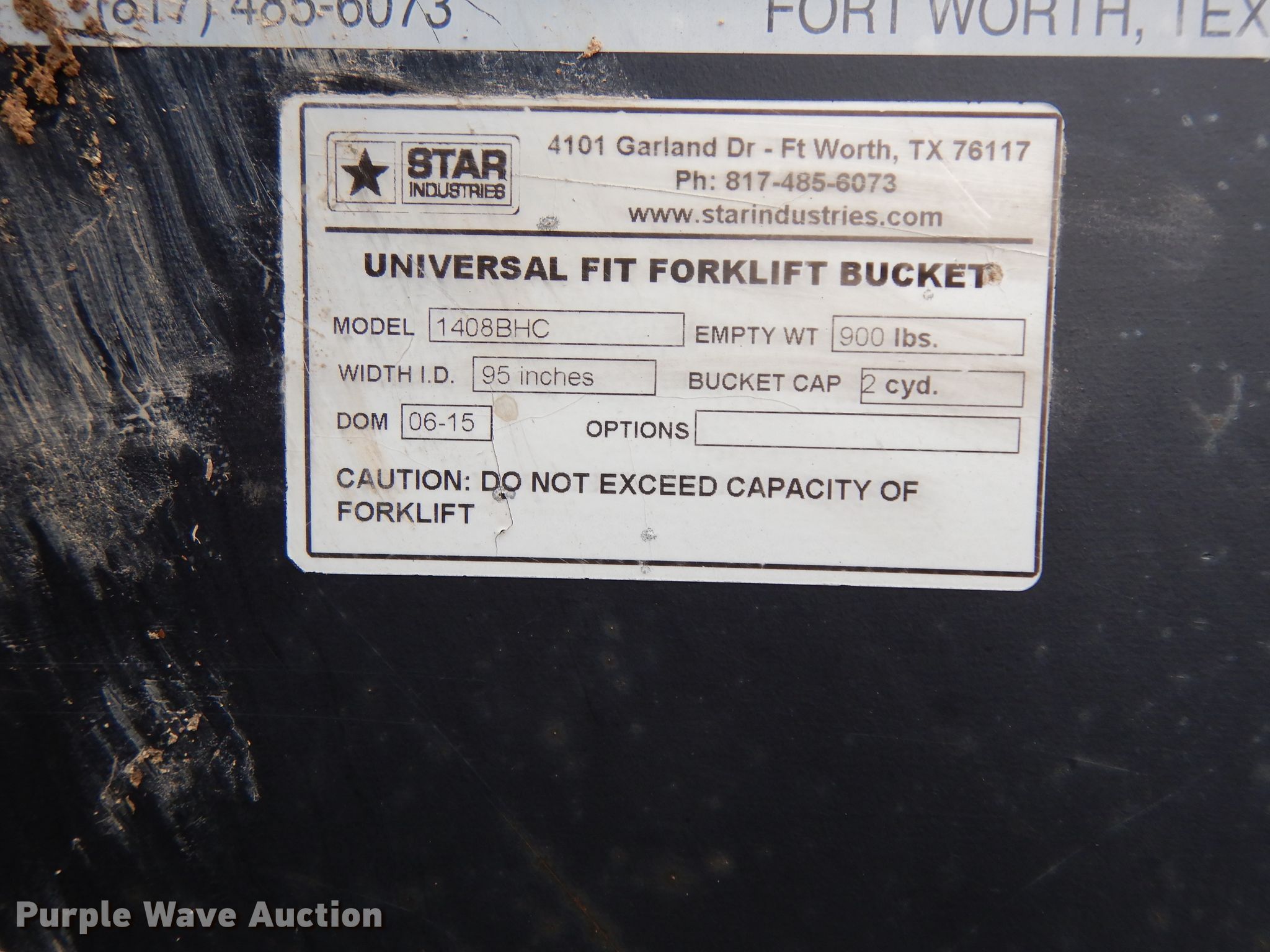 Purple Wave is selling a used Forklift Attach. in Texas. This item is a Star Industries 1408GHC forklift bucket with the following: 95"W, 2 cu.yd. capacity, 46"L x 8"W fork pockets