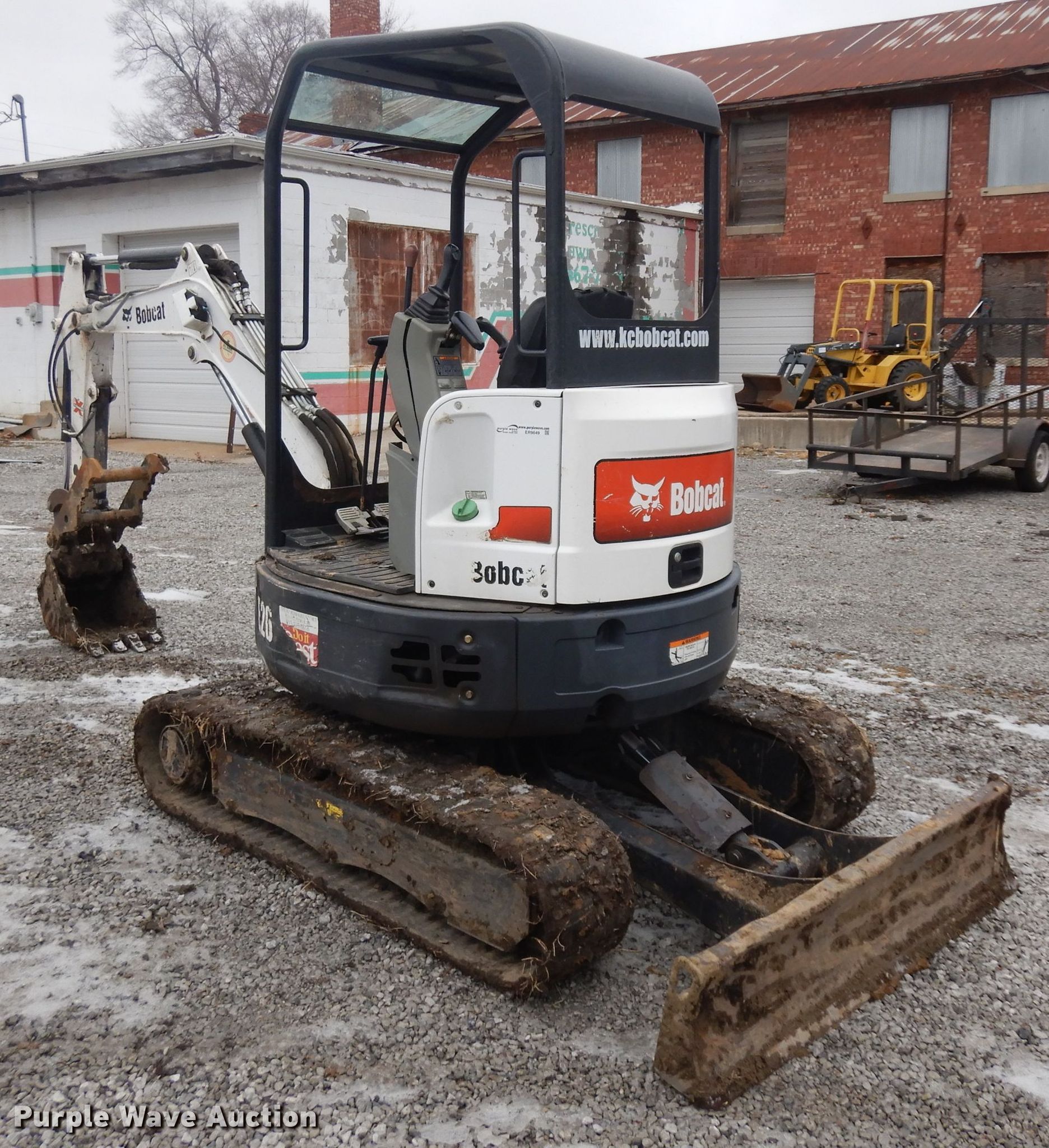 Purple Wave is selling a used Mini Excavator in Kansas. This item is a Bobcat E26 mini excavator with the following: 2,425 hours on meter, Kubota four cylinder diesel engine, Two speed hydrostatic transmission, OROPS, Pattern changer, 60"W backfill blade, Swing boom, 16"W bucket, (4) teeth, 12"W bucket, Weld-on cutting edge, (3) teeth, 24"W bucket, Weld-on cutting edge, (5) teeth, Hydraulic thumb, Auxiliary hydraulics, 12"W tracks, Serial B33211229