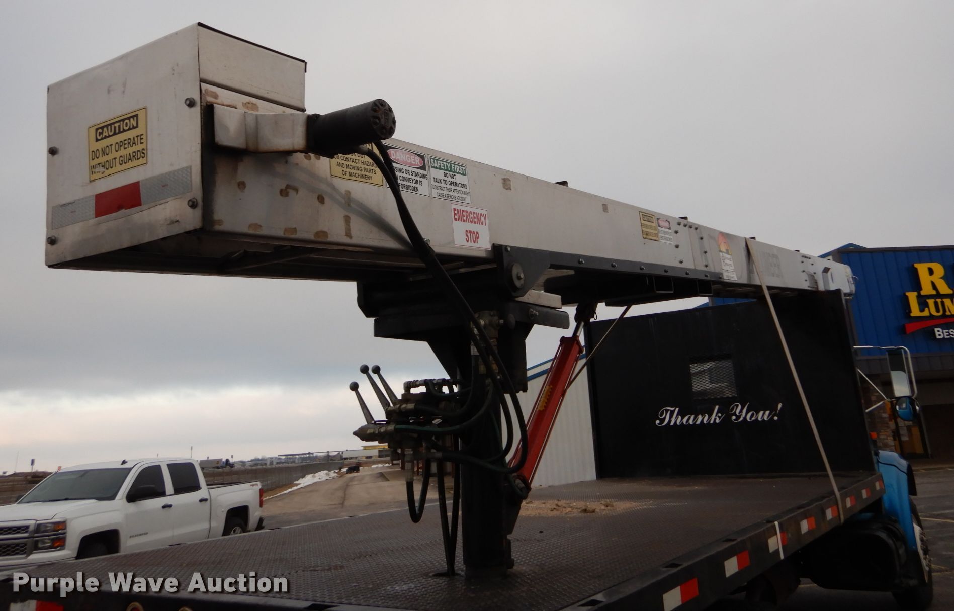 This 1995 International 4700 dump flatbed truck with conveyor will sell to the highest bidder regardless of price.