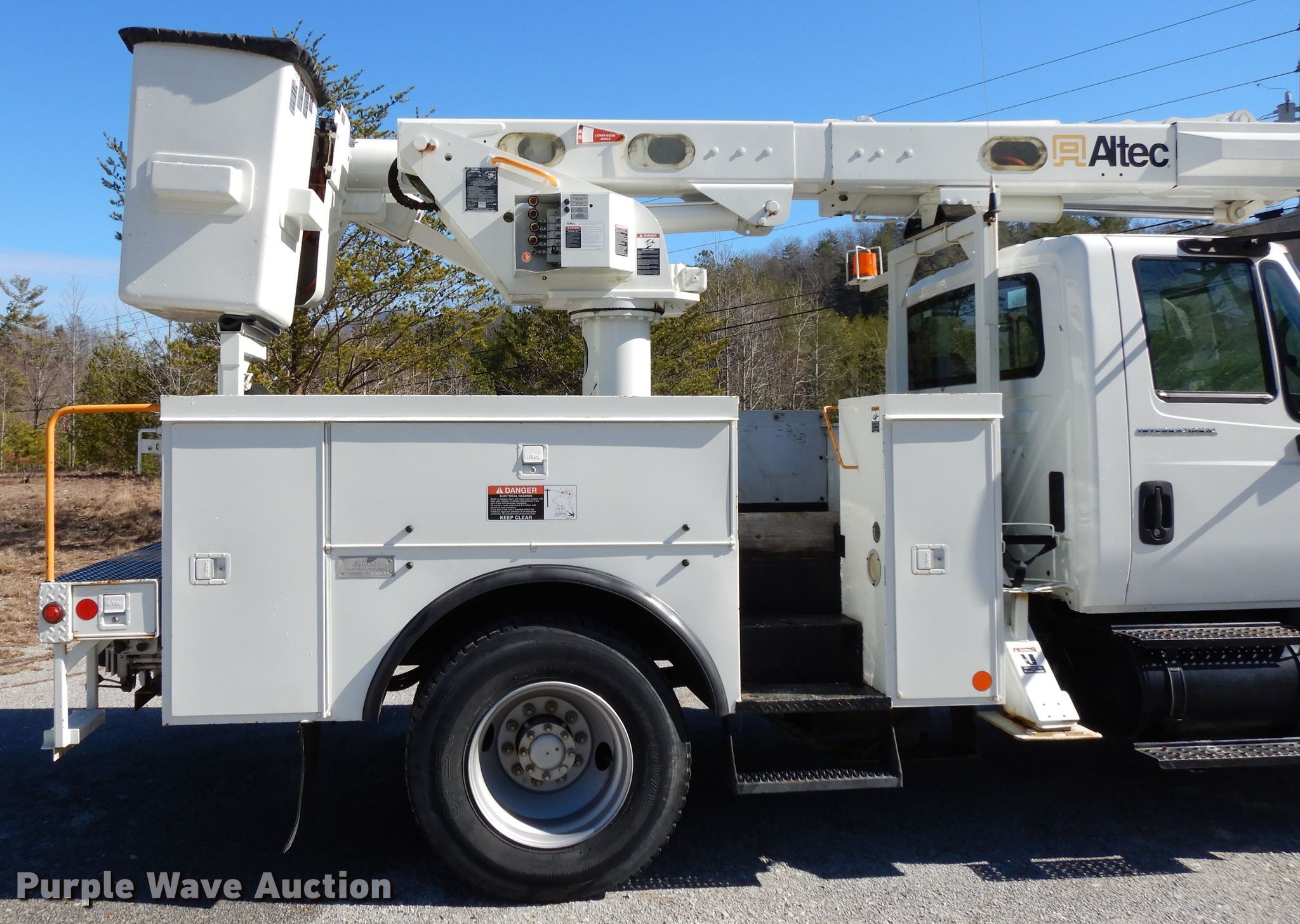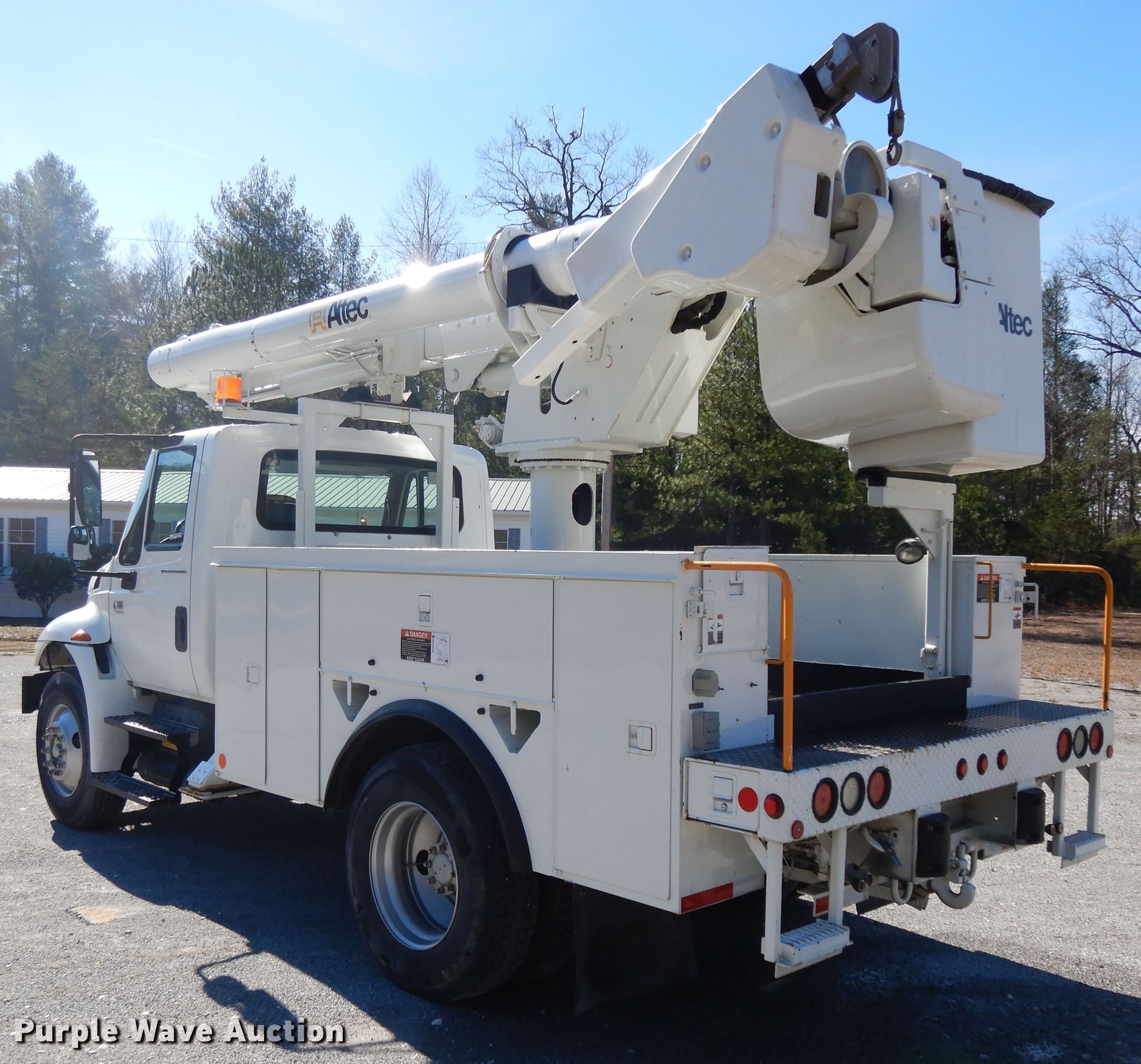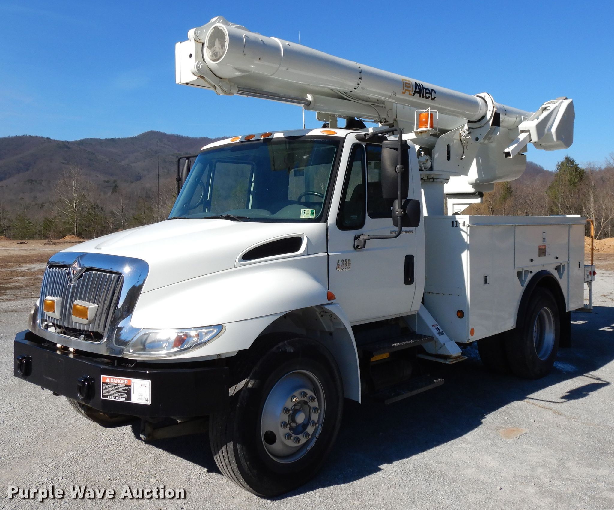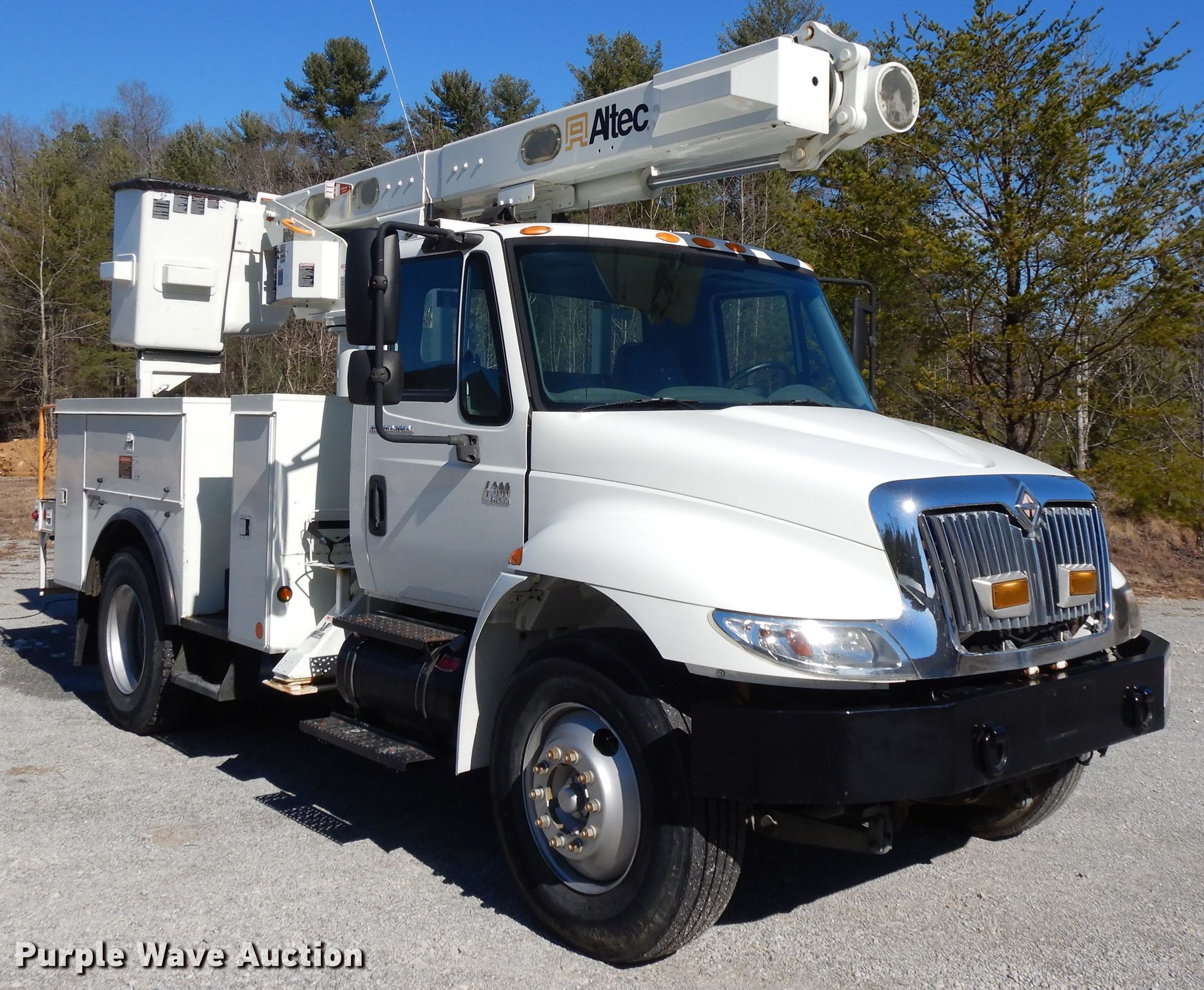 Purple Wave is selling a used Bucket Truck in North Carolina. This item is a 2005 International 4300 bucket truck with the following: 232,687 miles on odometer, International DT466 7.6L L6 diesel engine, Allison automatic transmission, Single axle, AC and heat, Auxiliary controls, Brake controller, PTO, Altec 12.5'L utility bed, Altec L37MR articulating, insulated boom, 400 lbs maximum lift capacity, 42' maximum lift height, Man basket, Platform and ground controls, Material handler, Serial 0804CW0770, Spring suspension, Air brakes, 11R22.5 tires