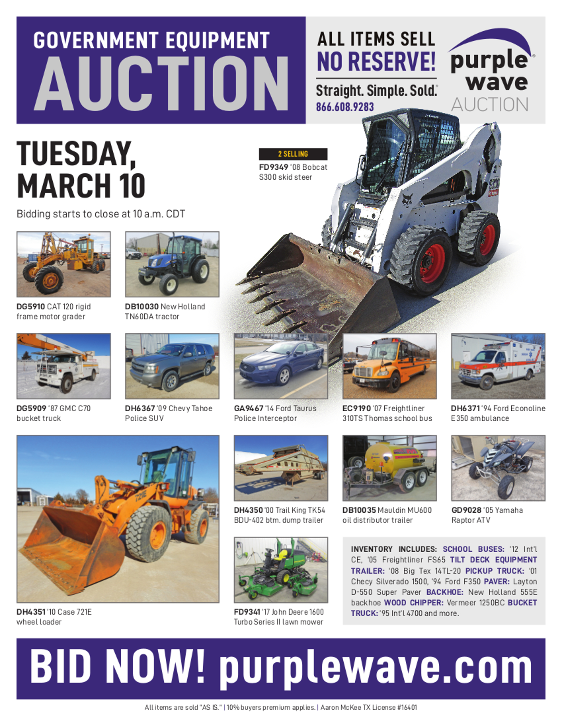 Terms, conditions, explanations and information in addition to those listed on this page are found in the Terms and Conditions section of this site and on the individual listing pages for all assets included in this auction. All terms, conditions, explanations and information are intended to be supplemental and complementary to each other. They are incorporated by reference into this page, and collectively they govern this auction. In the event of a conflict or inconsistency among terms, conditions, explanations or information in the Terms and Conditions section, the individual listing pages for assets and/or this page, the individual listing pages shall control this page and the Terms and Conditions section, and this page shall control the Terms and Conditions section. By registering to bid live and/or on the Internet, you agree to abide by all terms and conditions and you acknowledge receipt of all explanations and information made available by Purple Wave.