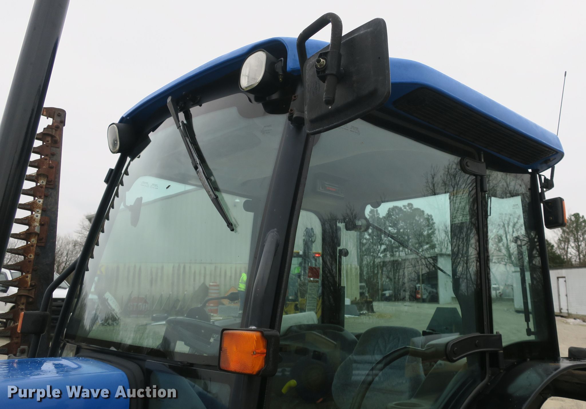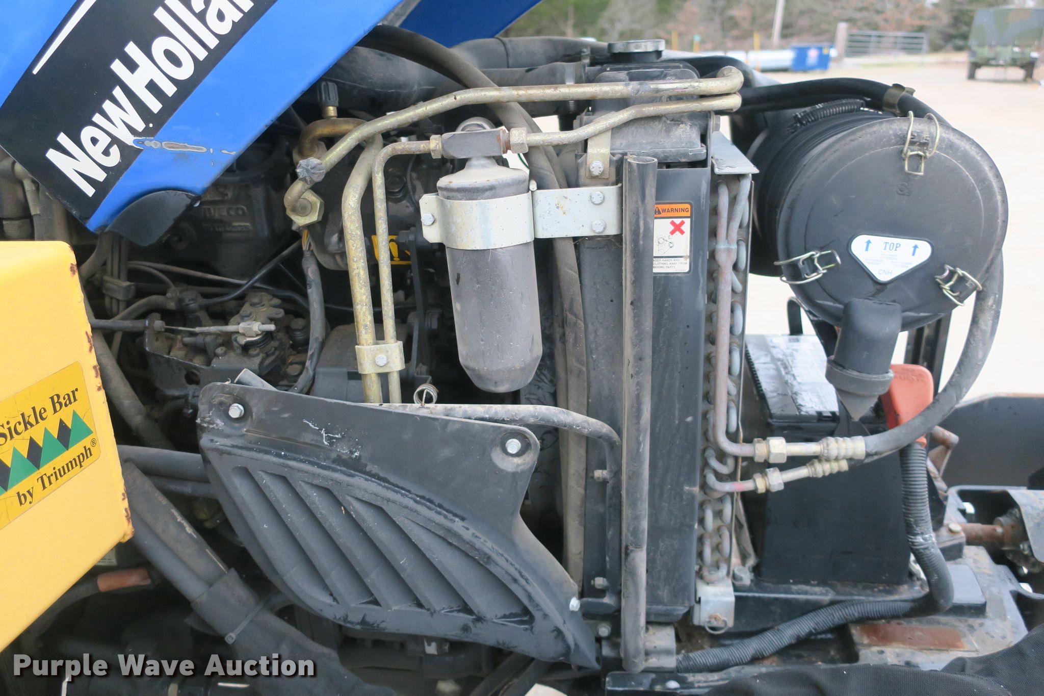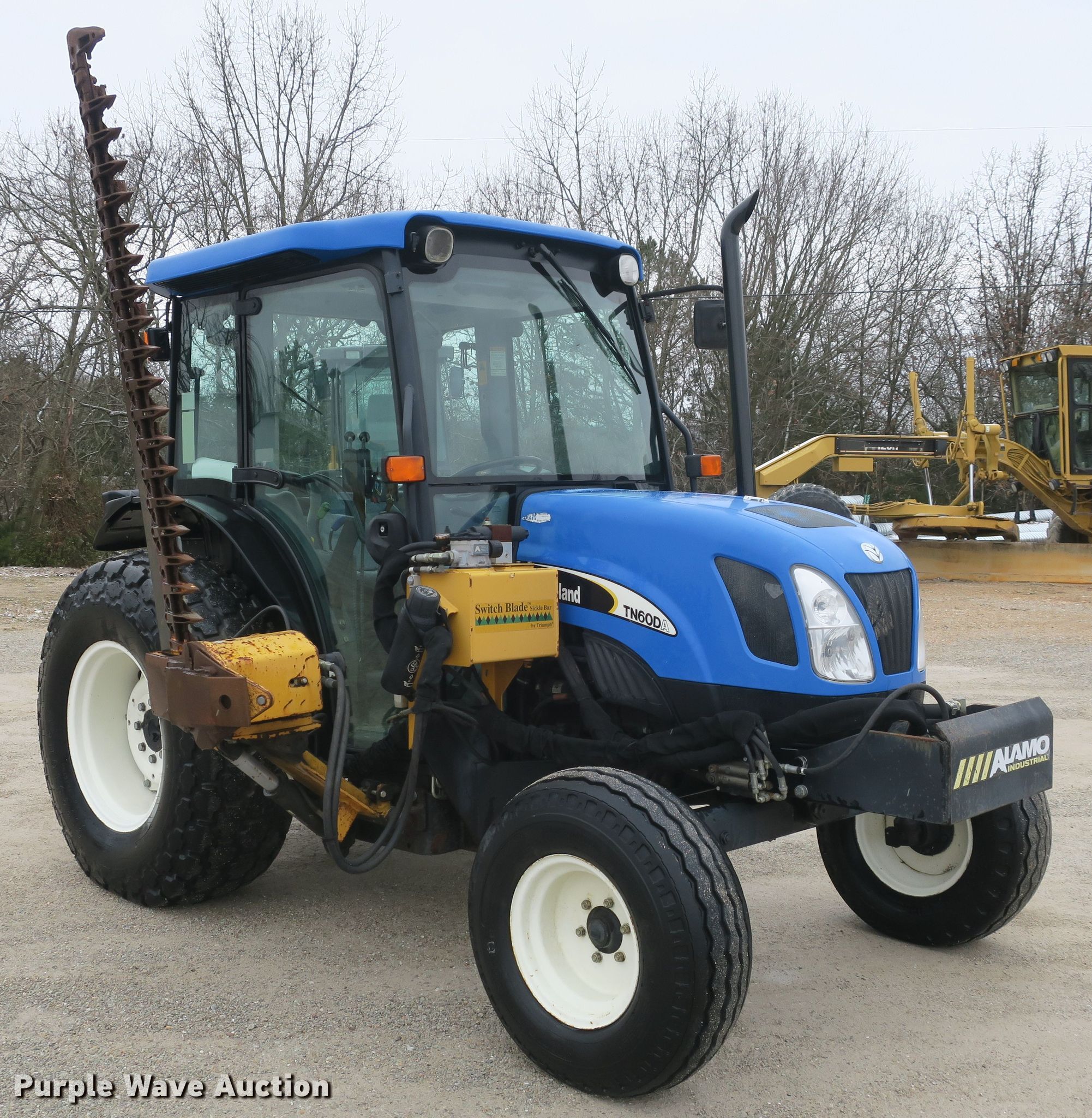 Purple Wave is selling a used Tractor in Missouri. This item is a New Holland TN60DA tractor with the following: 1,287 hours on meter, Iveco 803505C three cylinder diesel engine, Synchro transmission, 16F-16R gears, Differential lock, AC and heat, Three point, Top point, 540 PTO, (2) rear hydraulic remote sets, 11L-15 SL front tires, 16.9-24 rear tires, Alamo SWB5 sickle mower, Serial 10140, Serial HJE051959