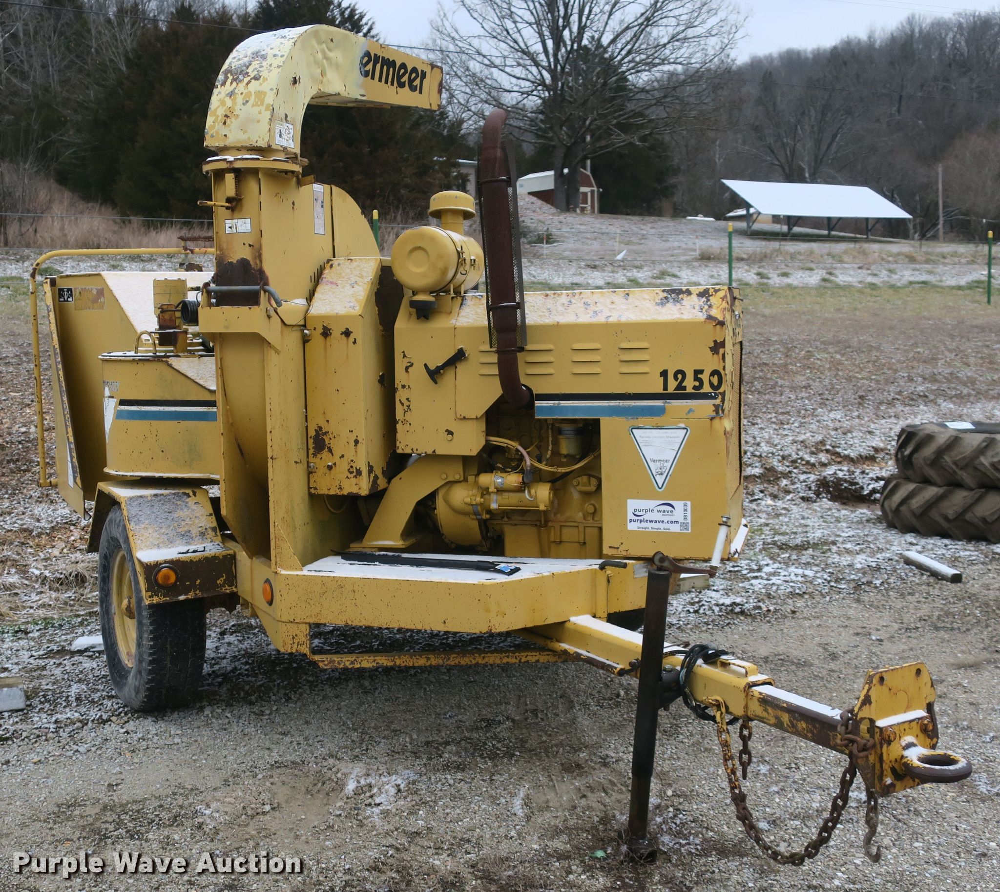 1997 Vermeer BC1250 wood chipper. 1,160 hours on meter, Perkins four cylinder diesel engine, 48"W feed chute, 12" capacity , Electric brakes, LT235/85R16 tires. Transfer of ownership documentation will be a bill of sale. 1VRC14135V1005934. Stone County. 31809 State Hwy 413. Galena, MO 65656