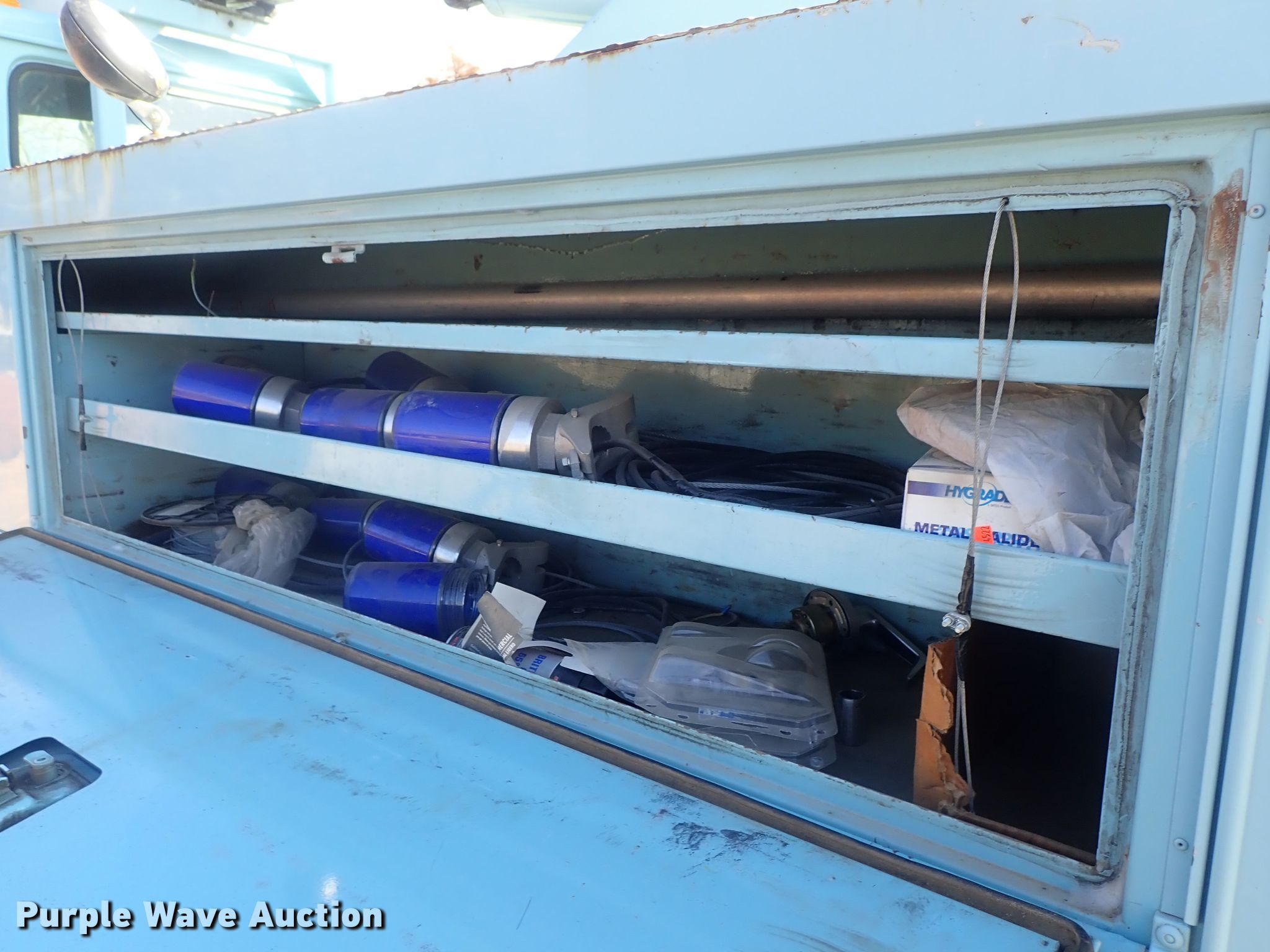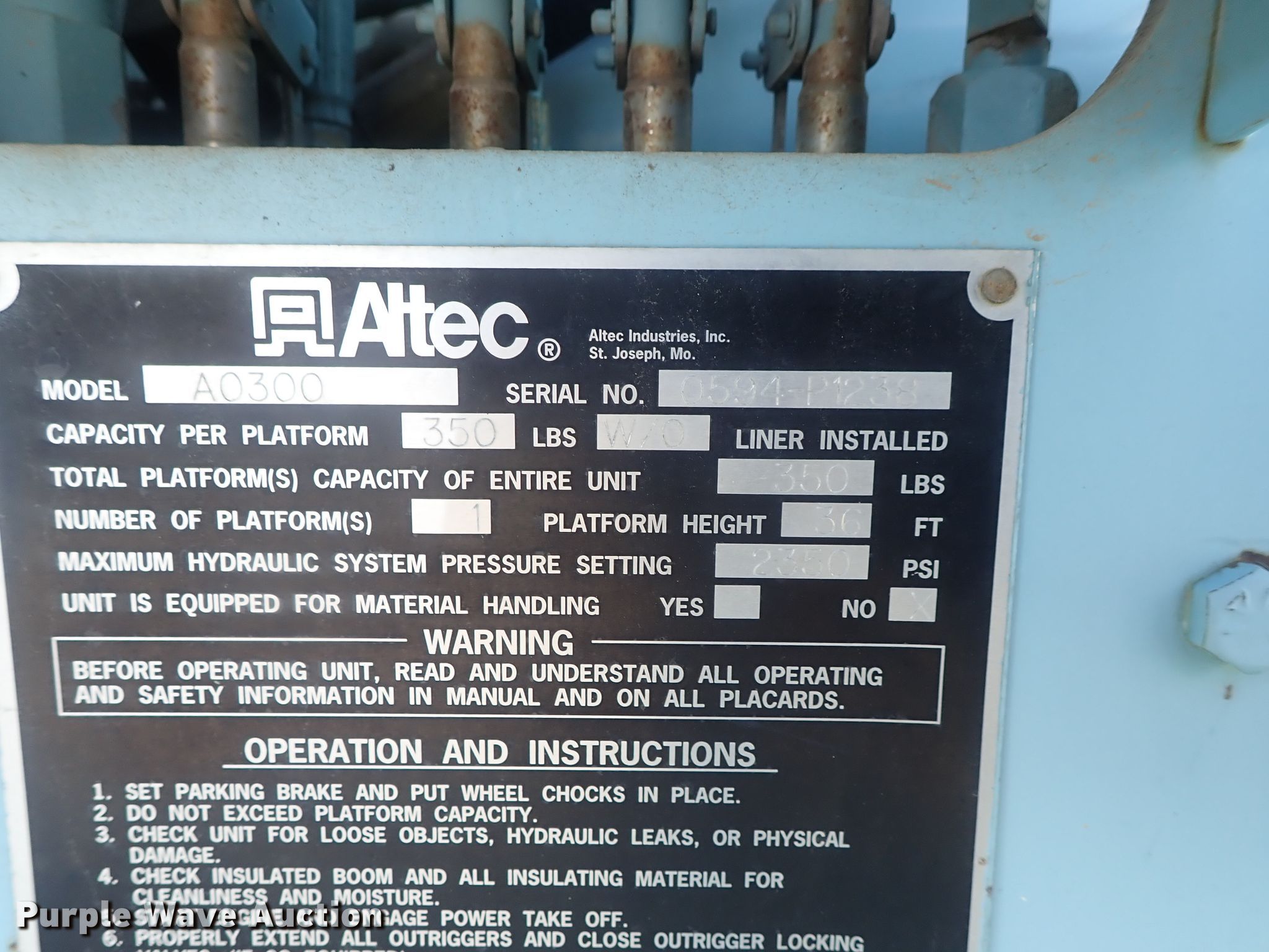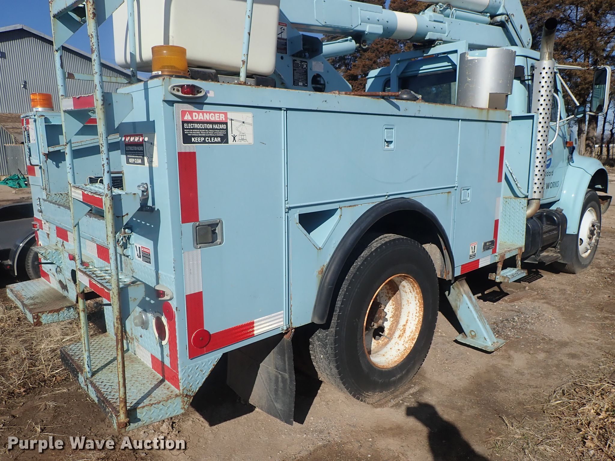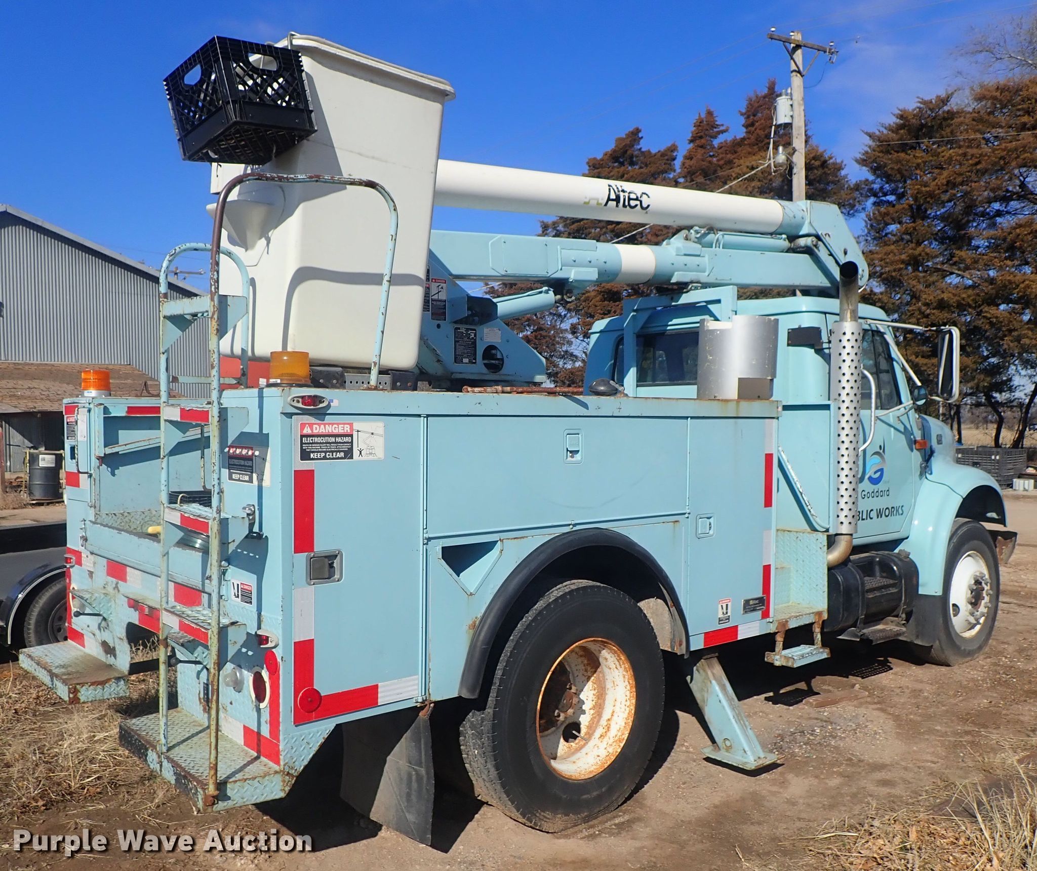Purple Wave is selling a used Bucket Truck in Kansas. This item is a 1995 International 4700 bucket truck with the following: 76,036 miles on odometer, International T444 7.3L V8 diesel engine, Spicer five speed manual transmission, Two speed rear end, Single axle, Heat, PTO, Altec utility bed, 112" x 93", Altec A0300 boom, 350 lbs max lift capacity, 30' max lift height, Man basket, Ground and platform controls, Spring suspension, Air brakes, 11R22.5 tires, Clutch issues, Engine issues, Contents not included, Non-operational unit