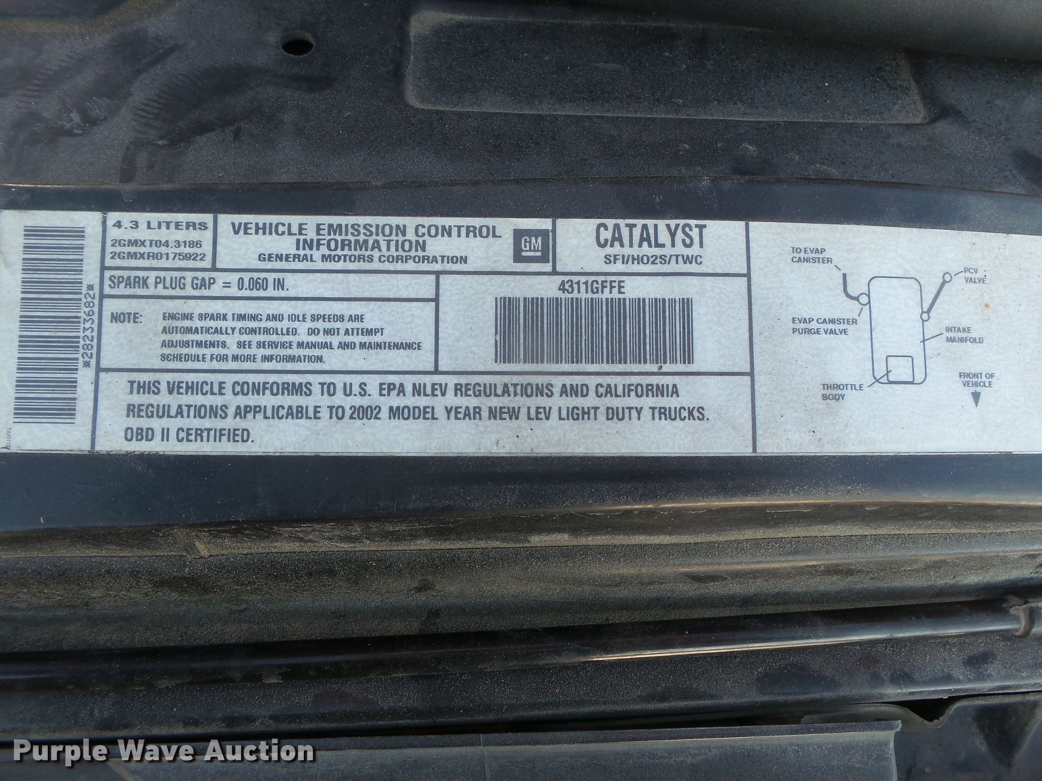 Purple Wave is selling a used Compact Pickup or Van in Missouri. This item is a 2002 Chevrolet S10 pickup truck with the following: 155,464 miles on odometer, 4.3L V6 OHV 12V gas engine, Automatic transmission, AC and heat, 215/75R15 tires, Service engine soon light on, Airbag light on, ABS light on