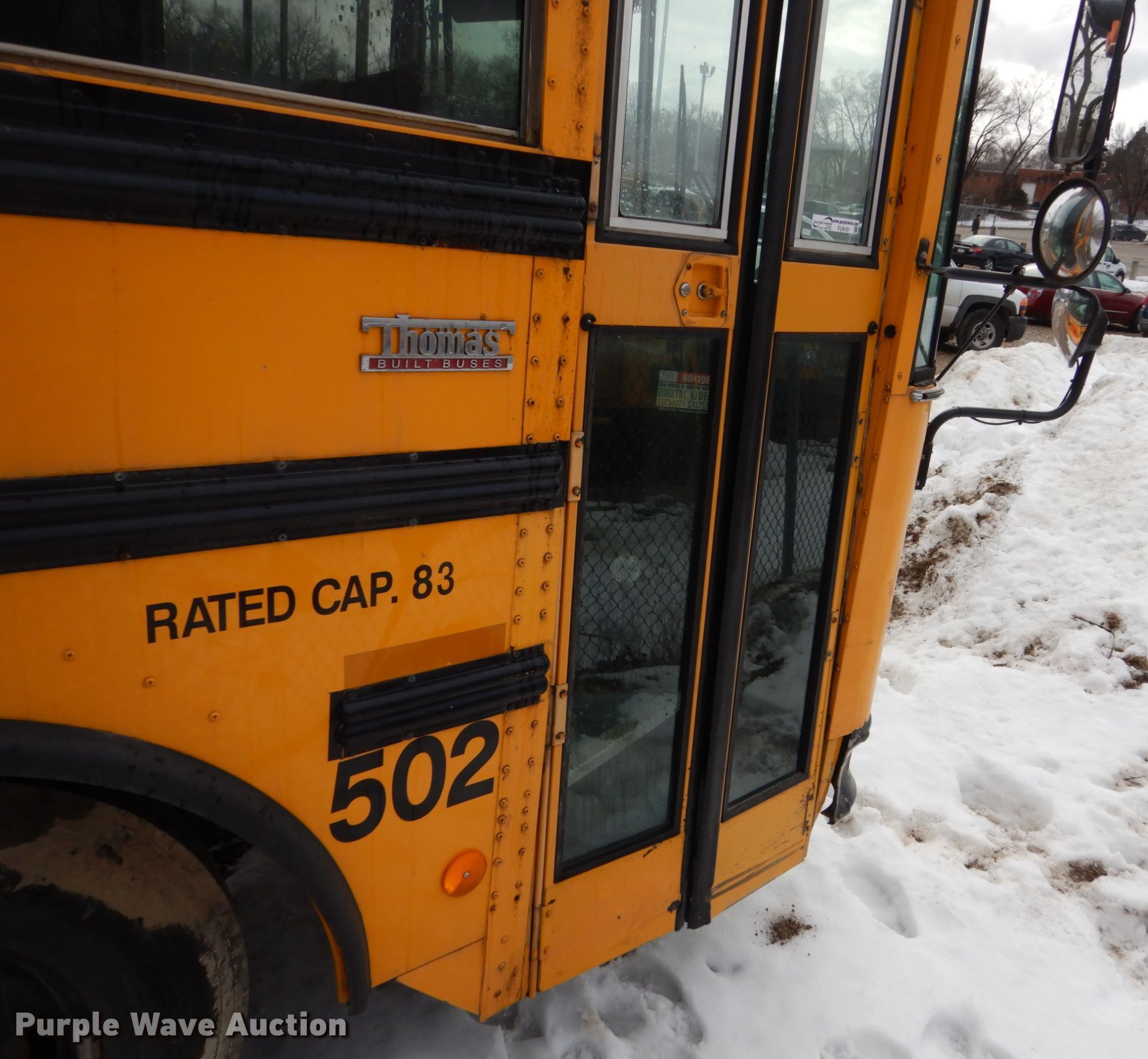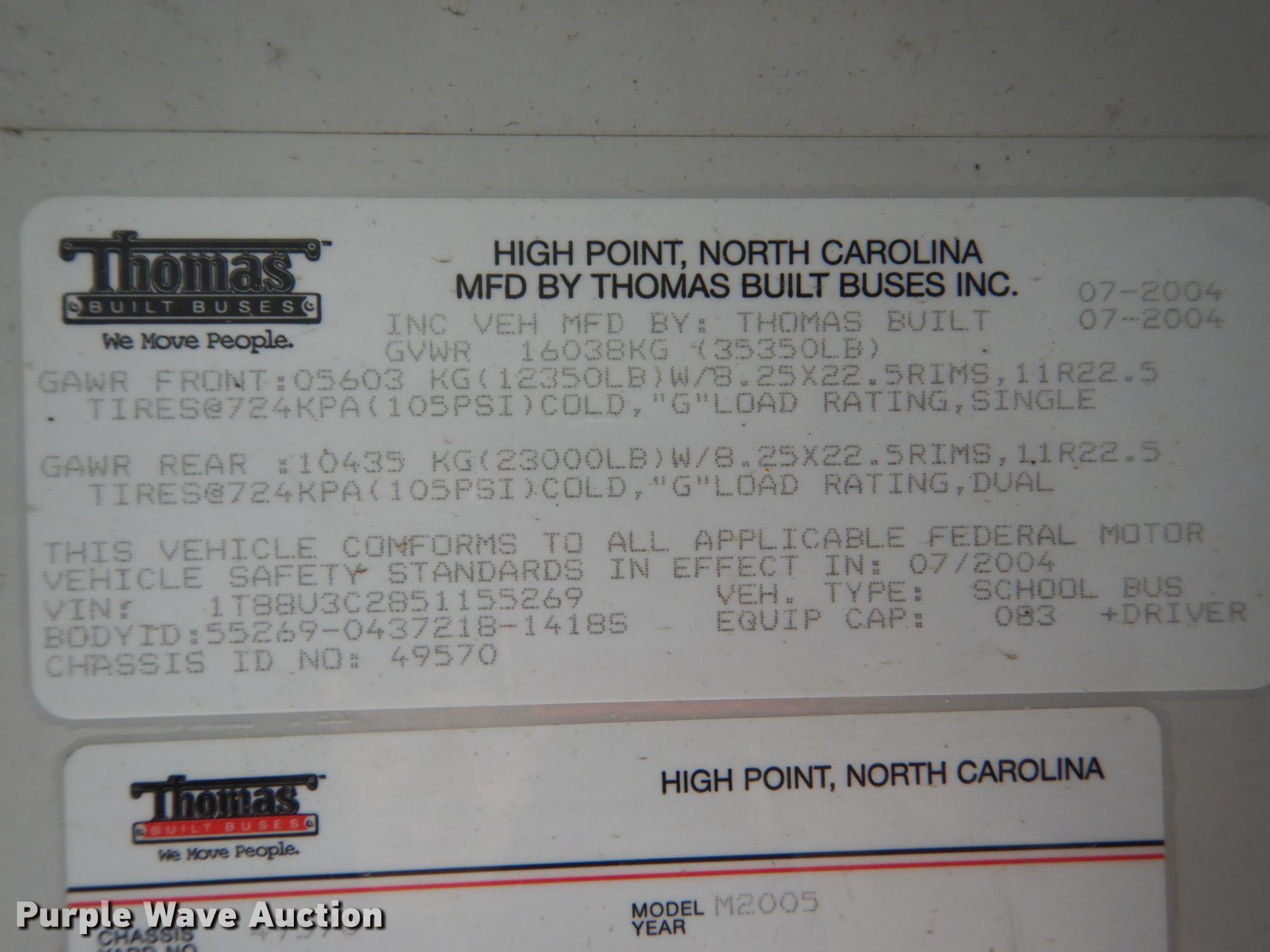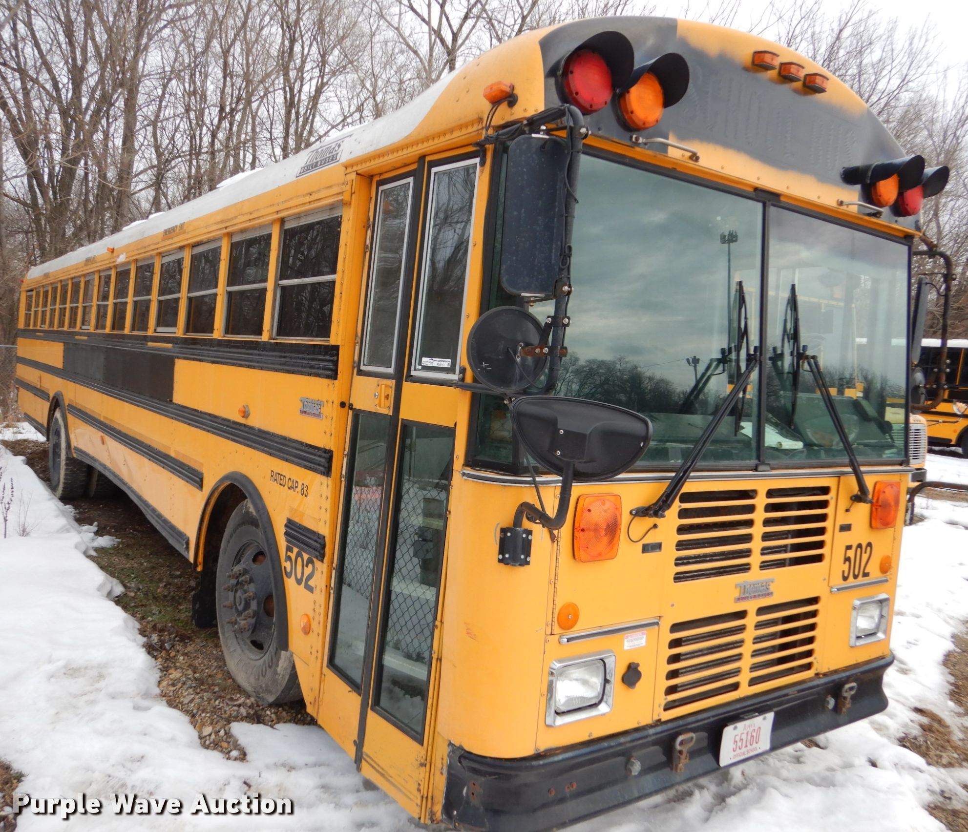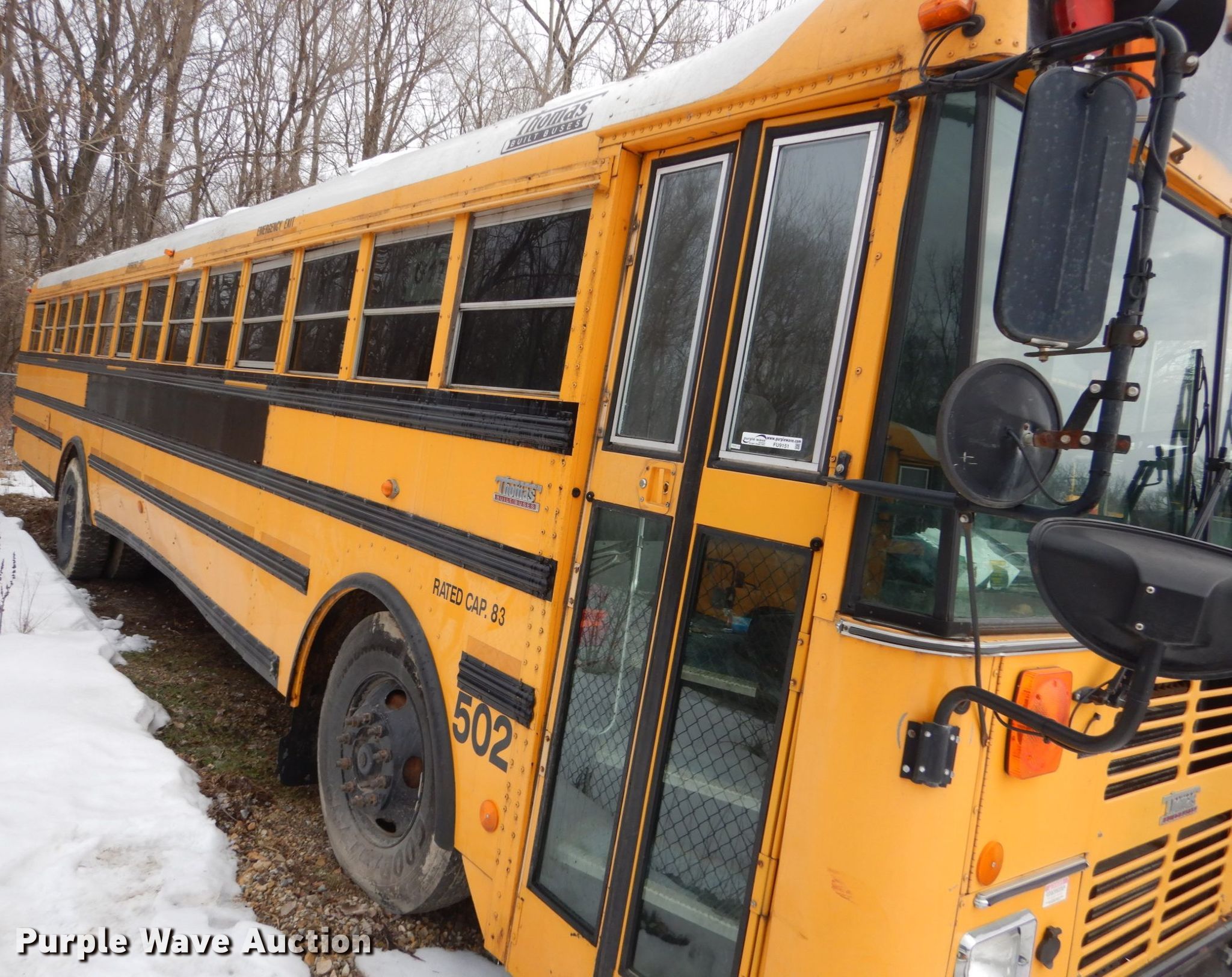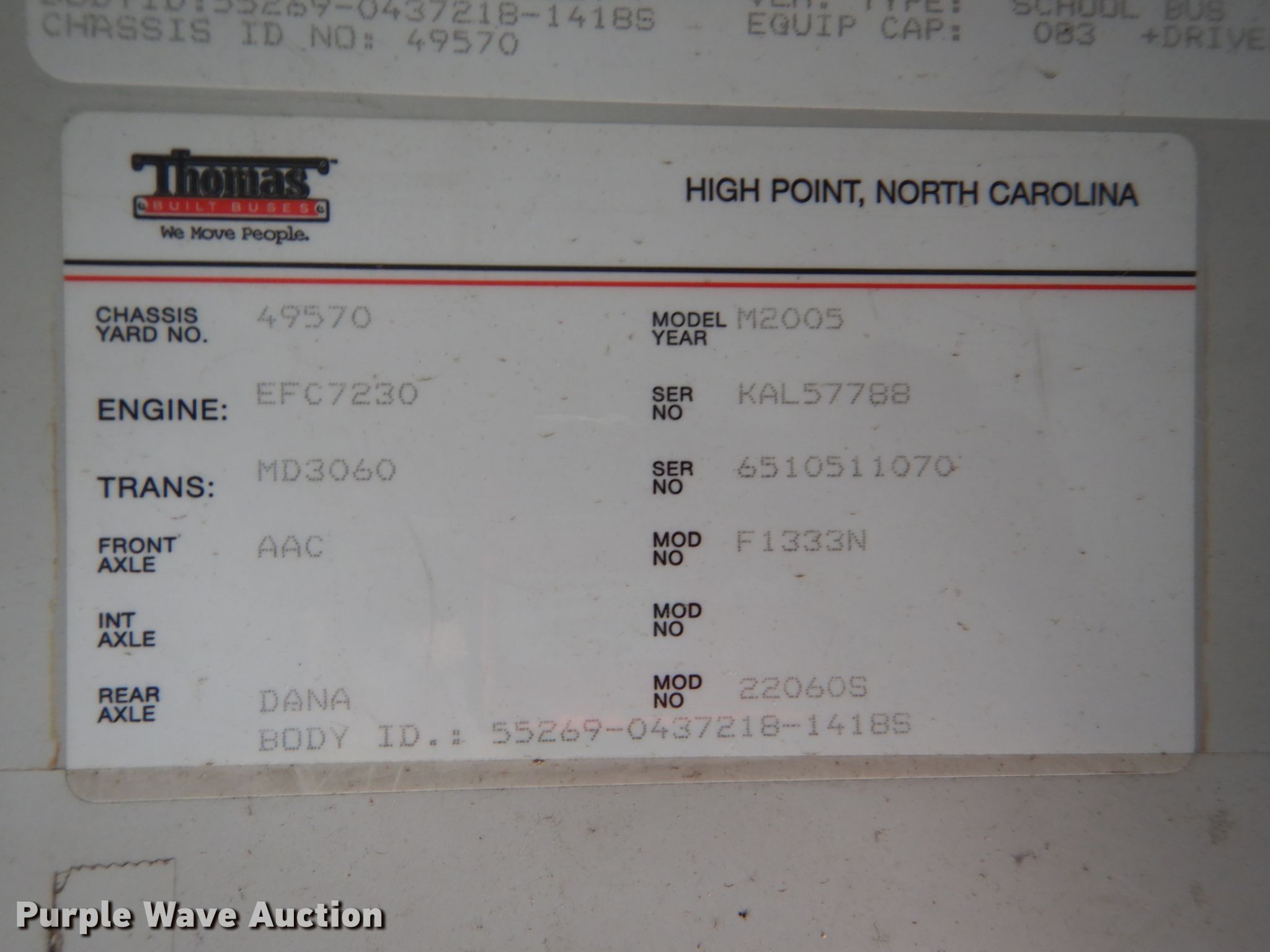 Purple Wave is selling a used Bus in Iowa. This item is a 2005 Thomas Built MD3060 school bus with the following: 47,617 miles on odometer, 15,423 hours on meter, Caterpillar C7 7.2L L6 diesel engine, Automatic transmission, Single axle, AC and heat, Electric passenger sliding door, 83 passenger capacity, (28) adult seats, Air suspension, Air brakes, 11R22.5 tires, GVWR 35,350 lbs, Unit# 502