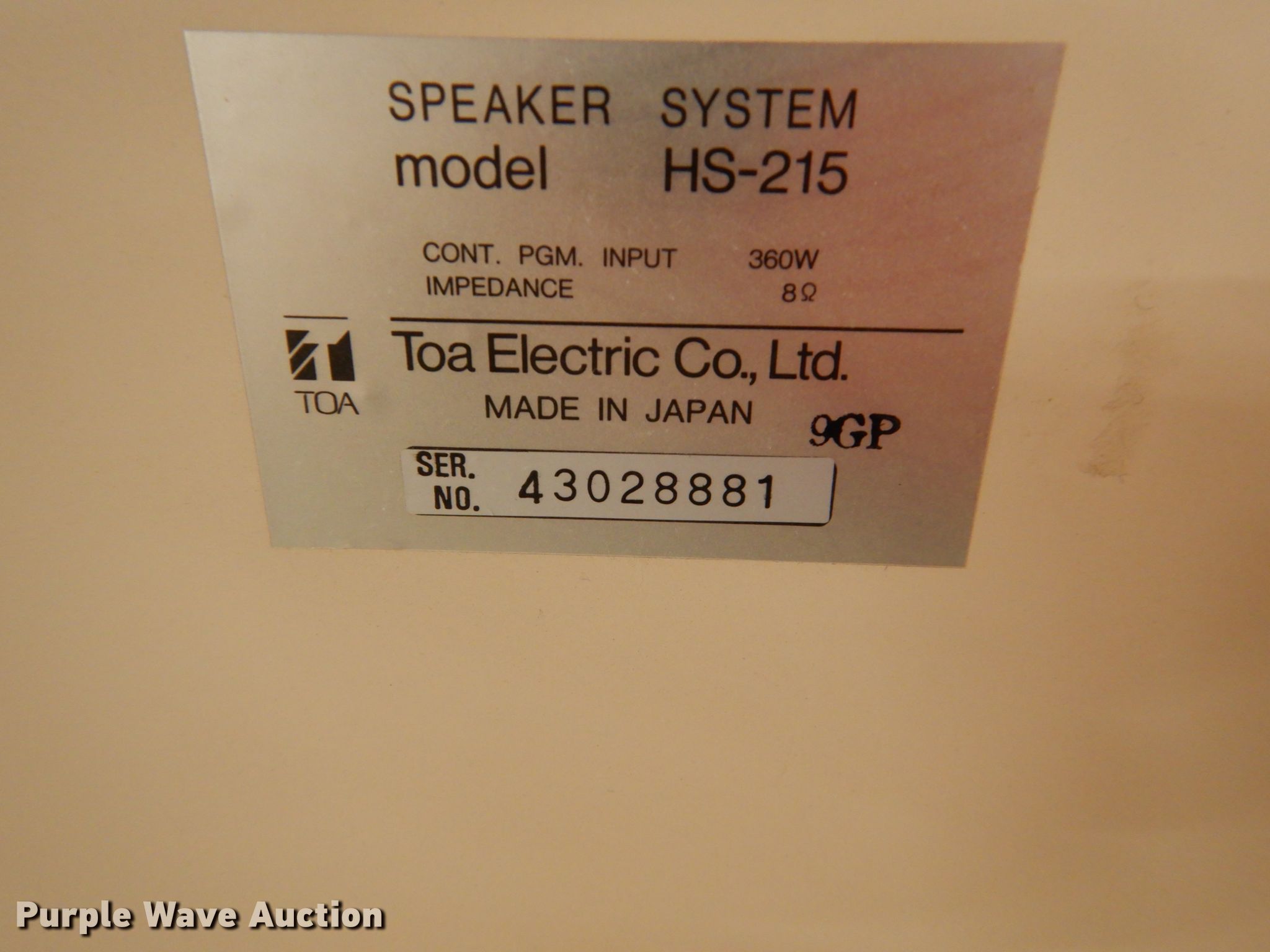 Purple Wave is selling a used Electronics in Iowa. This item is a Toa Electric Co HS-215 speaker with the following: Unknown operating condition