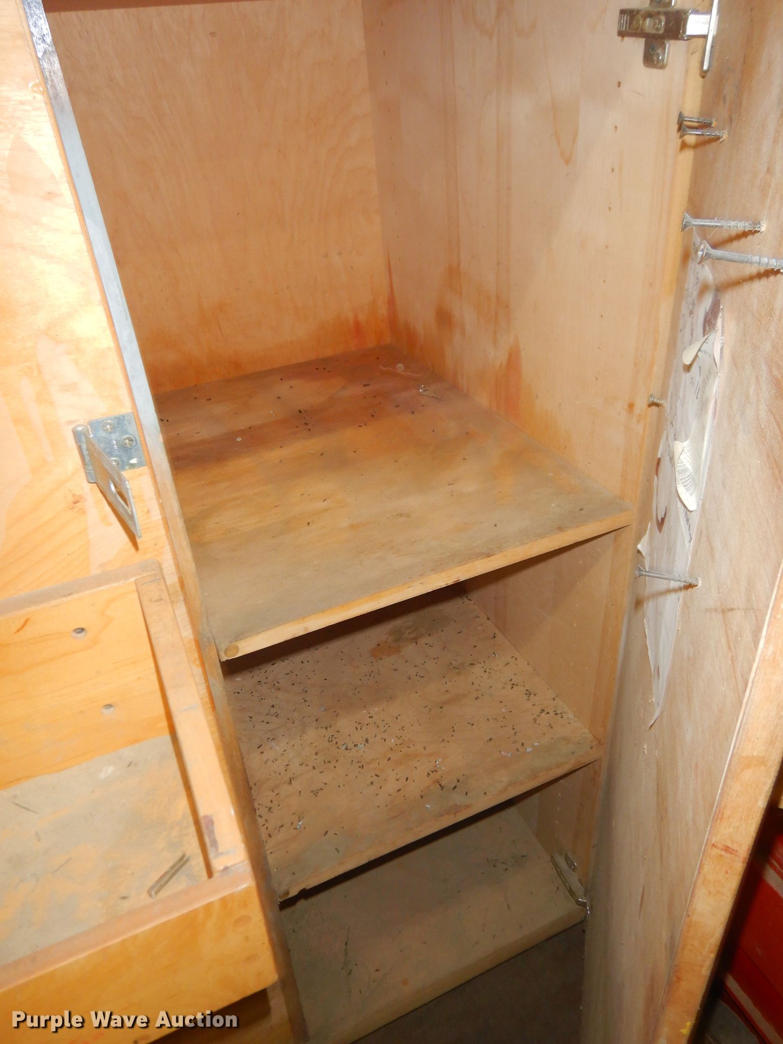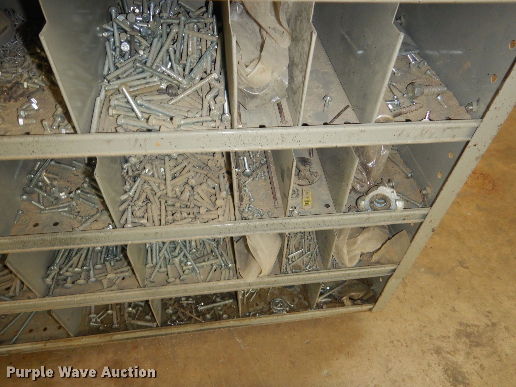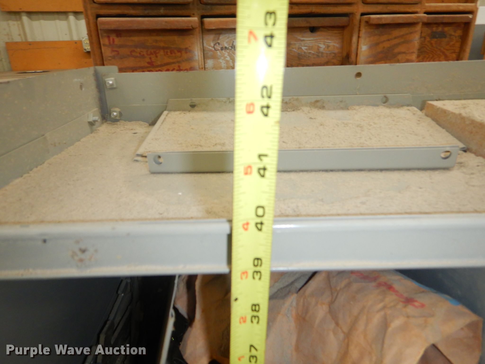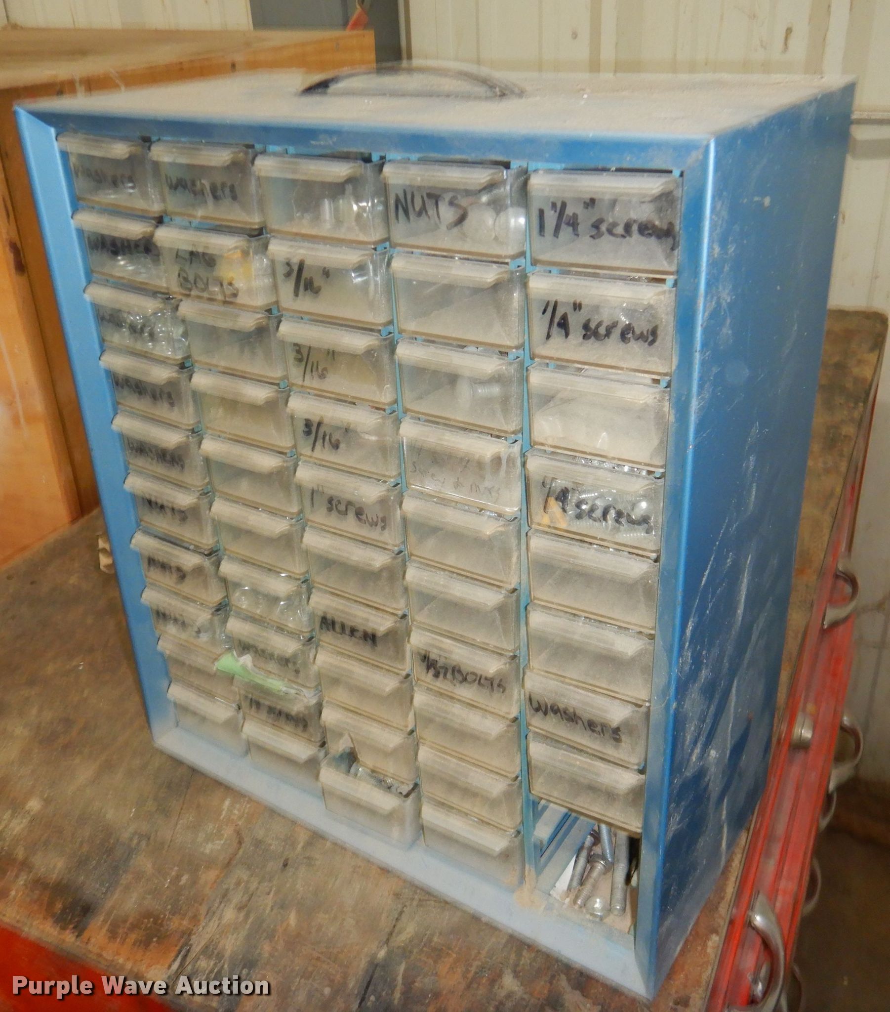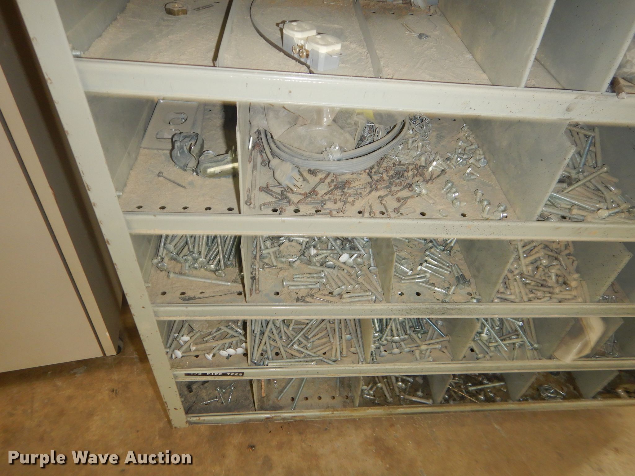 Purple Wave is selling a used Shelving and Storage in Kansas. This item is a Storage units with the following: Fluorescent light fixture, (4) additional bulbs, 6' x 2' x 43" wood cabinet, 2' x 45" seven drawer metal cabinet, Plastic cabinet, (45) drawers, One drawer missing, Wood cabinet, 2' x 3' x 51", (4) shelves, Lockable, Wood cabinet, 39" x 20" x 57", (24) drawers, Metal bin cabinet, 3' x 40", Assorted nuts and bolts, (5) trash containers, 20" x 20" x 41"