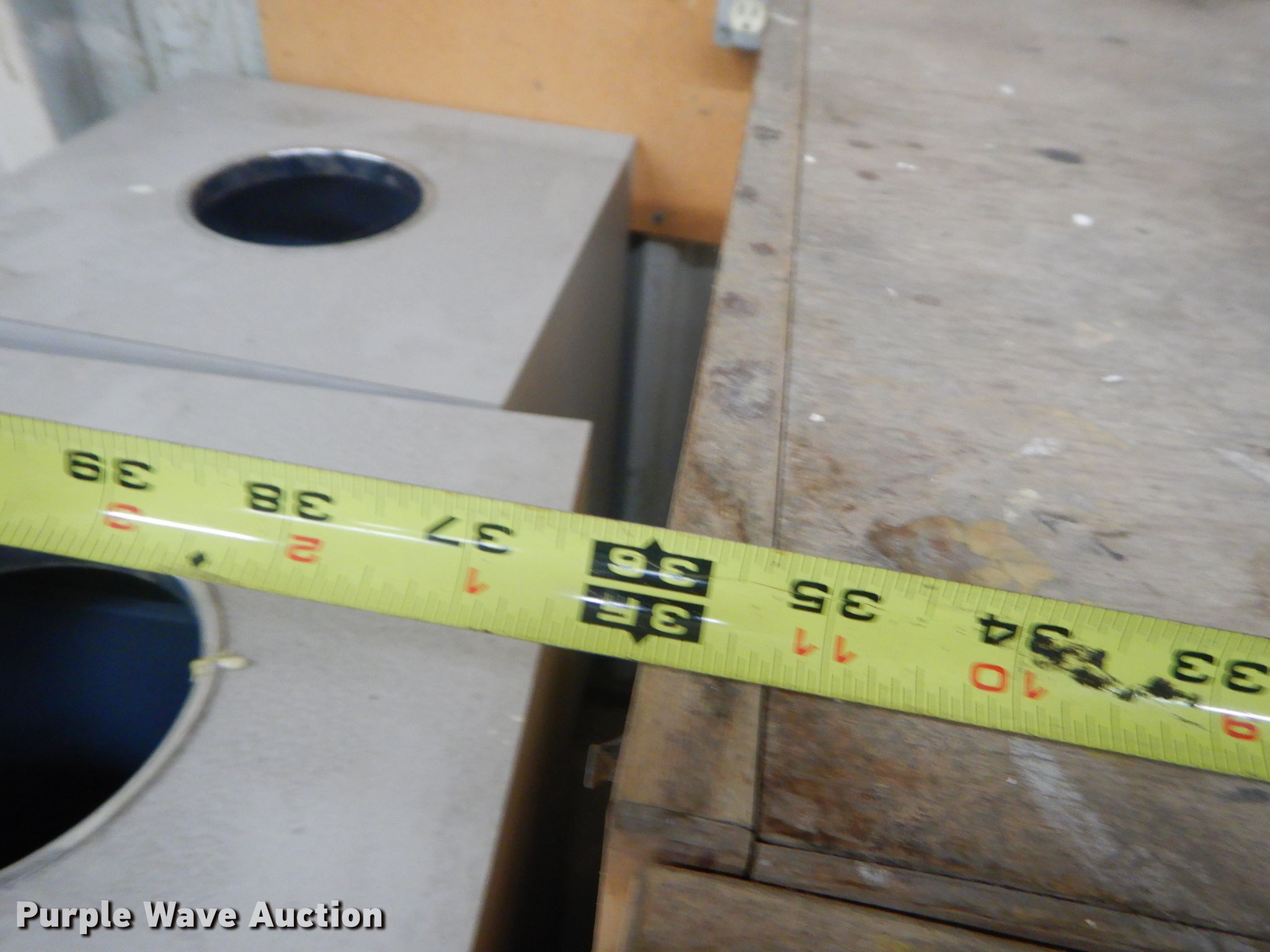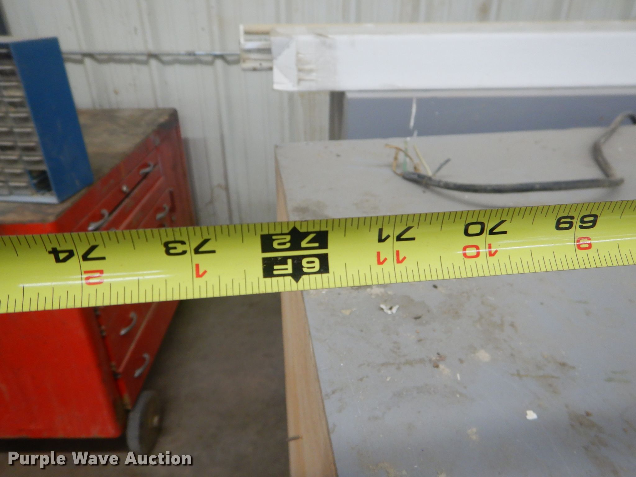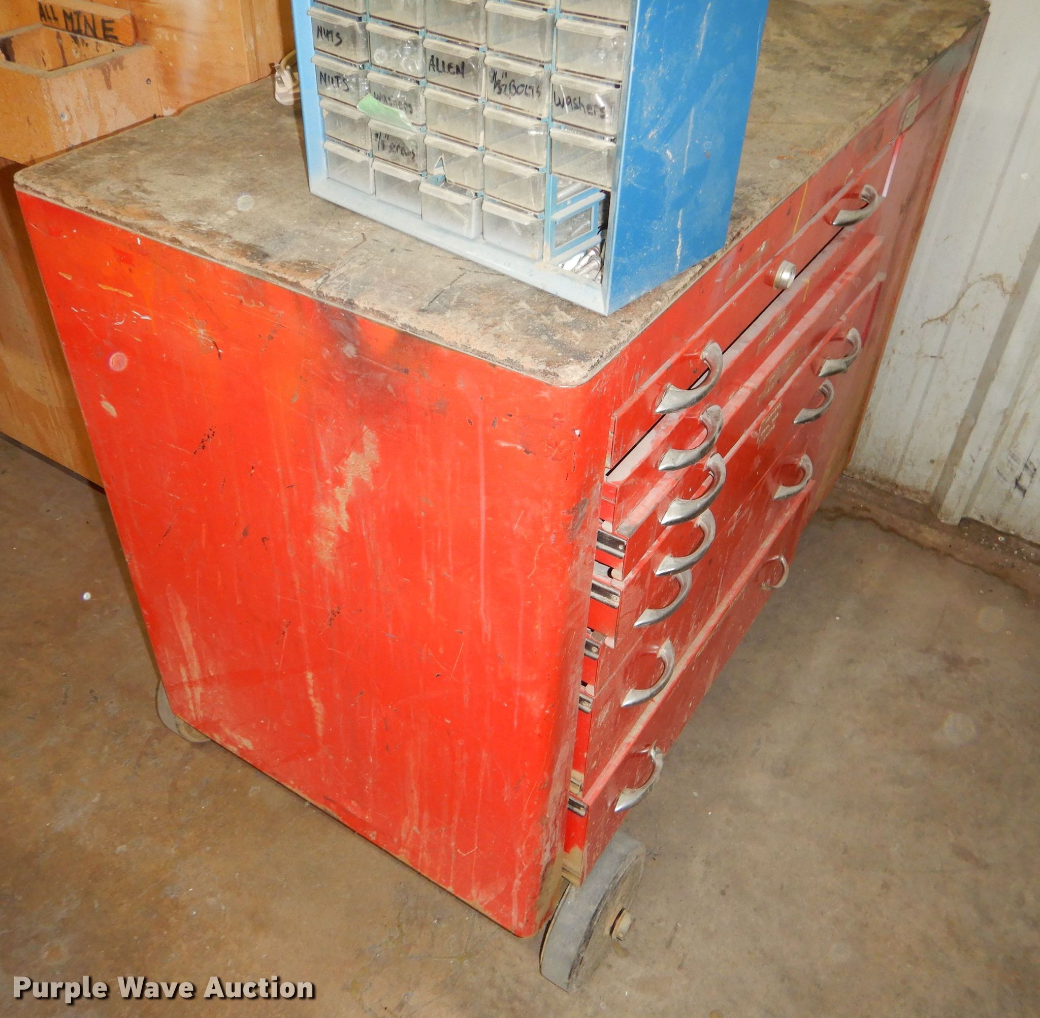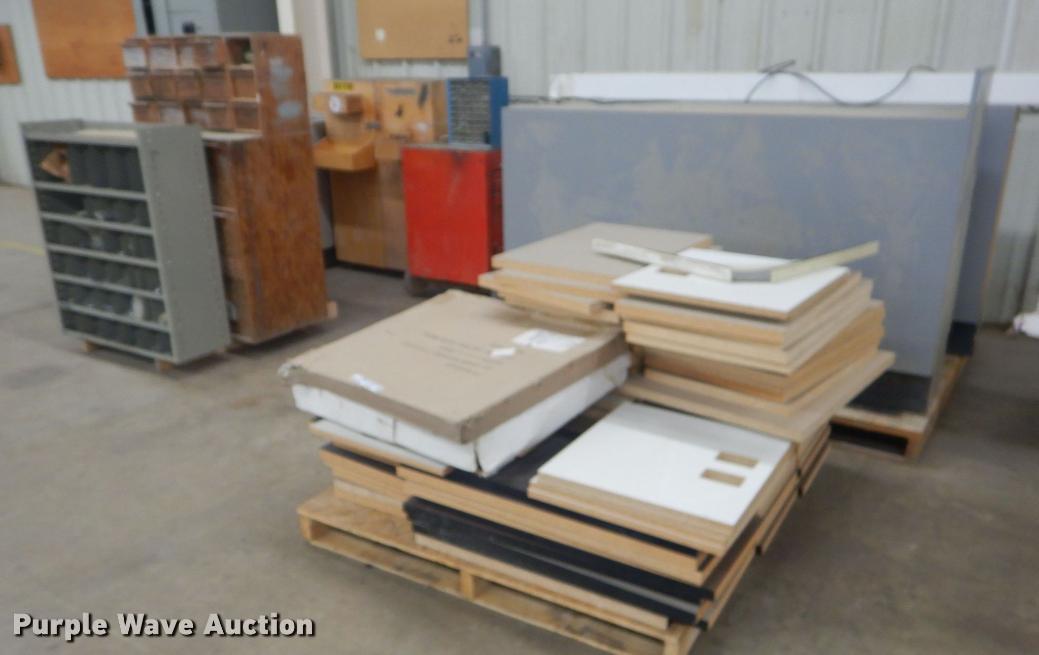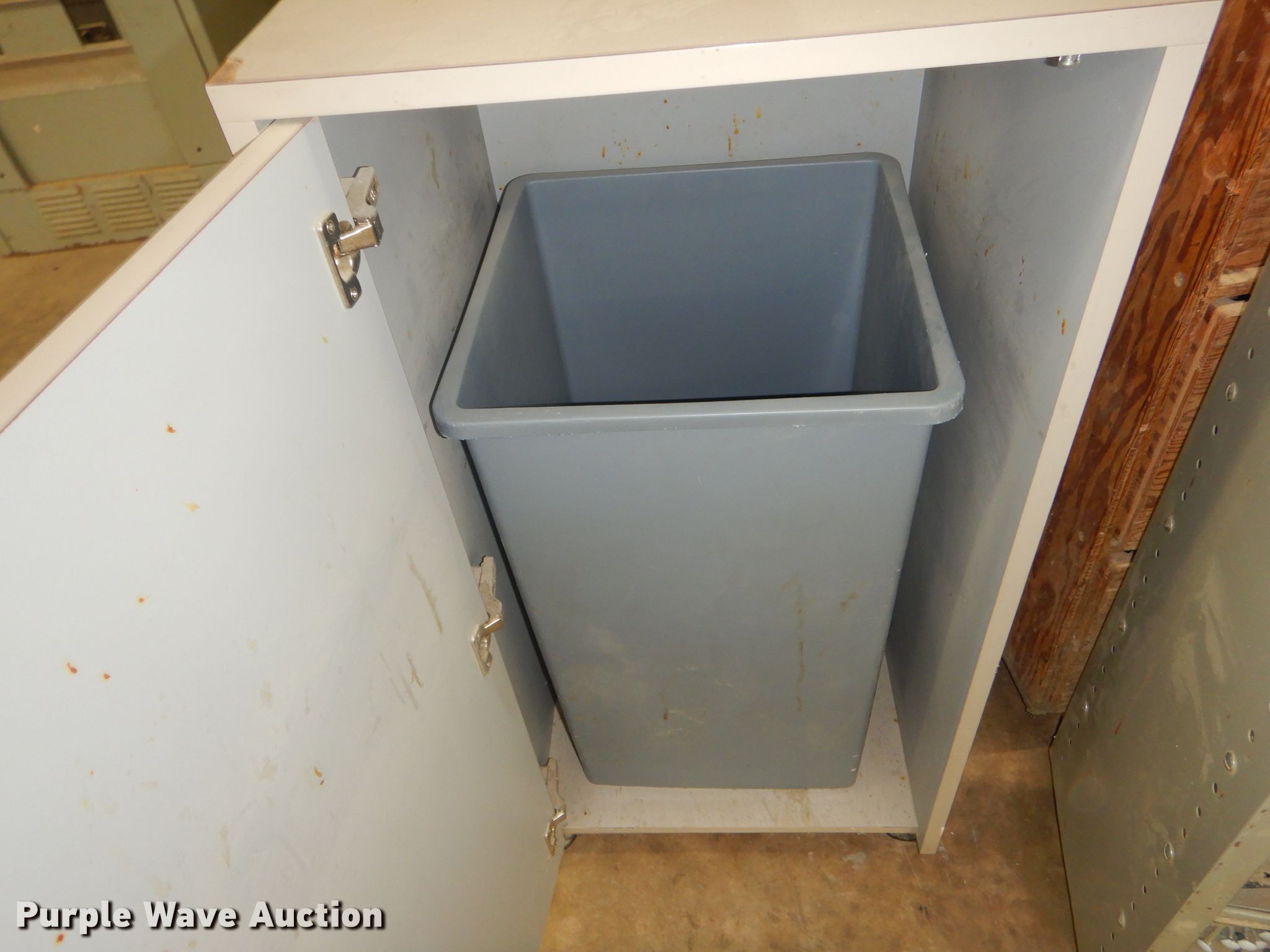 Purple Wave is selling a used Shelving and Storage in Kansas. This item is a Storage units with the following: Fluorescent light fixture, (4) additional bulbs, 6' x 2' x 43" wood cabinet, 2' x 45" seven drawer metal cabinet, Plastic cabinet, (45) drawers, One drawer missing, Wood cabinet, 2' x 3' x 51", (4) shelves, Lockable, Wood cabinet, 39" x 20" x 57", (24) drawers, Metal bin cabinet, 3' x 40", Assorted nuts and bolts, (5) trash containers, 20" x 20" x 41"