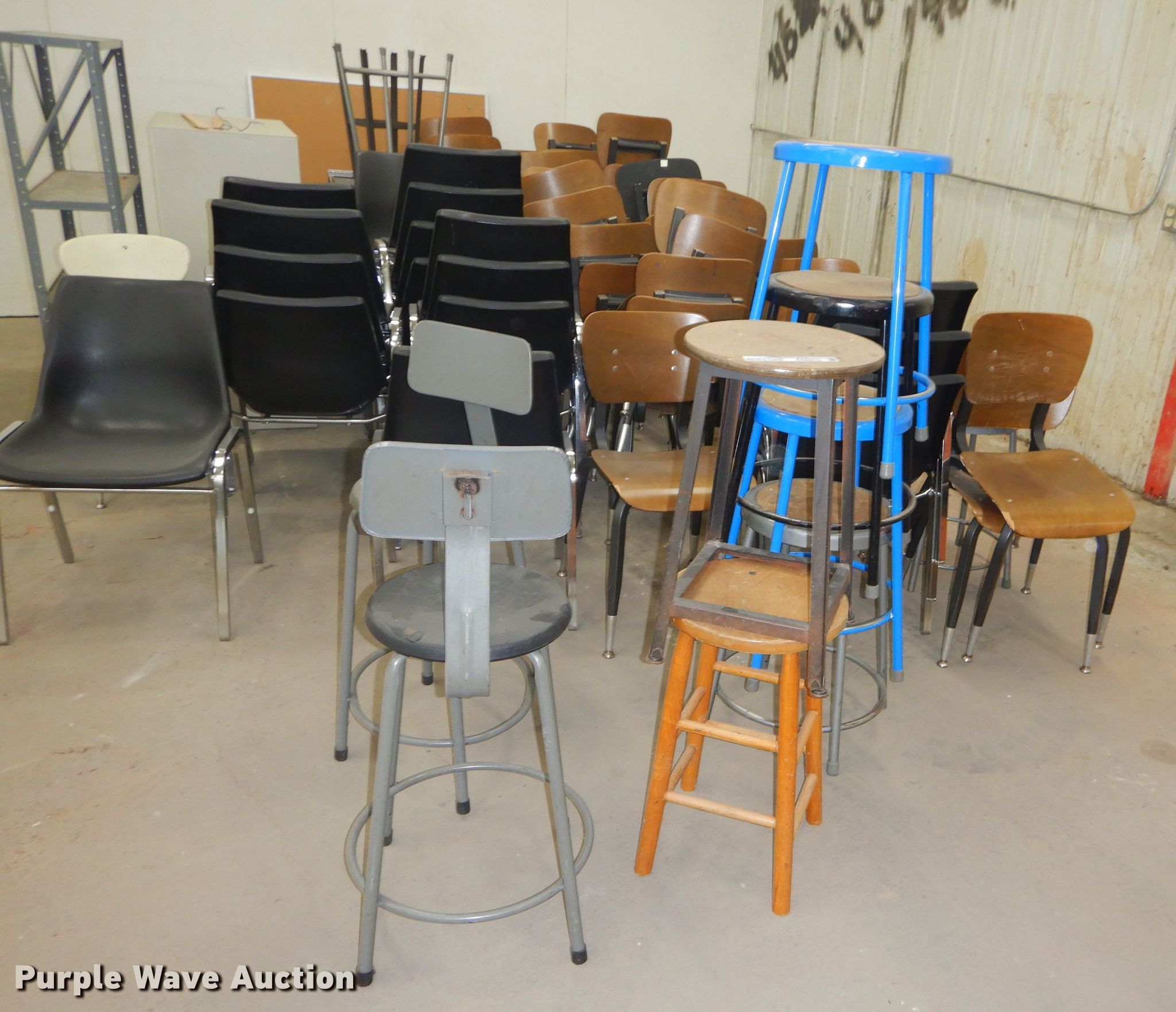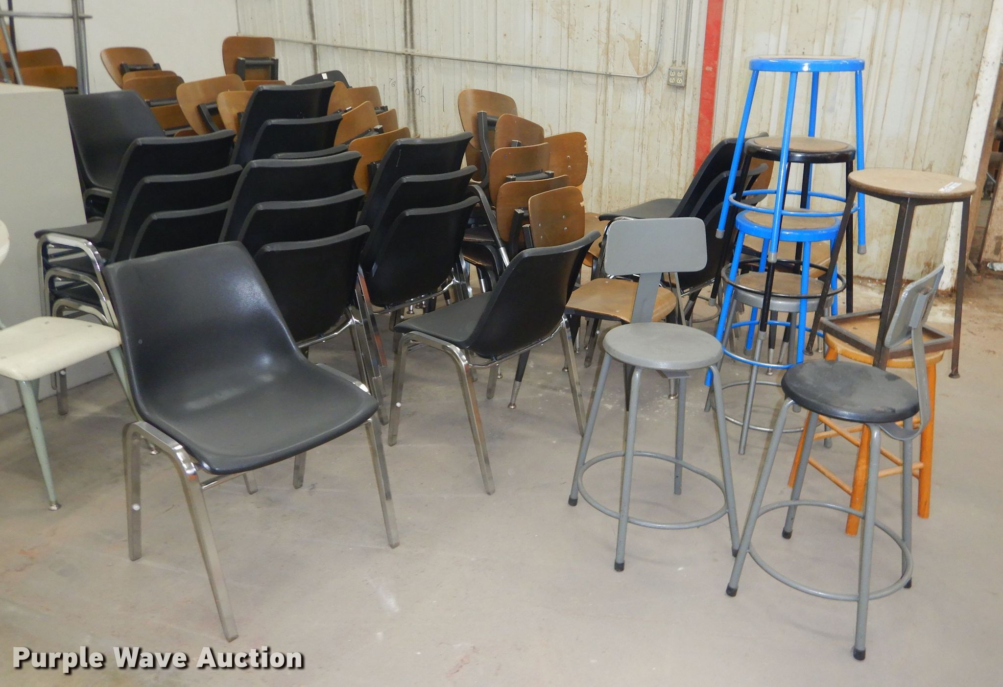 Purple Wave is selling a used Furniture in Kansas. This item is a Approximately 58 chairs and stools with the following: Approximately 58 chairs and stools. Neosho Community College. 800 W 14th St. Chanute, KS 66720