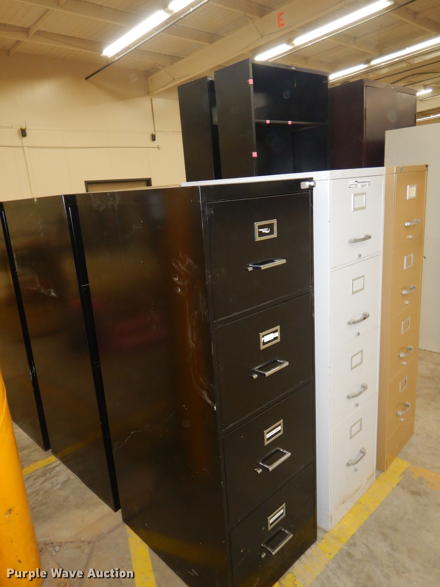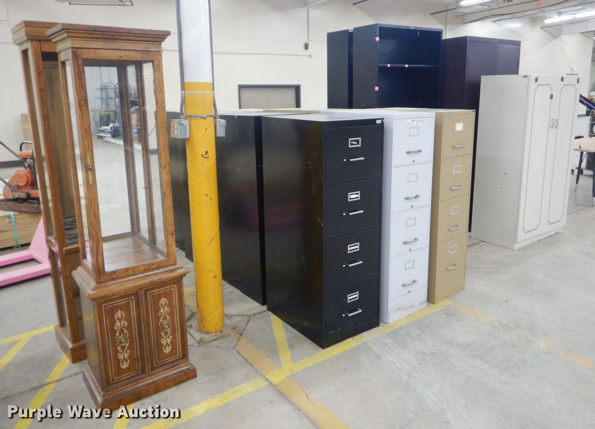 Purple Wave is selling a used Furniture in Kansas. This item is a Furniture with the following: (2) Curio cabinets, (9) filing cabinets, (5) shelves, Metal cabinet